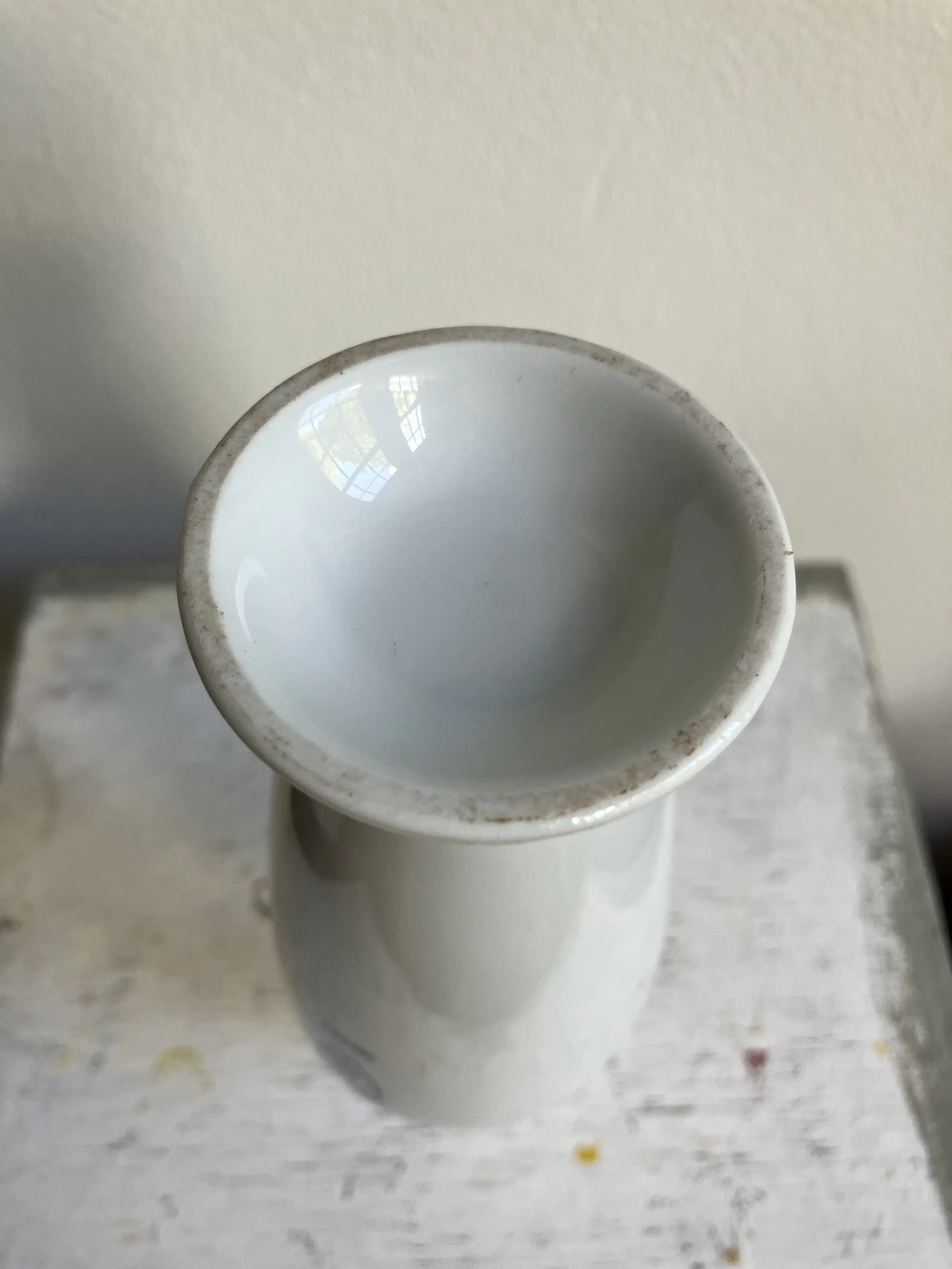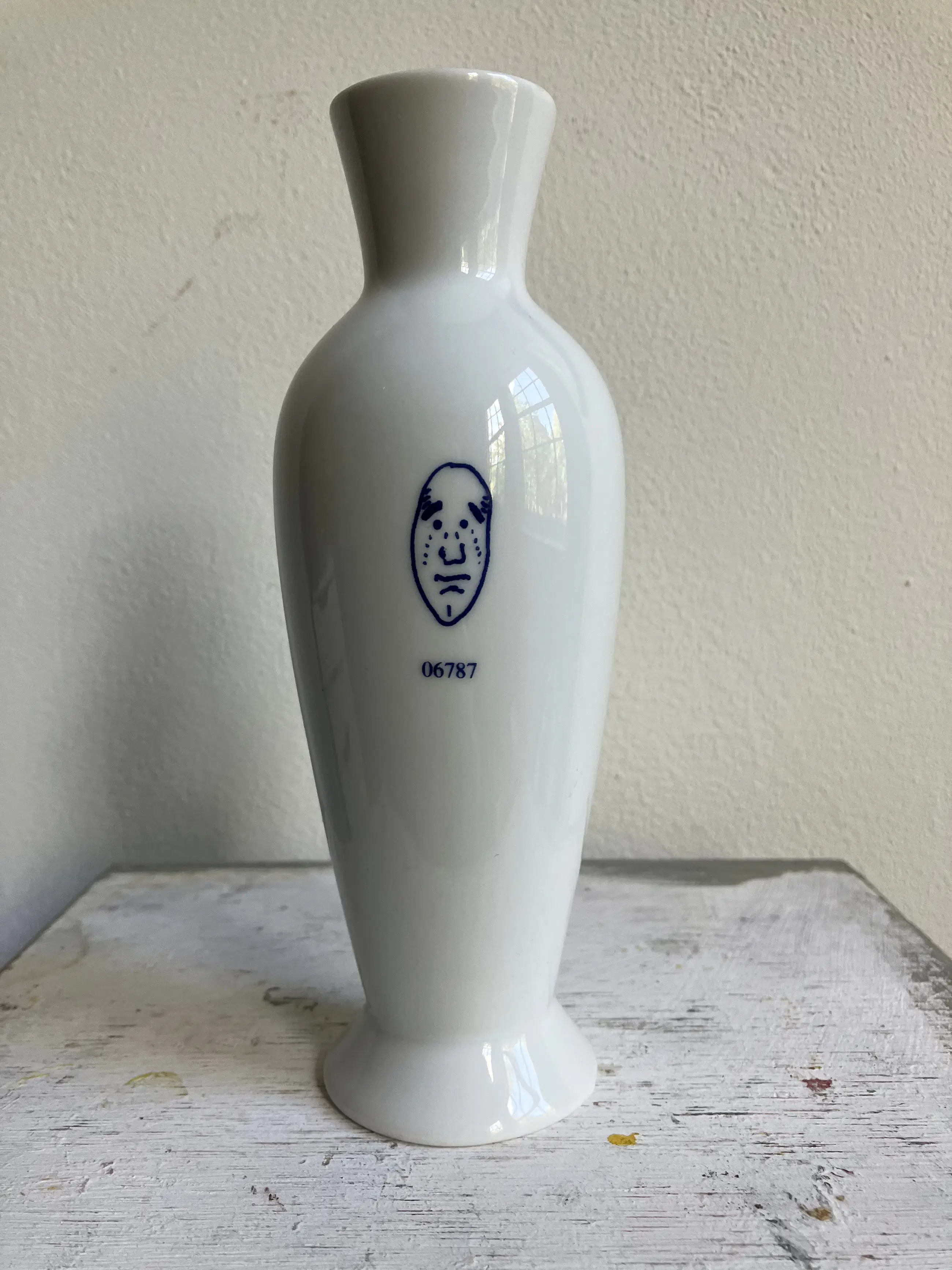 Kleine weiße Porzellanvase mit kleinen blauen „Gesichtern“, entworfen von Andrea Branzi und im Jahr 2000 von Alessi veröffentlicht.