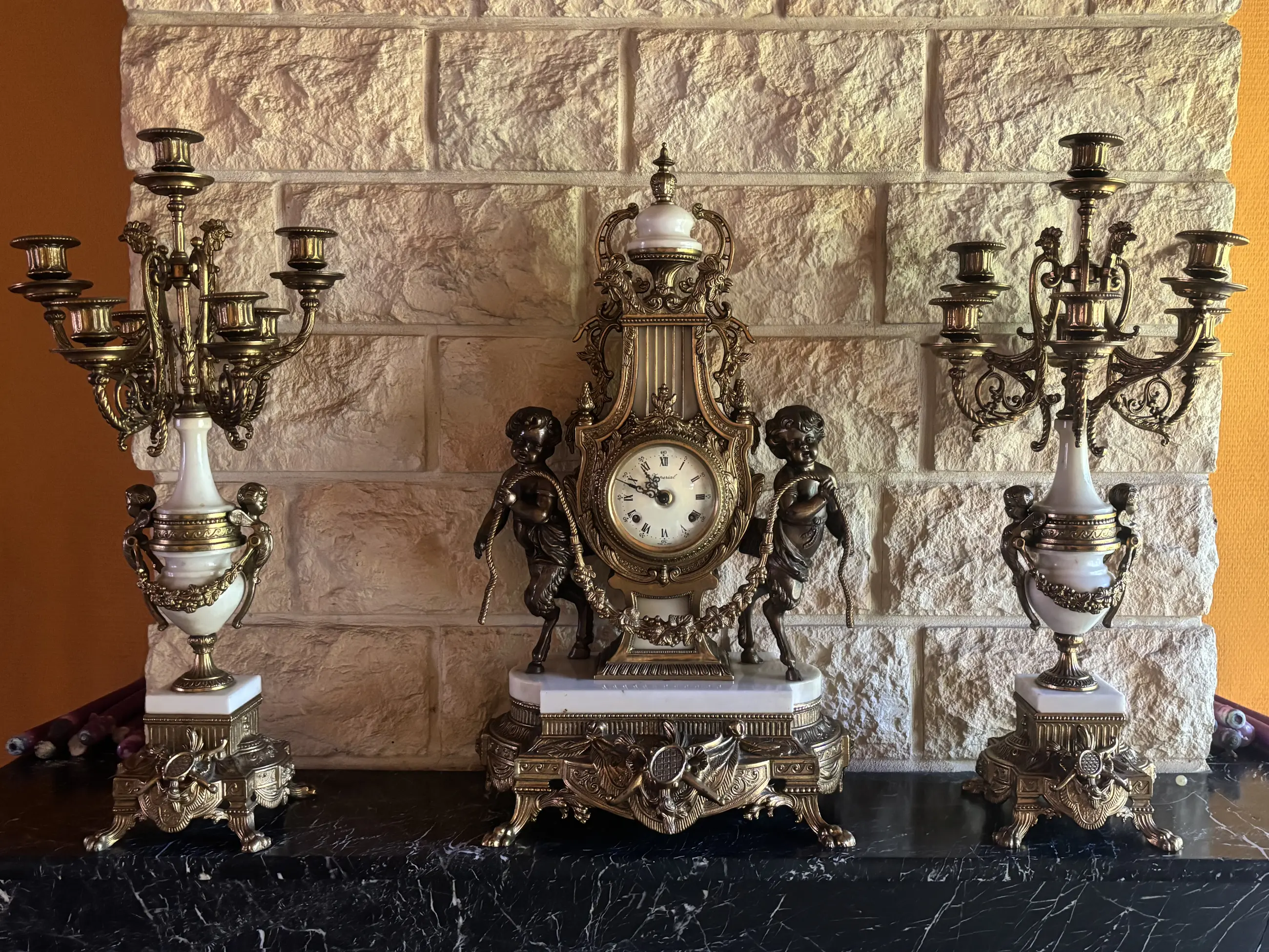 Brevettato - Antike italienische Ormolu-Kaminuhr mit Engeln und passenden Kerzenleuchtern