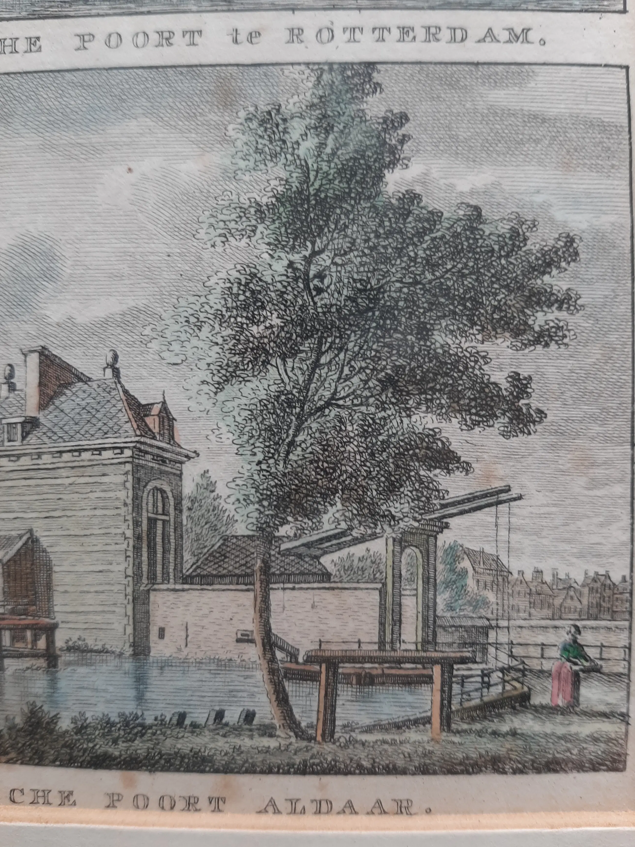 Schiedamsche Poort in Rotterdam./ Goudsche Poort dort. Zwei Gesichter auf einem Blatt. Kupferstich von Carel Frederik Bendorp. Illustrator: Jan Bulthuis. In schönem Rahmen mit schönem Passepartout. Damals handkoloriert. In sehr gutem Zustand.