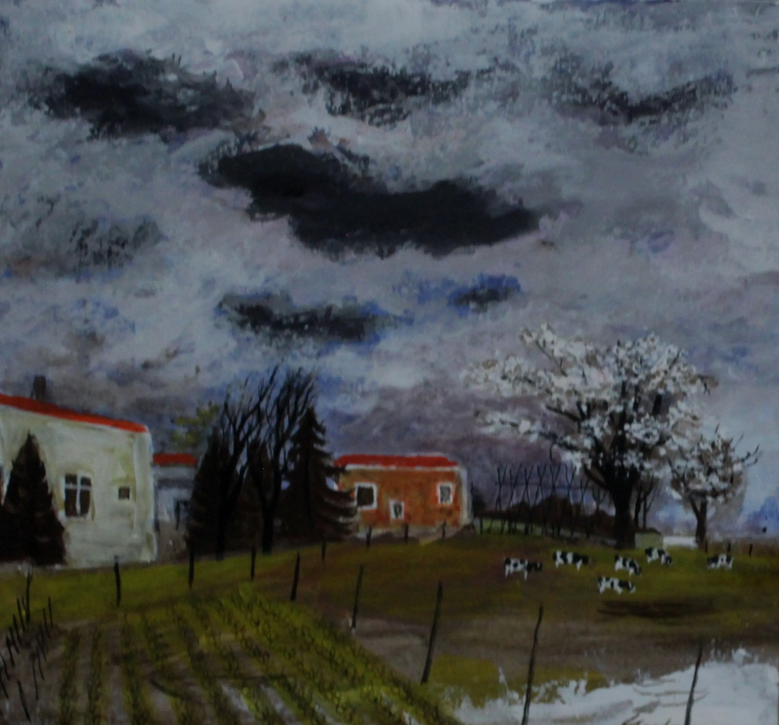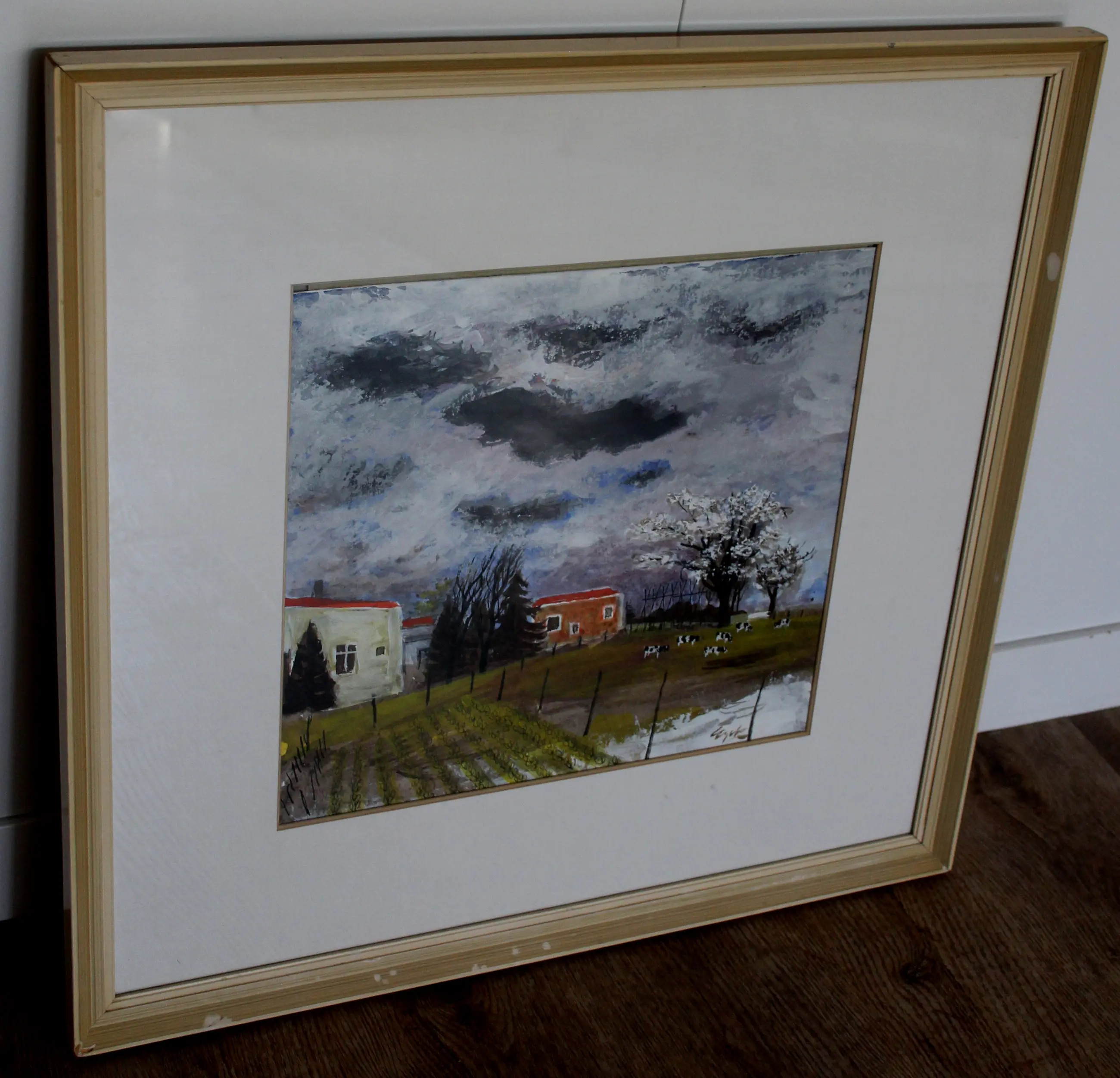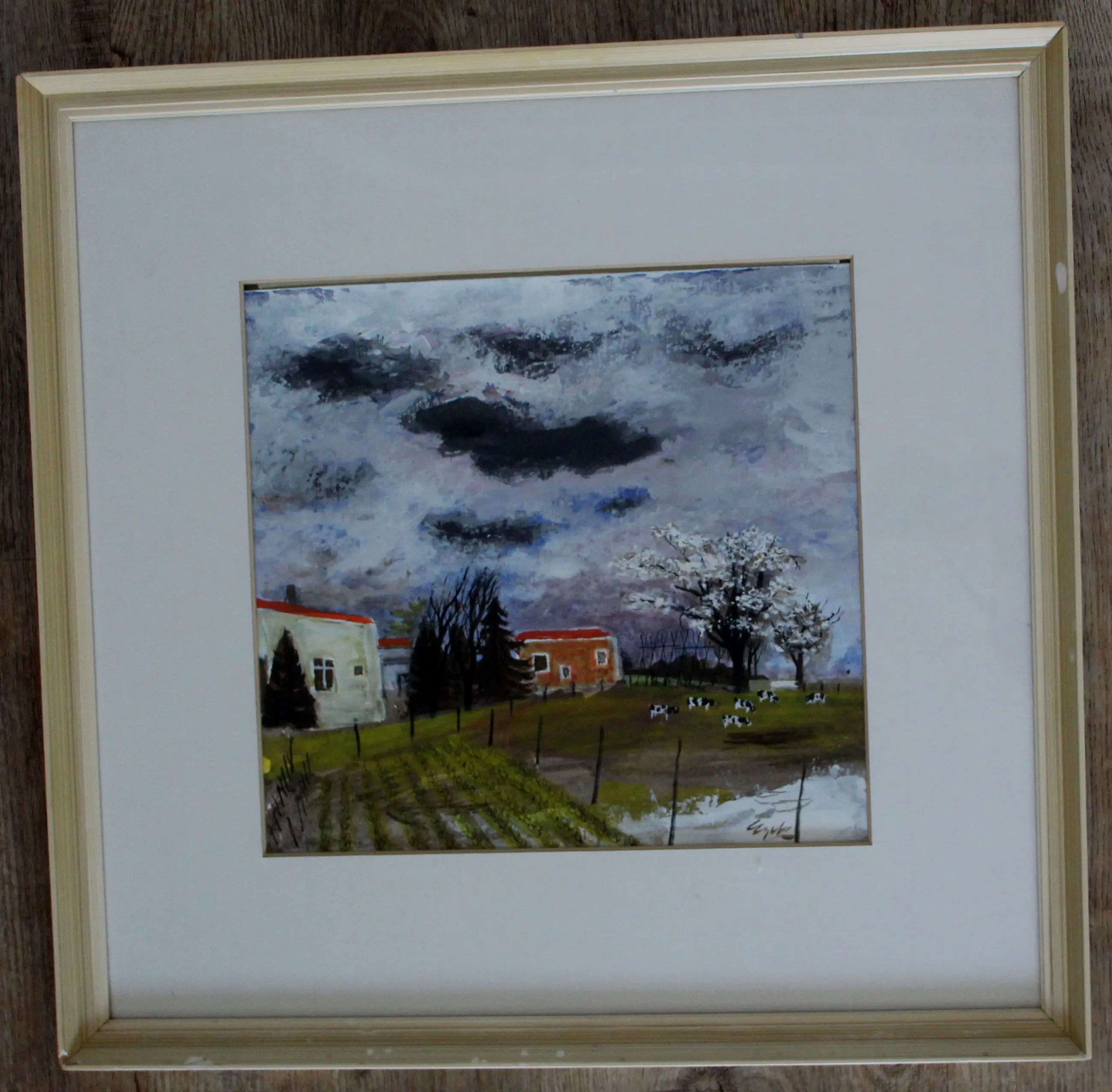 Gerahmtes Gemälde (Acryl/Gouache) von Charles Eyck. Titel: Weißes Haus mit Gemüsegarten und Kühen. Maße inkl. Rahmen: H 56 x B 58 cm. Maße des Bildes: H 32 x B 34 cm. Das Werk ist unten rechts vom Künstler signiert. Die Echtheit des angebotenen Werkes wird vollständig garantiert. Ein Echtheitszertifikat kann auf Anfrage per E-Mail zugesandt werden.