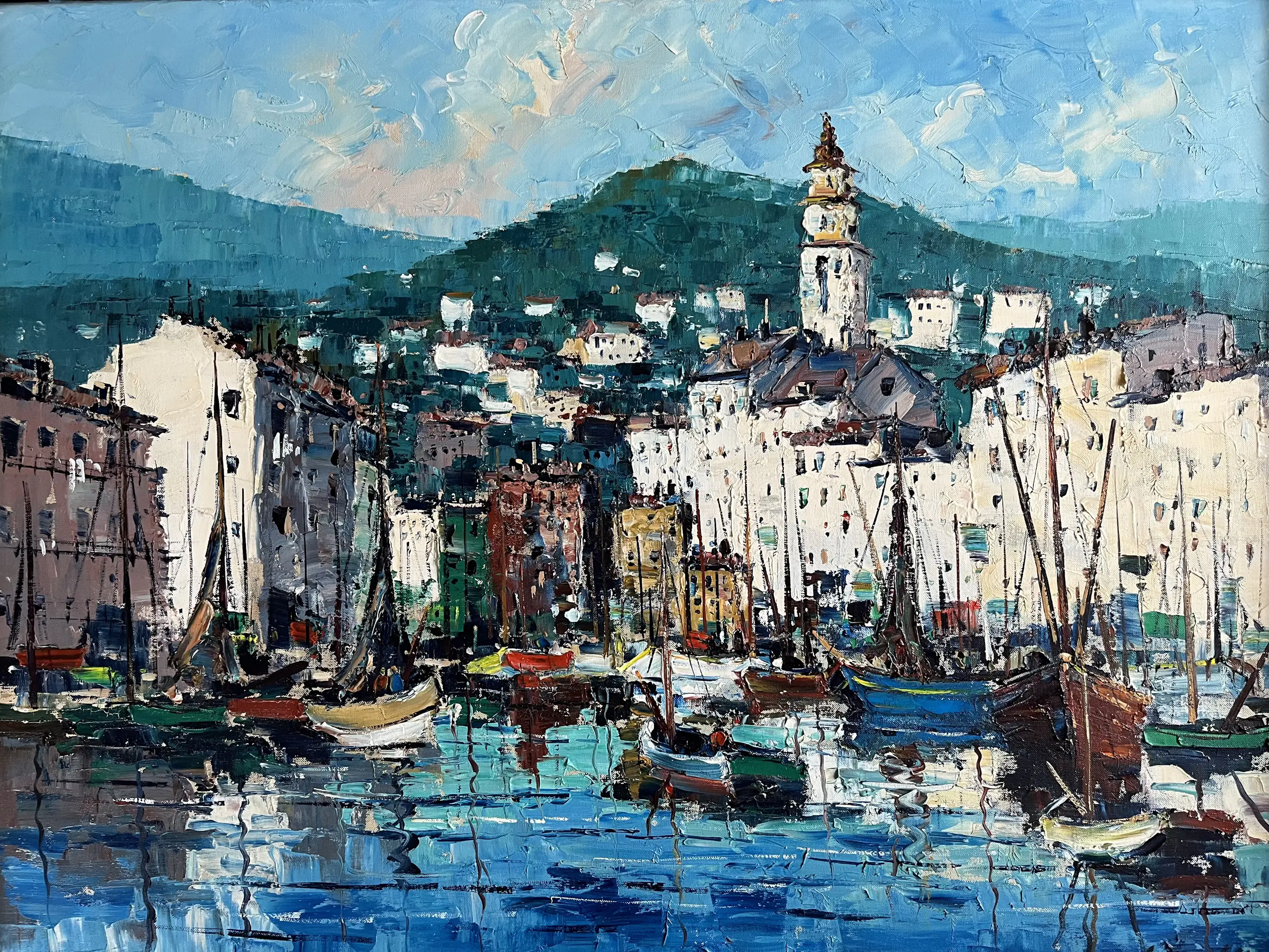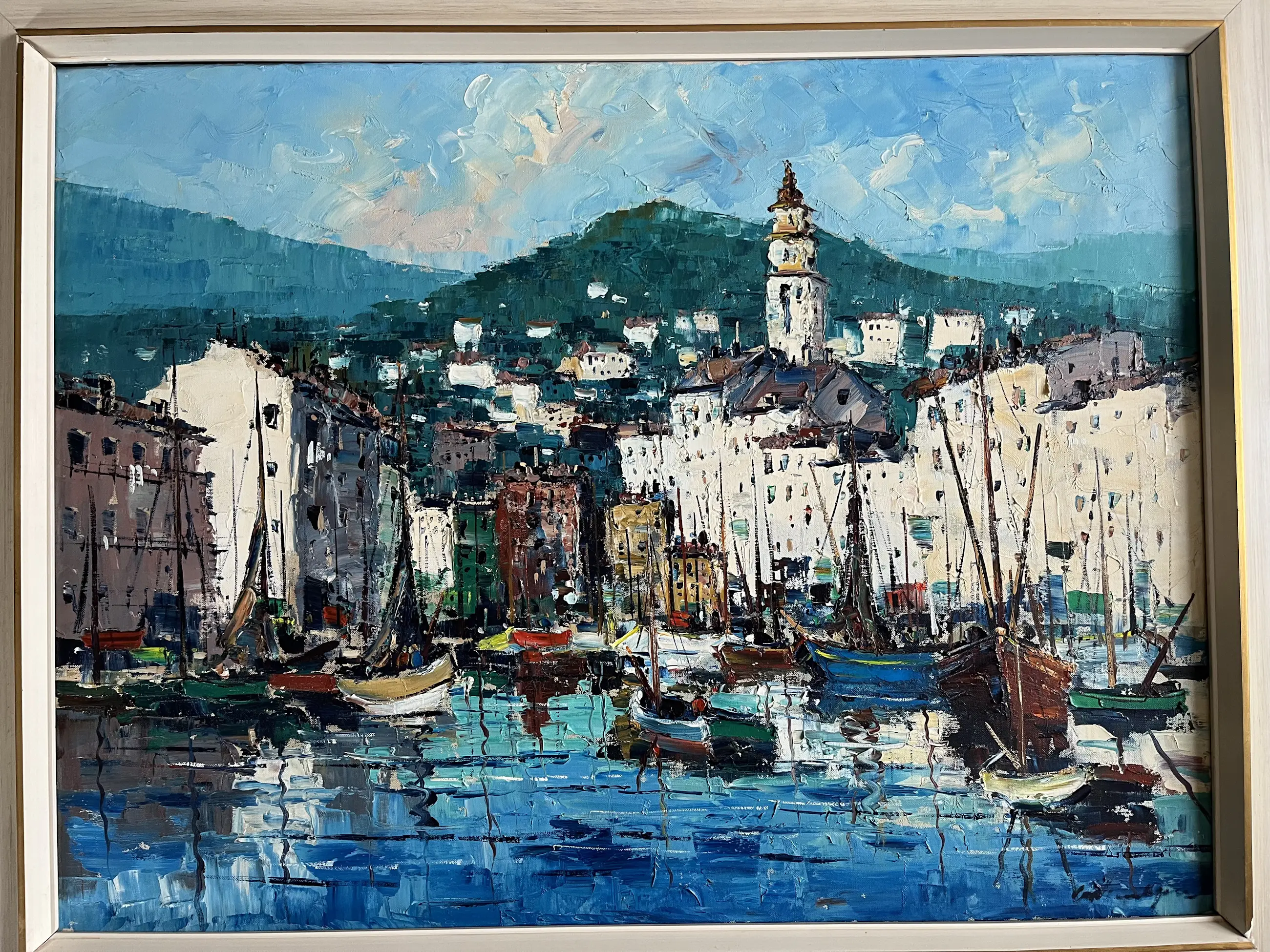 Farbenfrohe und stimmungsvolle südeuropäische Szene. Das Werk ist in einem Rahmen gerahmt, der ausgetauscht werden muss. Das Gemälde ist zudem etwas im Rahmen durchgehangen. Der Rahmen passt oben nicht mehr über das Werk. Bildgröße 58 x 78 cm. Inklusive Rahmen 74 x 93 cm.