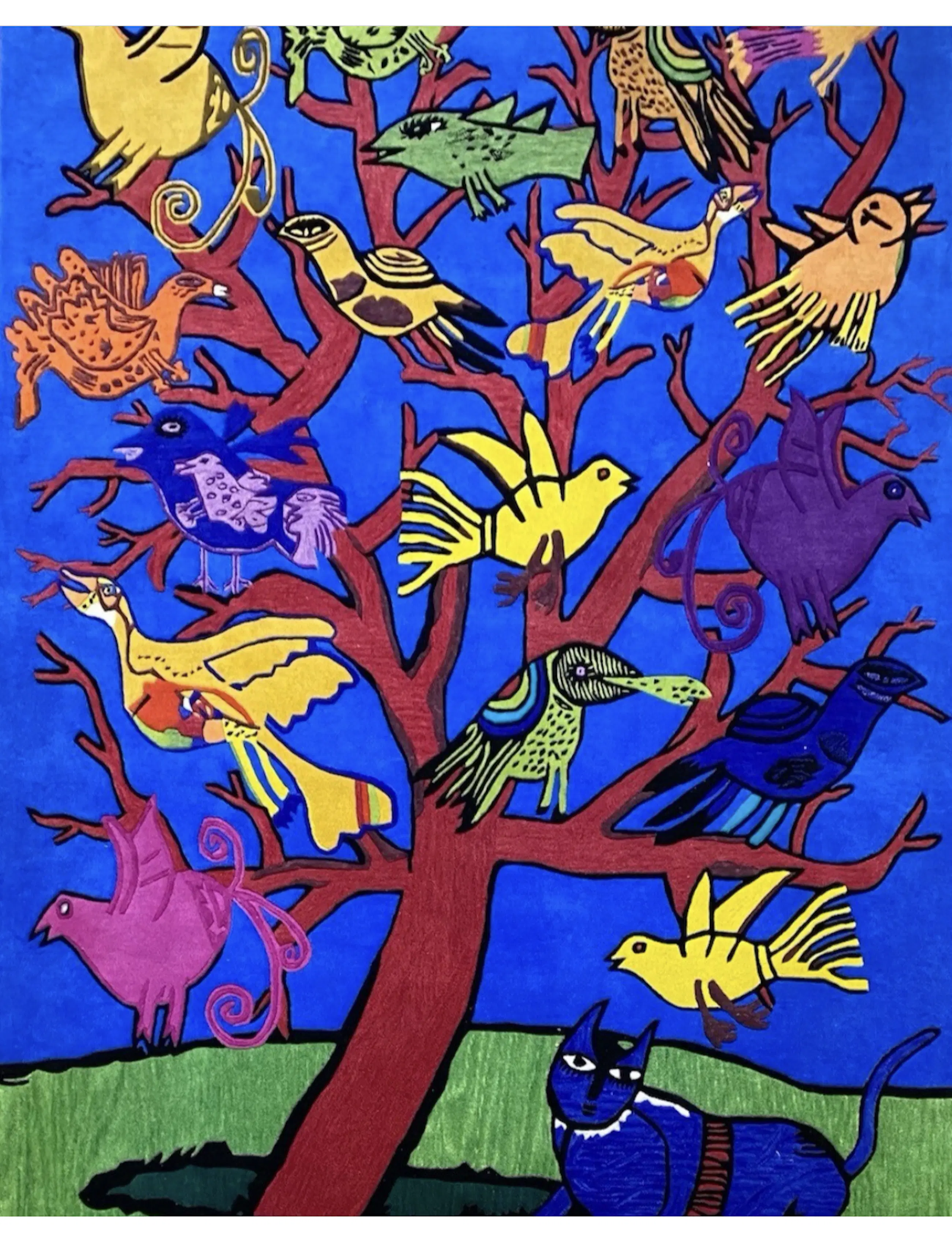 „L'arbre aux oiseaux“, handgefertigter Teppich, vollständig handgefertigt, aus 100 % reiner neuseeländischer Wolle, limitierte Auflage von 8, nummeriert von 1/8 bis 8/8, 4, nummeriert von EA 1/4 bis EA 4, nummeriert von HC 1/4 bis HC 4/4, 280 x 200 cm