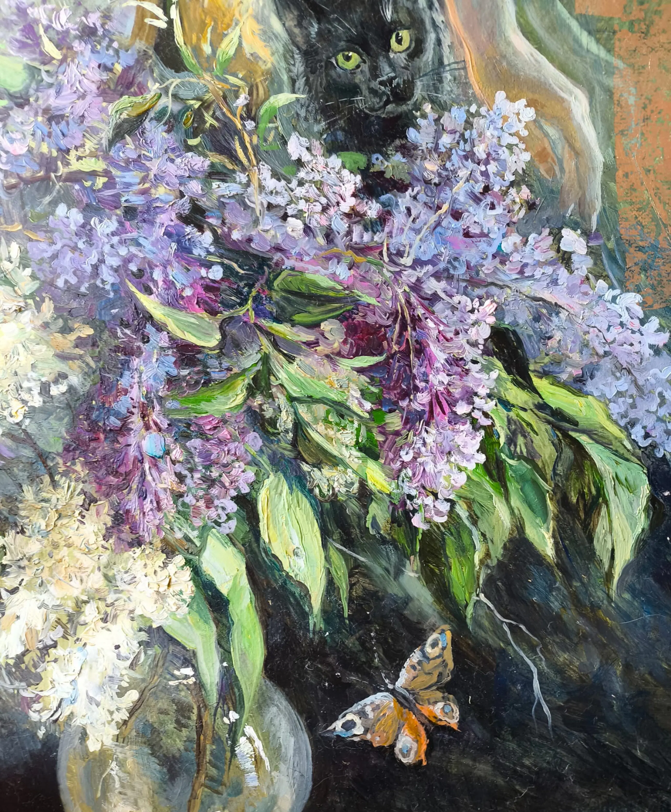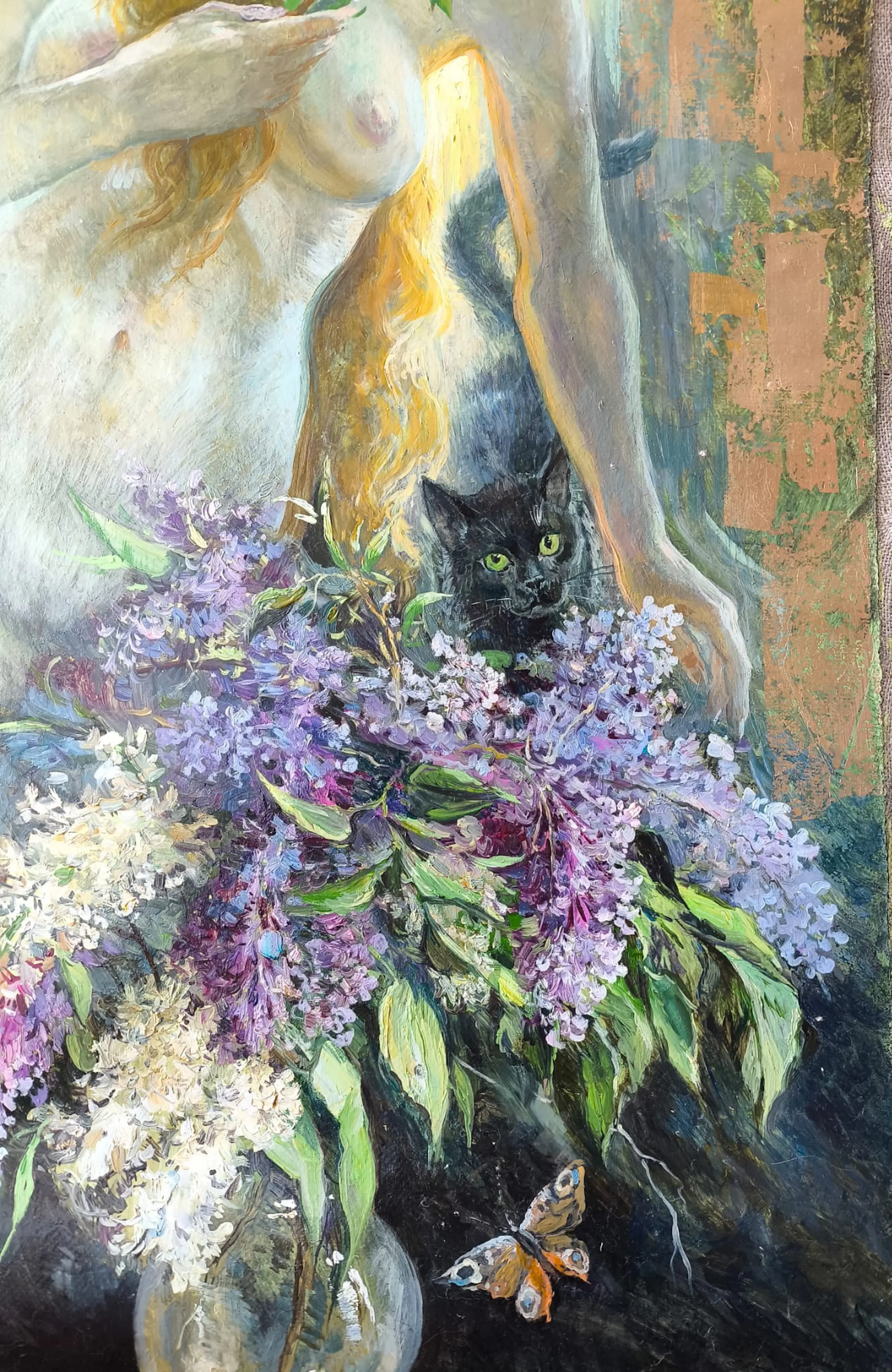 Akt mit Flieder und Katze – Öl auf Leinwand, unten links signiert und auf der Rückseite in russischer Sprache betitelt.
