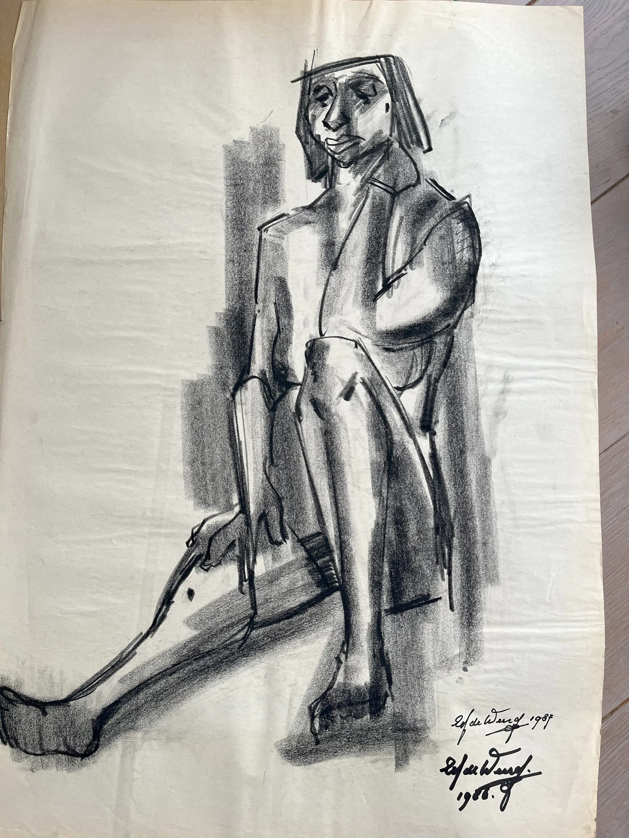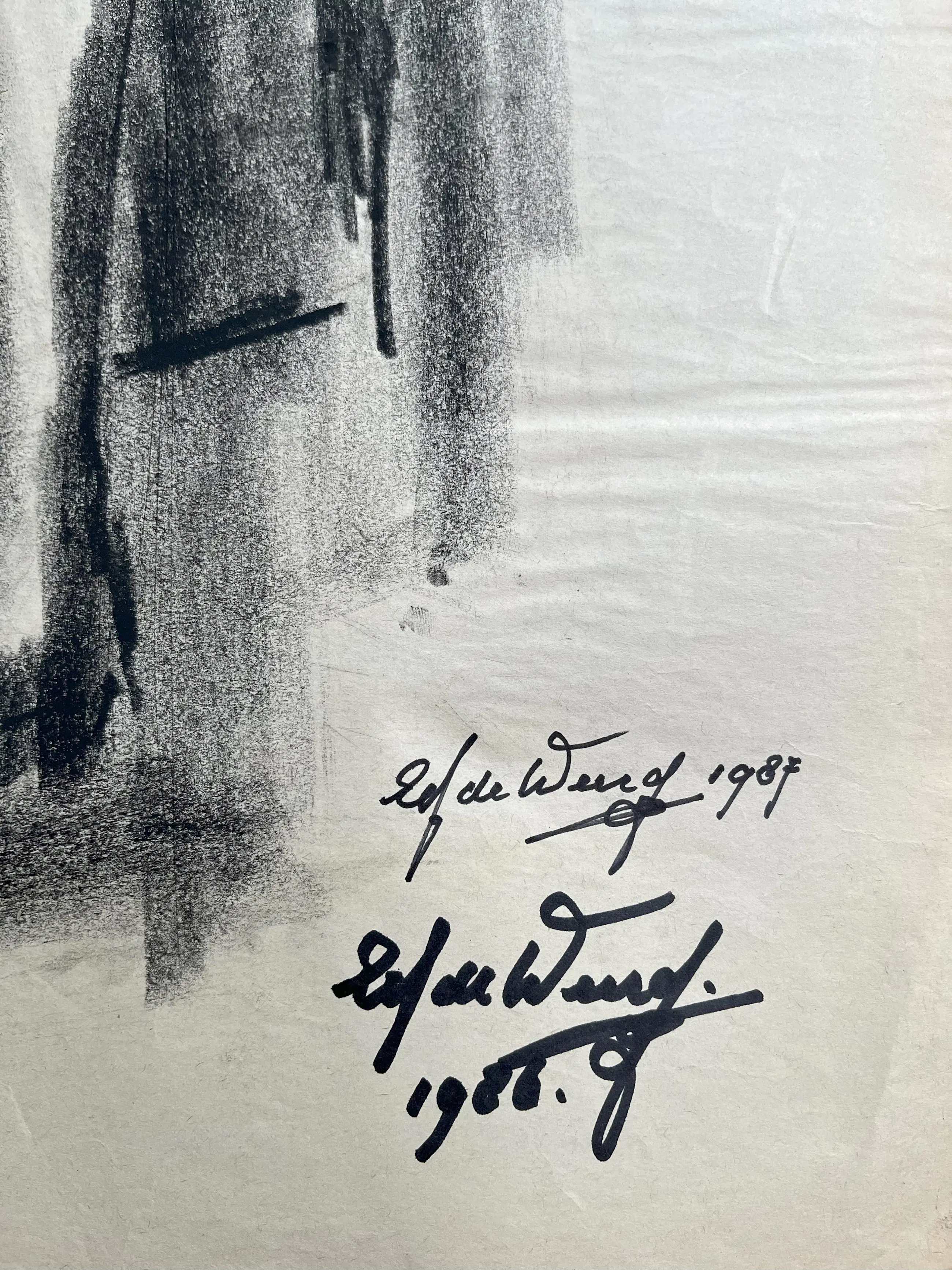 Das präsentierte Kunstwerk, eine Kohlezeichnung auf Papier mit dem Titel „Eleganter Akt“, ist ein schönes Beispiel seines künstlerischen Talents. Das Werk ist handsigniert und auf die Jahre 1986 und 1989 datiert, eine Zeit, in der sich De Weerd nach einer langen Pause voll und ganz seiner Kunst widmete.