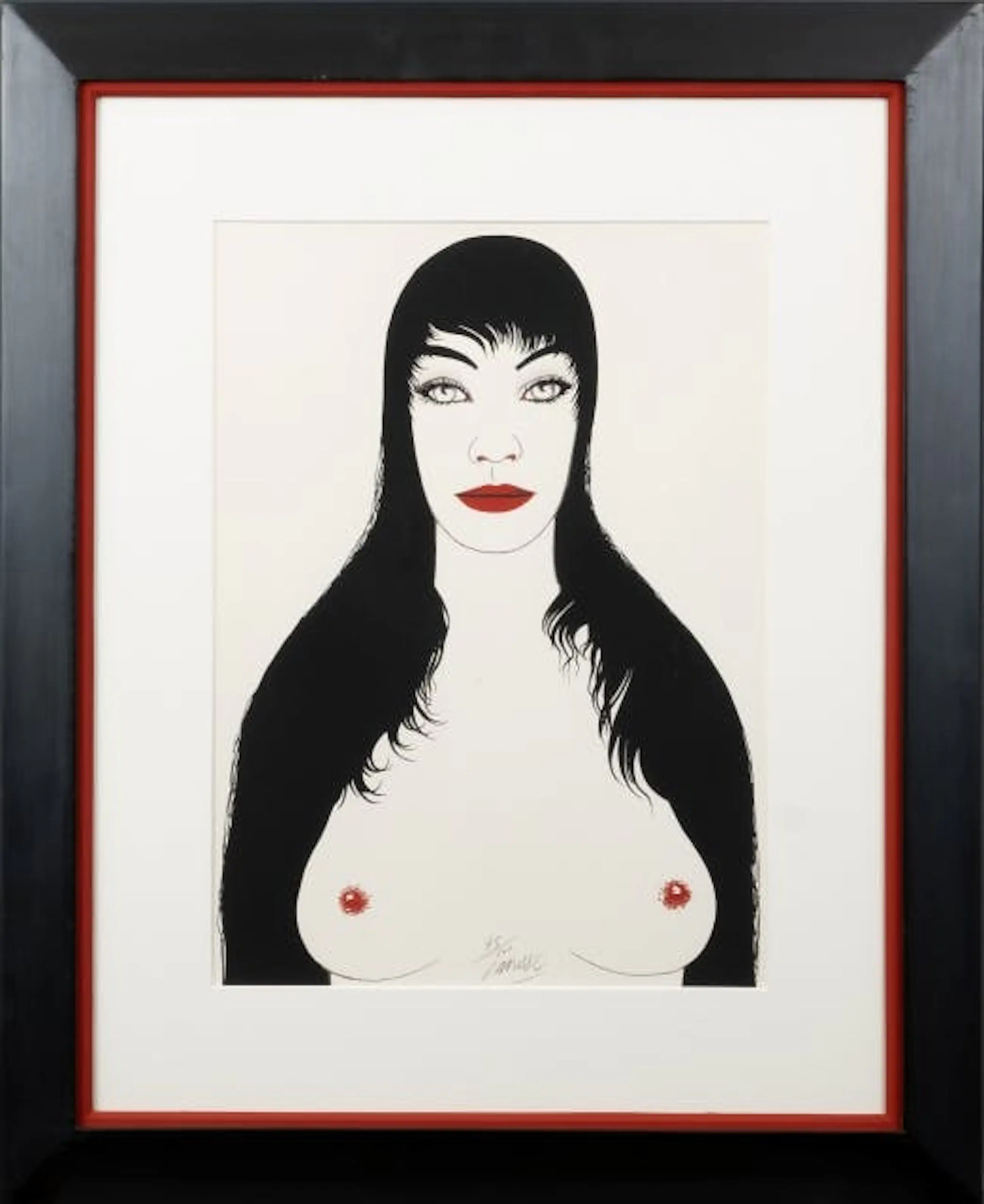 Seltene und faszinierende Farblithografie des französischen Surrealisten Félix Labisse (1905–1982) mit dem Titel „Les Promesses d'un Visage“. Das Werk ist Teil der renommierten Serie „Les Fleurs du Mal “, die 1975 im italienischen Macerata veröffentlicht wurde und von der gleichnamigen Gedichtsammlung von Charles Baudelaire inspiriert ist.