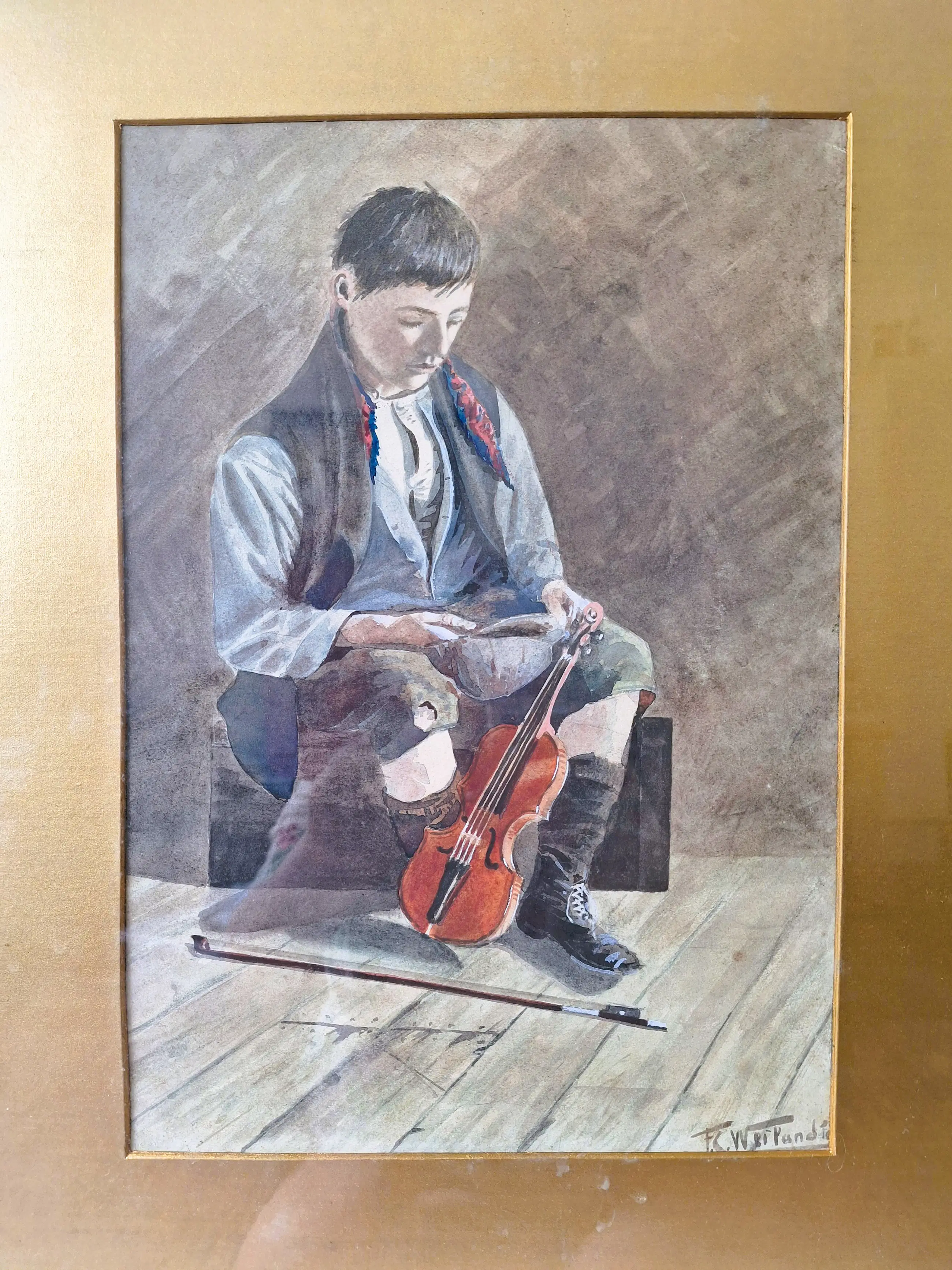 Es zeigt einen jungen Geiger, der den Erlös in seiner Mütze betrachtet.