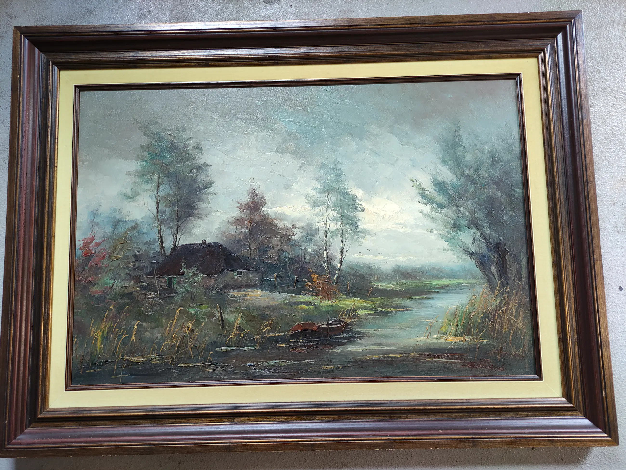 Landschaft mit einem Boot in einem Bach und einem Bauernhof