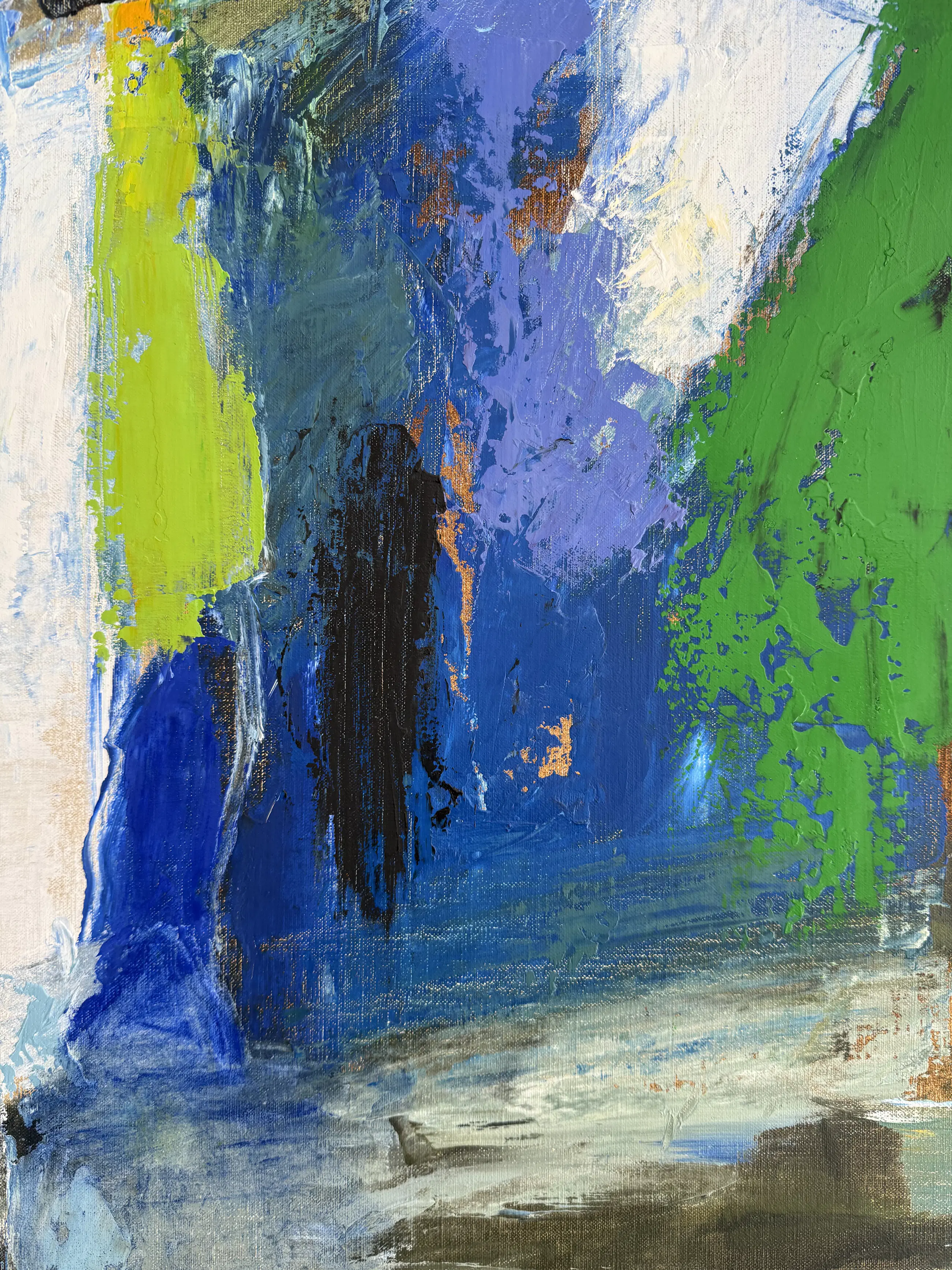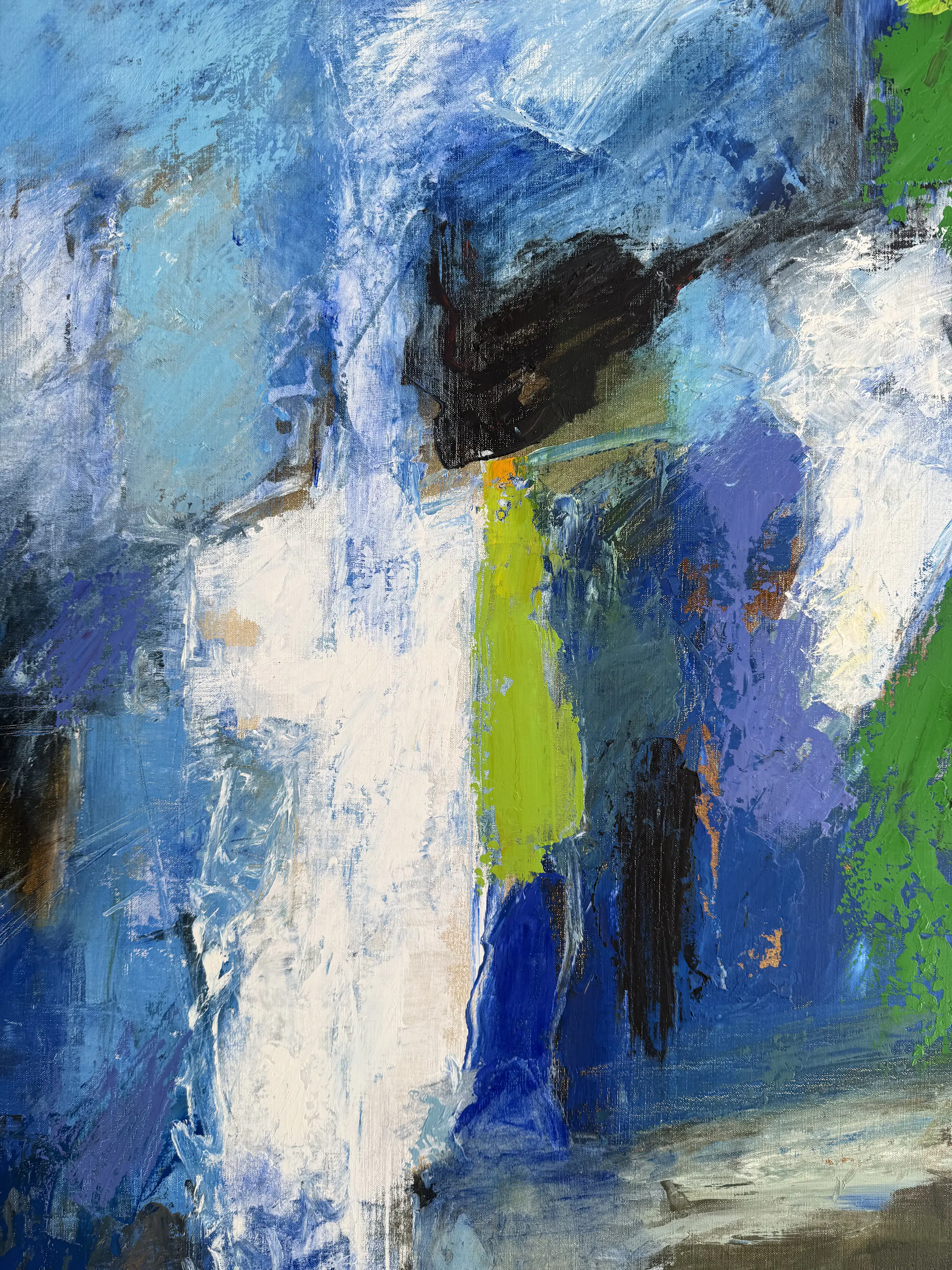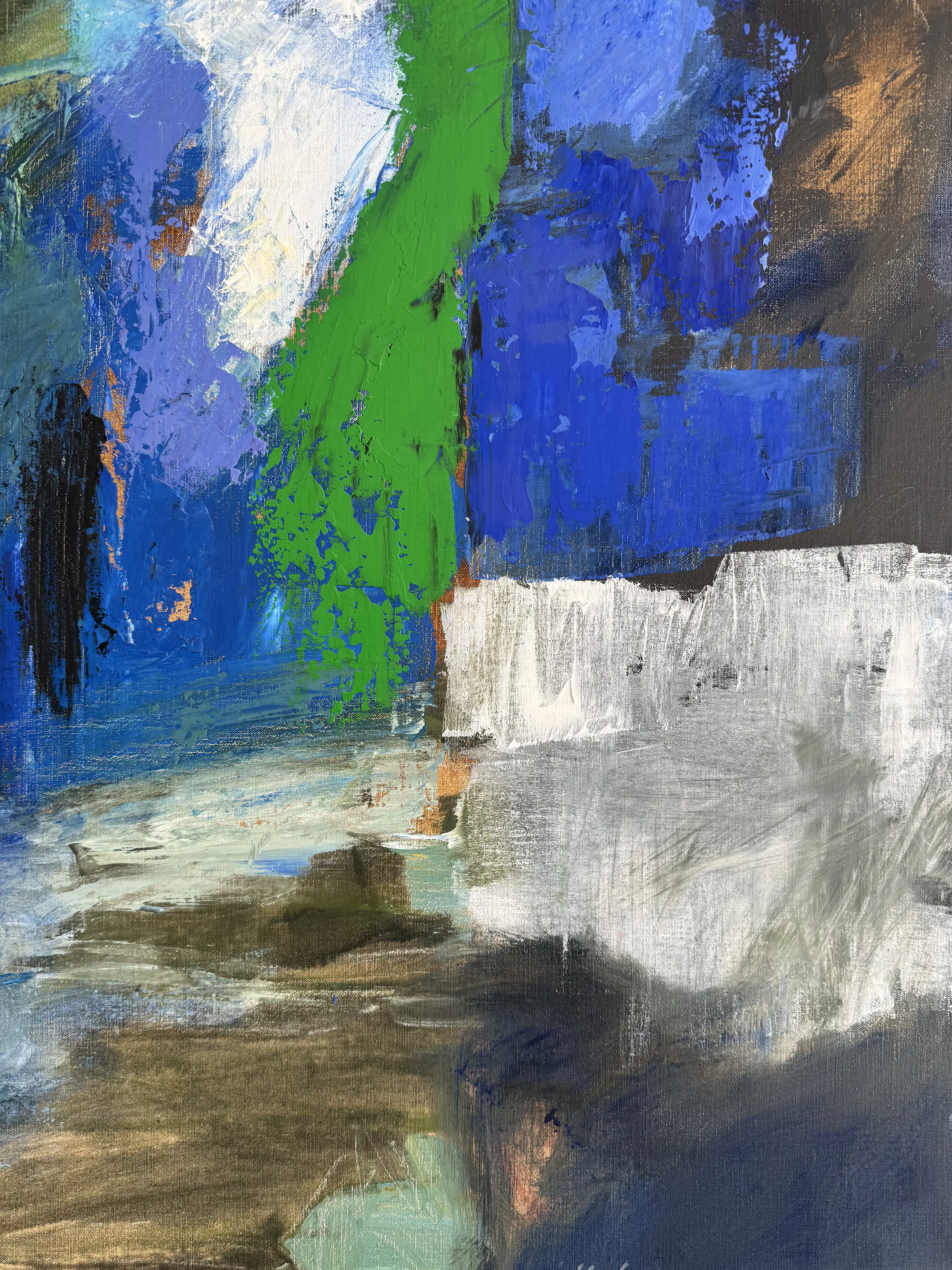 Wunderschöne Farbgebung und eine starke Komposition. Ordentlich gerahmt in einem passenden blauen Kastenrahmen.