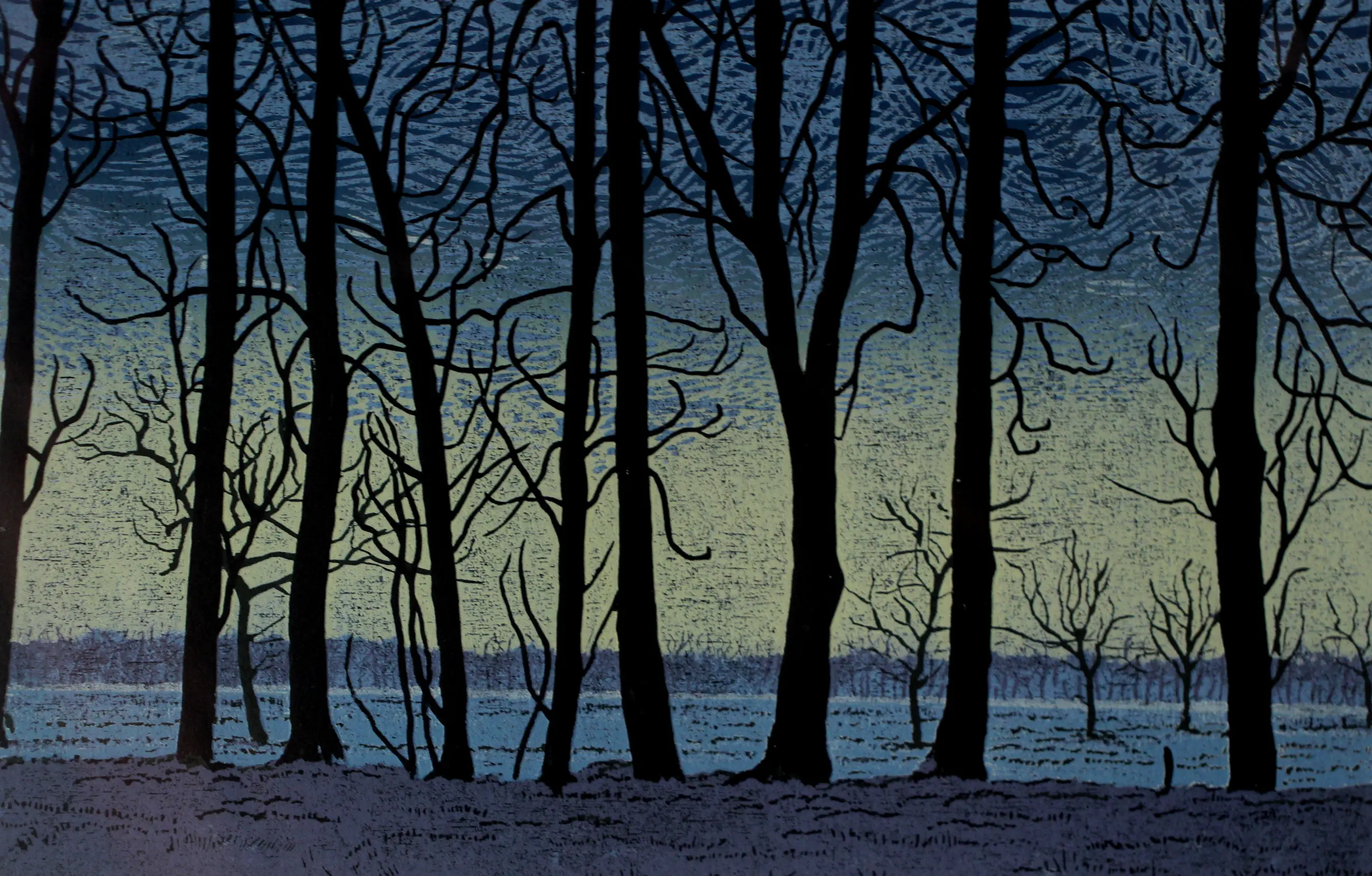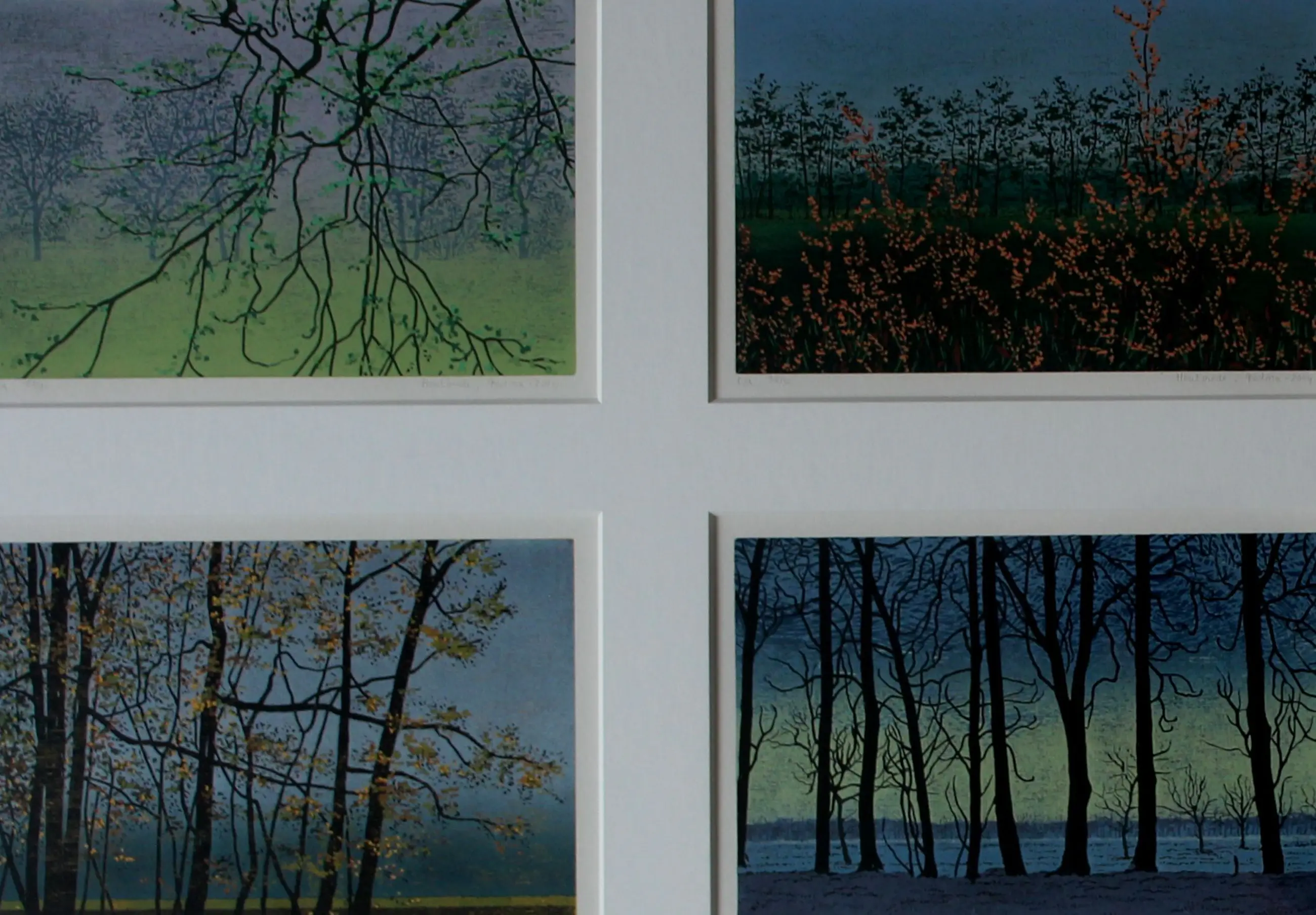 Vier Holzschnitte im Rahmen (vierfach) von Grietje Postma. Titel: Die vier Jahreszeiten. Jahr: 2004. Auflage: EA, 26/30. Maße inkl. Rahmen: H 51 x B 61 cm. Maße pro Bild: H 13 x B 20 cm.