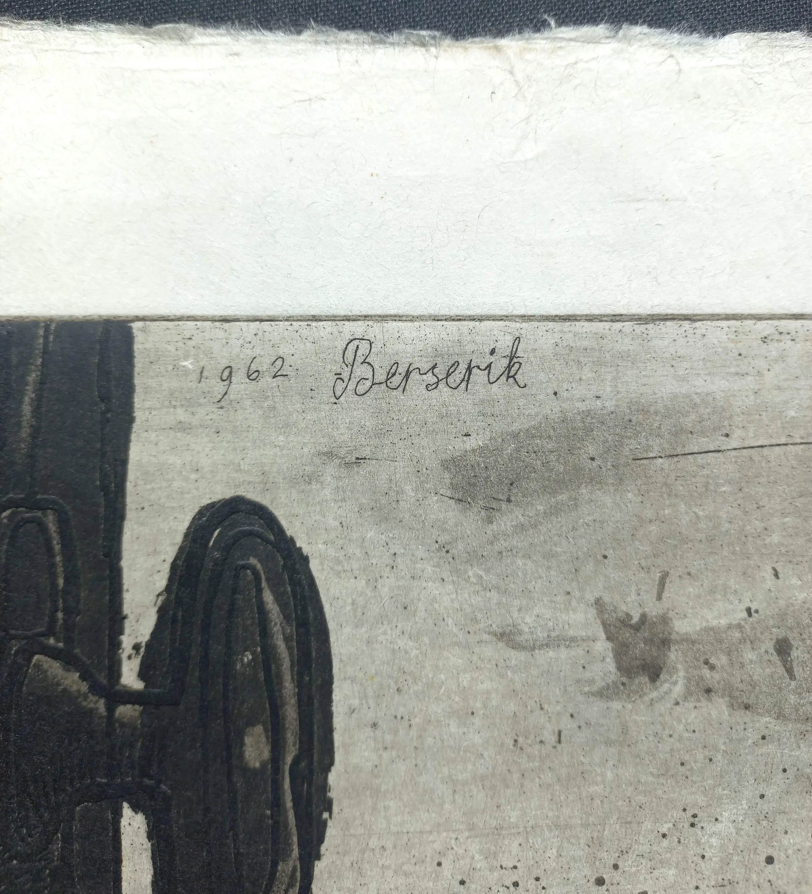 Wunderschöne, recht große Stadtlandschaft von Herman Berserik. Aquatintaradierung auf Büttenpapier, mit Bleistift signiert und datiert (1962), ein Probedruck. Ein Probedruck für eine Radierung, wie ich ihn in diesem Fall noch nie gesehen habe. Berserik nutzte die gegenüberliegende Häuserreihe in einer weiteren, kleineren Performance aus diesem Jahr (siehe letztes Foto), möglicherweise wohnte er 1962 in der betreffenden Straße. In gutem Zustand.