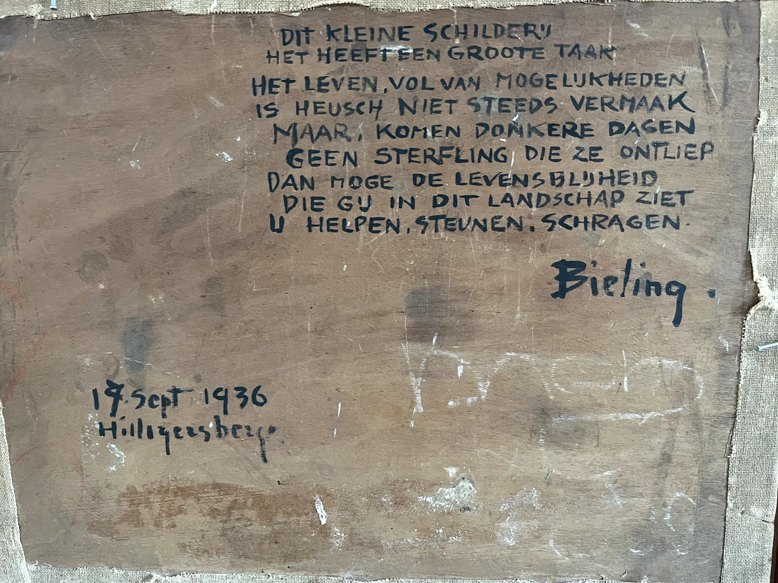 Dies ist ein wahres Meisterwerk von Bieling. In WP Jansens Buch „Freude an der Kunst“ findet sich ein Zitat, das dies bestätigt: „Und danach schafft er überzeugend, freudig und sonnendurchflutet seine schönste lignillistische Landschaft: den Park Bijdorp. Als bildlichen Ausdruck seiner unzerstörbaren Kunstfertigkeit. Er gibt sich seiner Freude am Schaffen hin. Diese überträgt sich auf unsere Freude beim Betrachten. Die Authentizität und Wahrhaftigkeit dieses Werkes sind offensichtlich.“ Siehe auch die Fotos der Buchseiten, auf denen dieses Zitat und weitere Informationen zu finden sind. Das Werk ist auch auf dem Cover abgebildet.