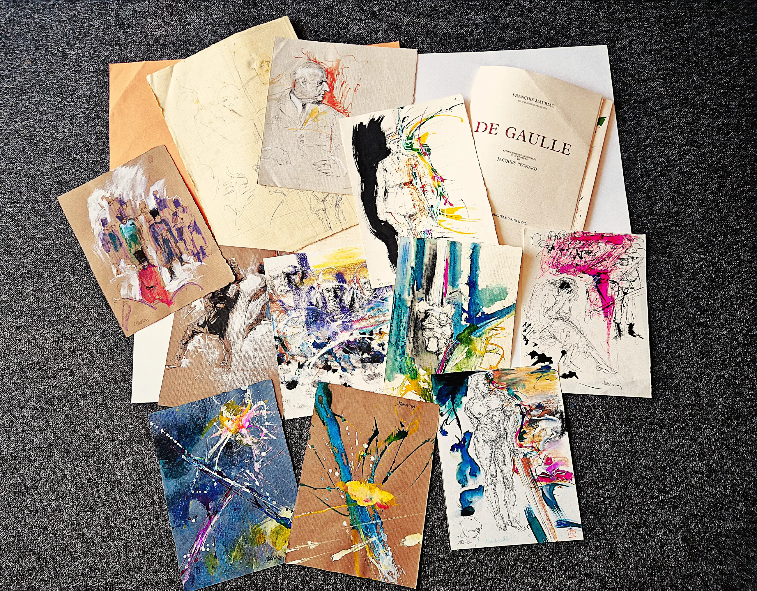 Vollständige Sammlung von Originalwerken des berühmten französischen Künstlers Jacques Pecnard (1922–2012). Diese Sammlung besteht aus 8 Werken in gemischten Medien (Aquarell, Tinte, Gouache), 2 abstrakten Aquarellen, 1 Tuschezeichnung (Landschaft), einigen (2) Skizzen (mit Feder und Bleistift) und einem (unvollständigen) Portfolio – „de Gaulle“ von Francois Mauriac mit Originallithografien von Jacques Pecnard.