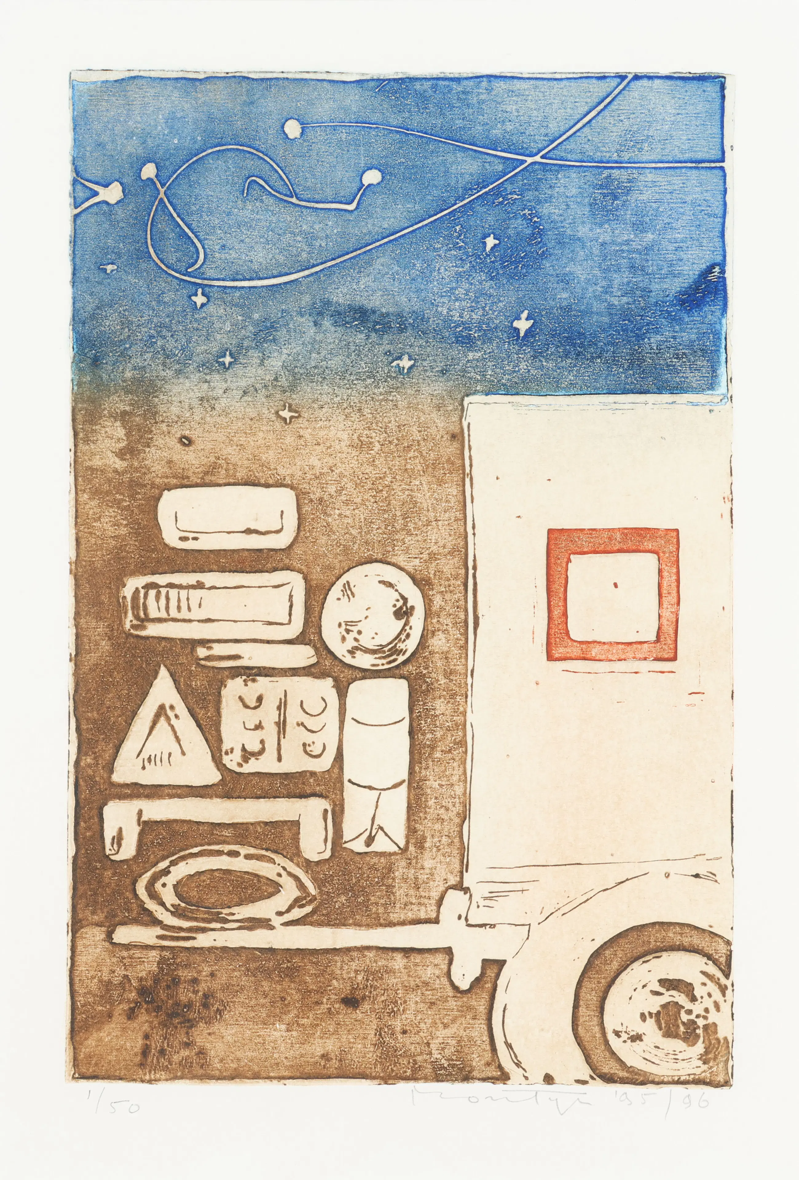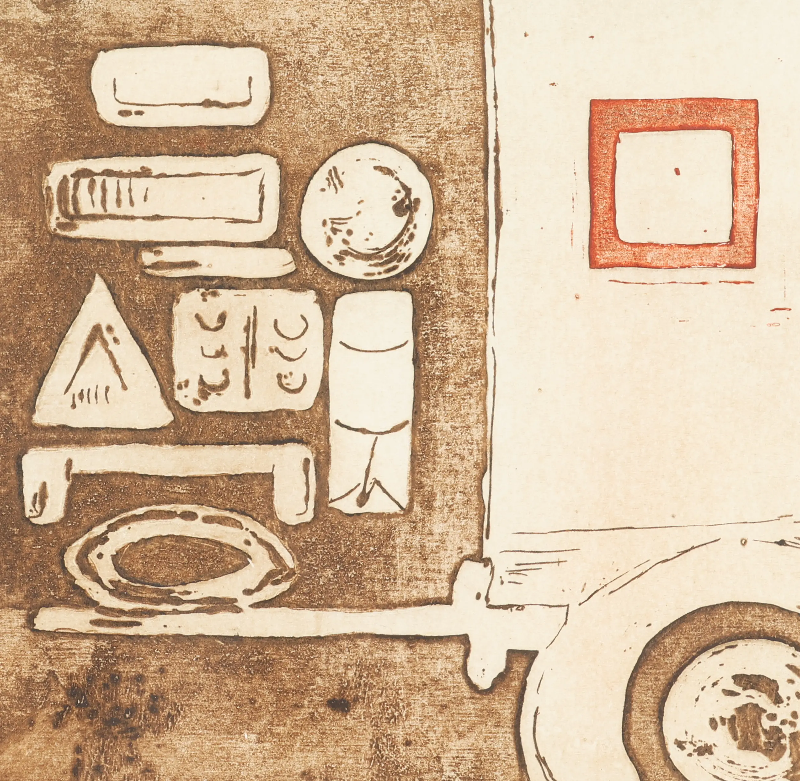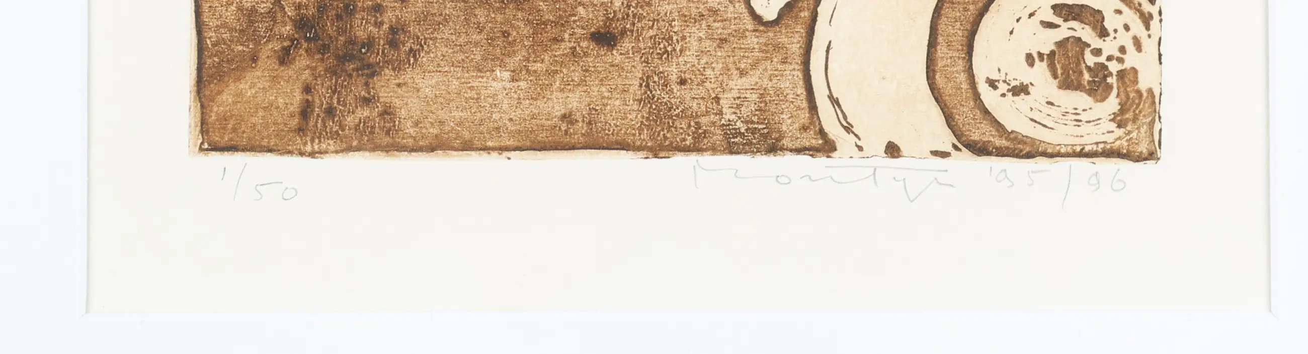 Dieser Siebdruck von Jan Montyn zeigt mit minimalem Farbeinsatz eine faszinierende Szene und lässt dem Betrachter die Freiheit, seine eigenen Interpretationen zu entwickeln. Was stellen die grafischen Formen dar? Gibt es ein Gefühl von Raum, Luft oder Bewegung? Die Offenheit des Bildes lädt zum Nachdenken und zur Fantasie ein.