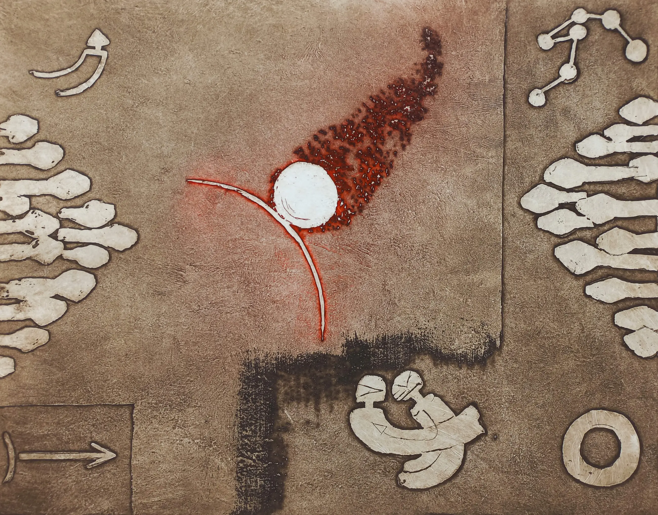 Sehr schöne Komposition von Jan Montyn aus einer seiner besten Perioden. Aquatintaradierung auf Büttenpapier, mit Bleistift signiert, datiert (1976) und nummeriert (20/35). In gutem Zustand.