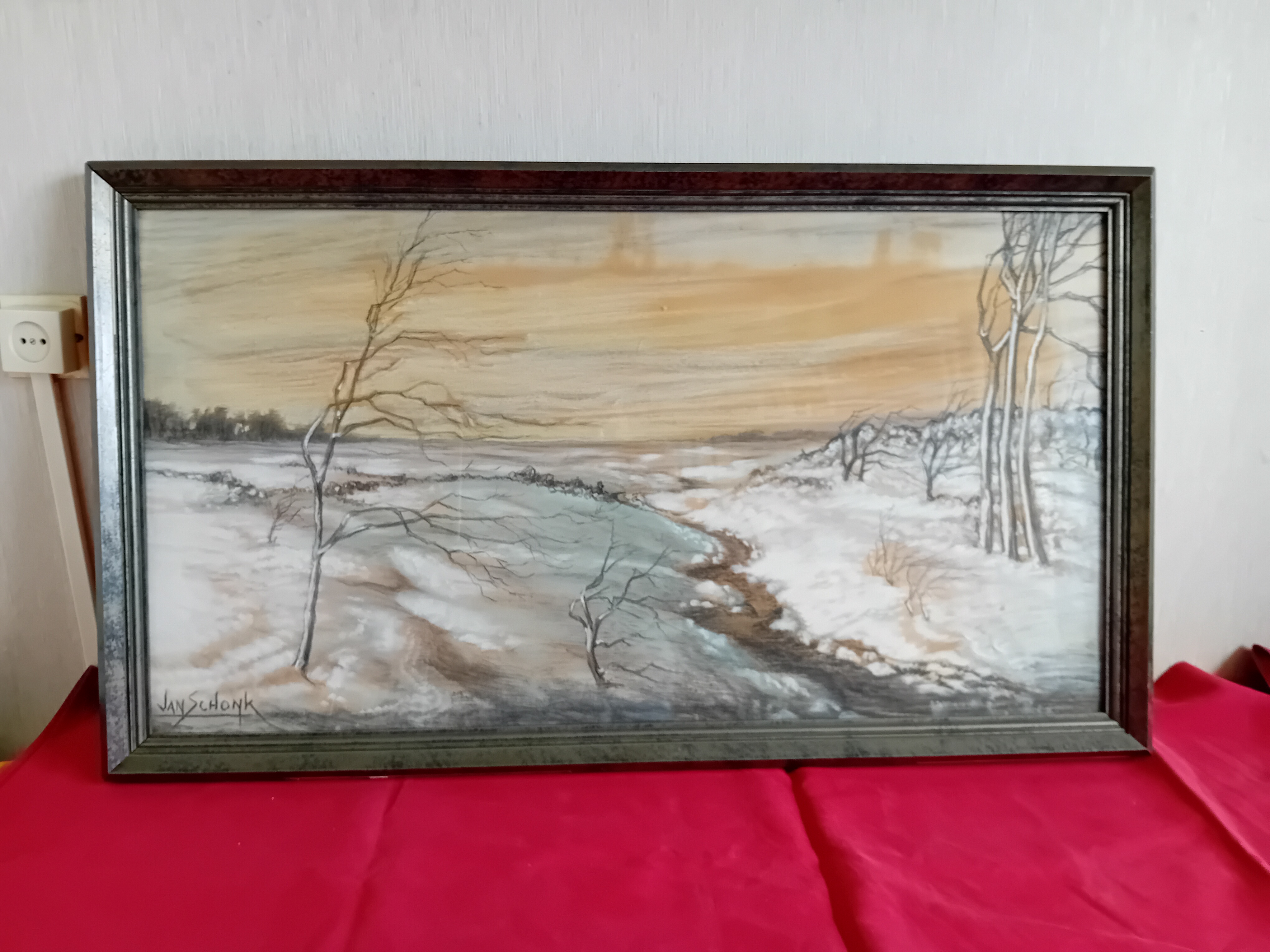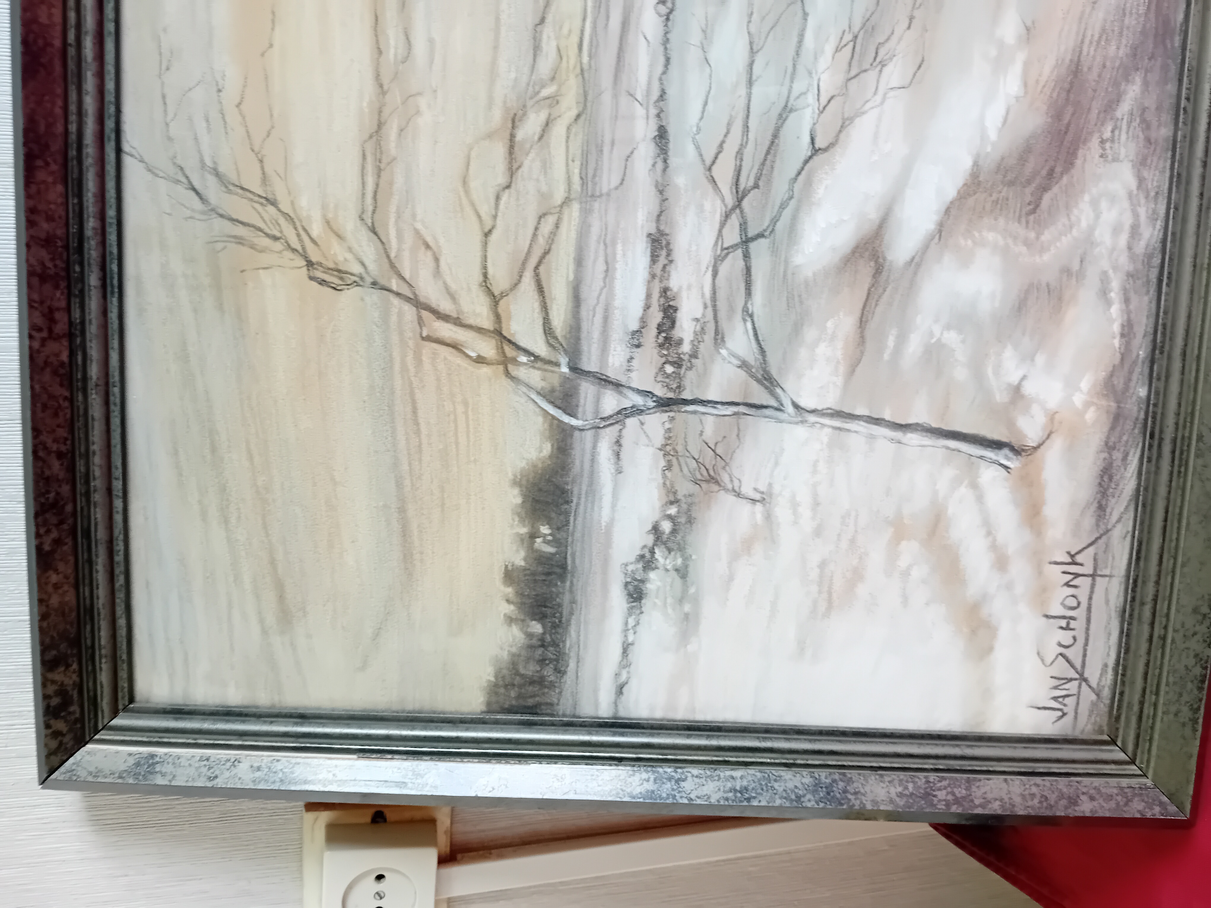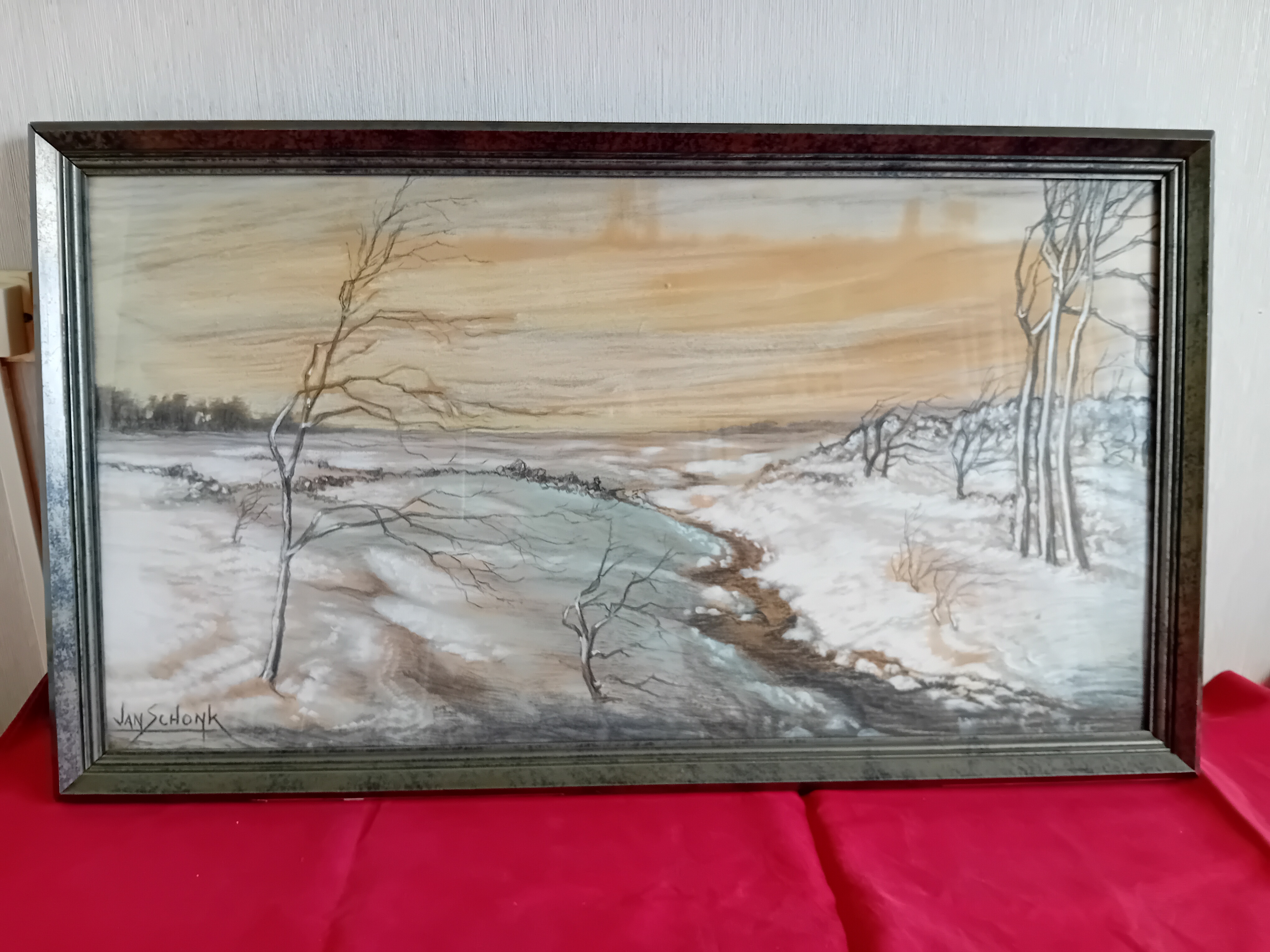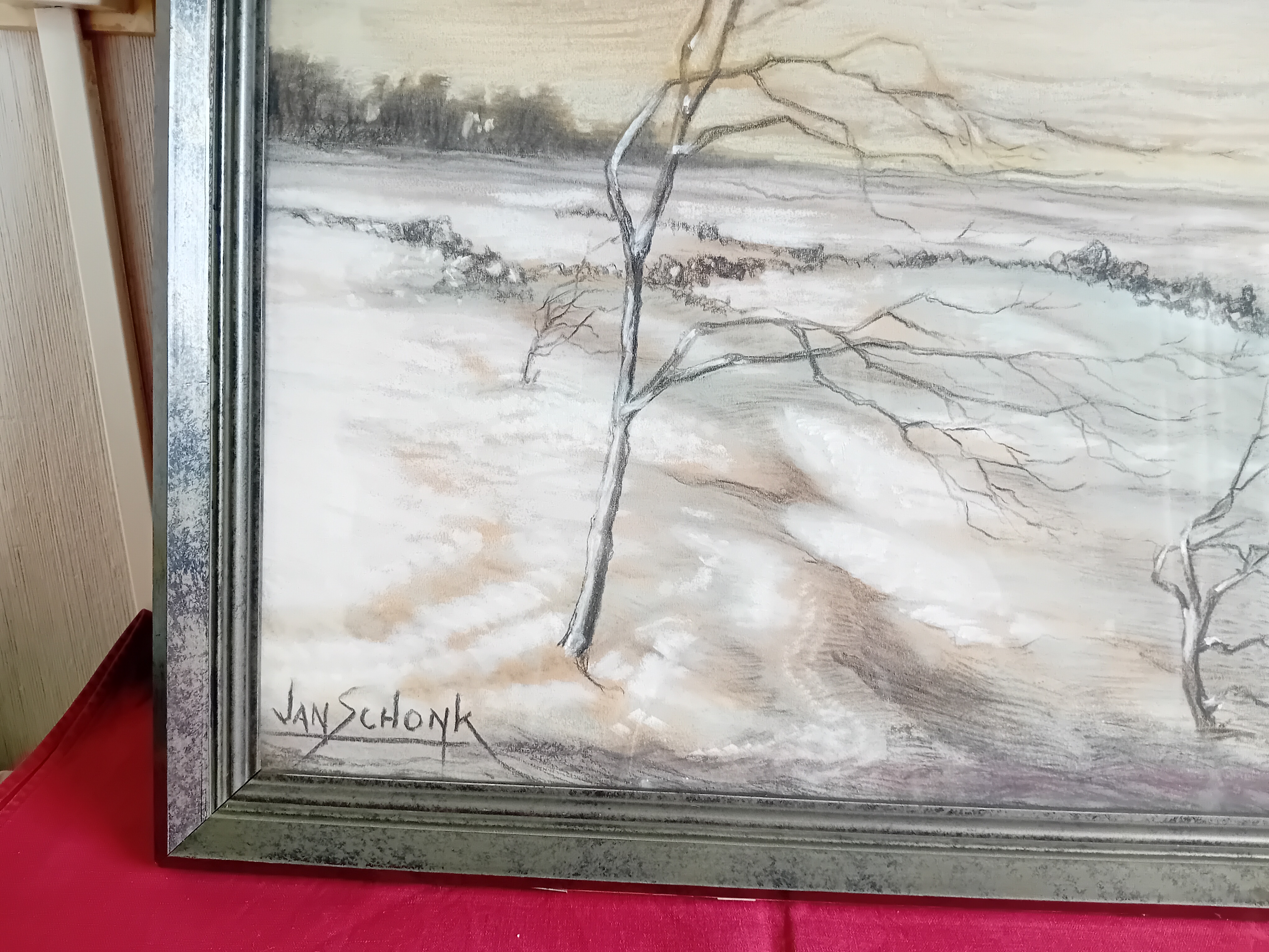 Eine sehr schöne, große, eindrucksvolle Pastellzeichnung einer Winterlandschaft von Jan Schonk.