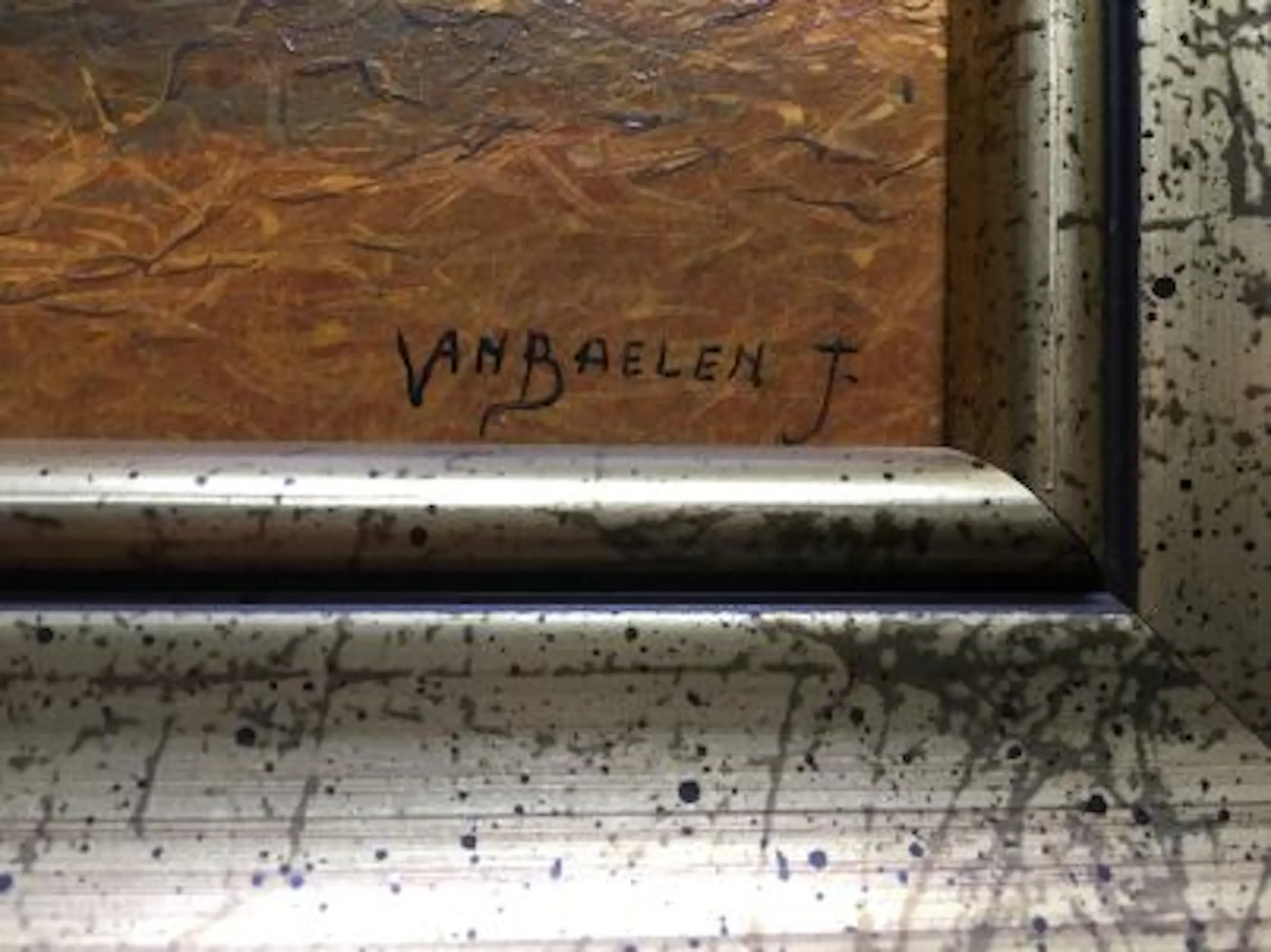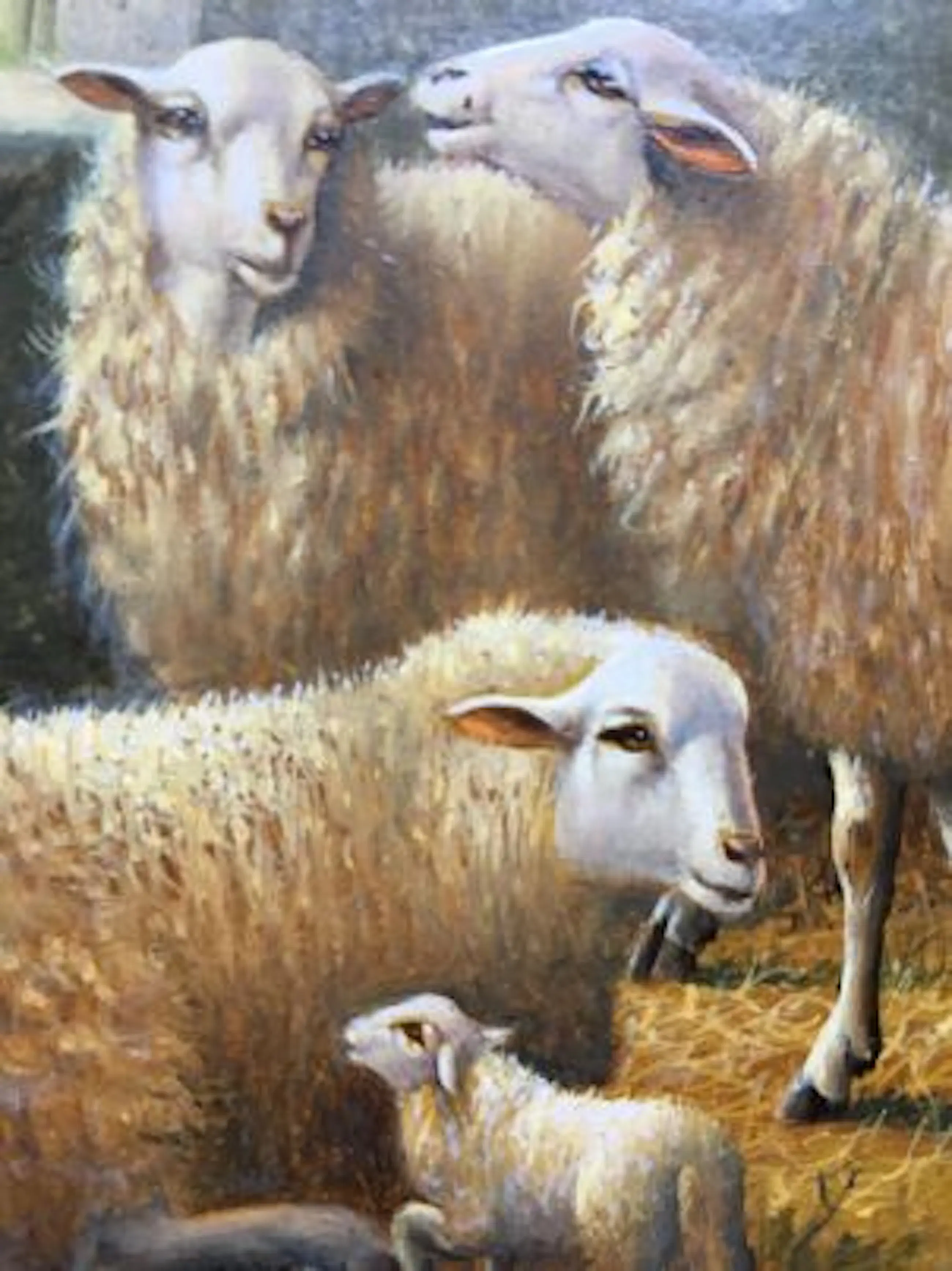 Ein wunderschönes Gemälde eines Schafstalls mit drei Schafen und einem Lamm. Jan Van Baelen ist ein belgischer Maler, der vor allem Bauernszenen malt. Seine Schafe sind hochgeschätzt.