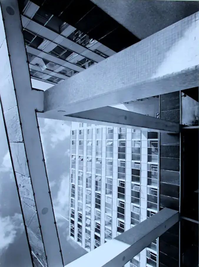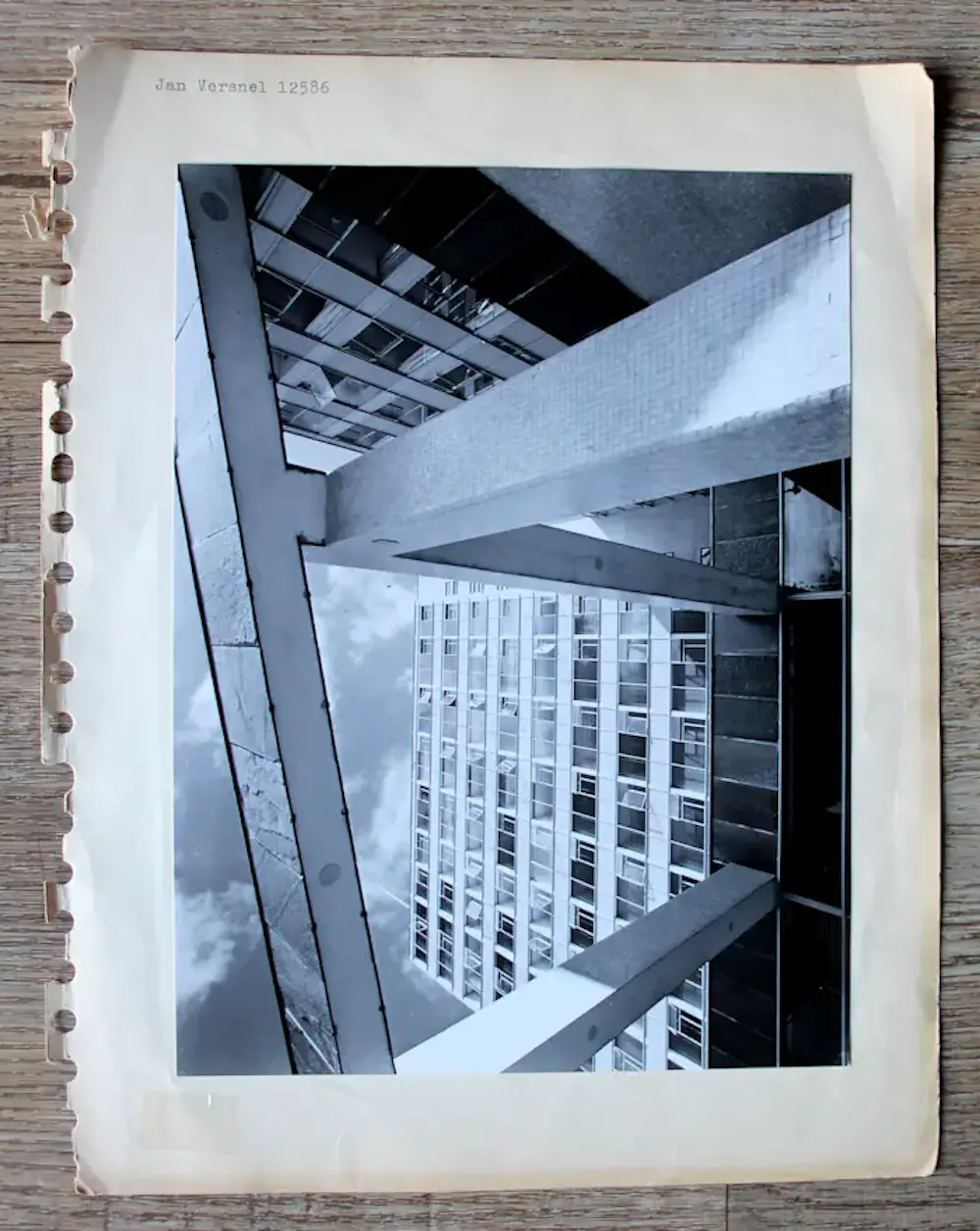 3 Fotos aus den 50er/60er Jahren von Jan Versnel. Es handelt sich um ein Foto eines Mannes auf einer Terrasse, ein Foto einer Stadtlandschaft und ein Foto eines Gebäudes. Die Fotos sind auf Papier geklebt. Auf einem Blatt befindet sich beidseitig ein Foto. Auf dem anderen Blatt befindet sich ein Foto. Oben sind die Nummer des Fotos und der Name des Fotografen eingetippt.