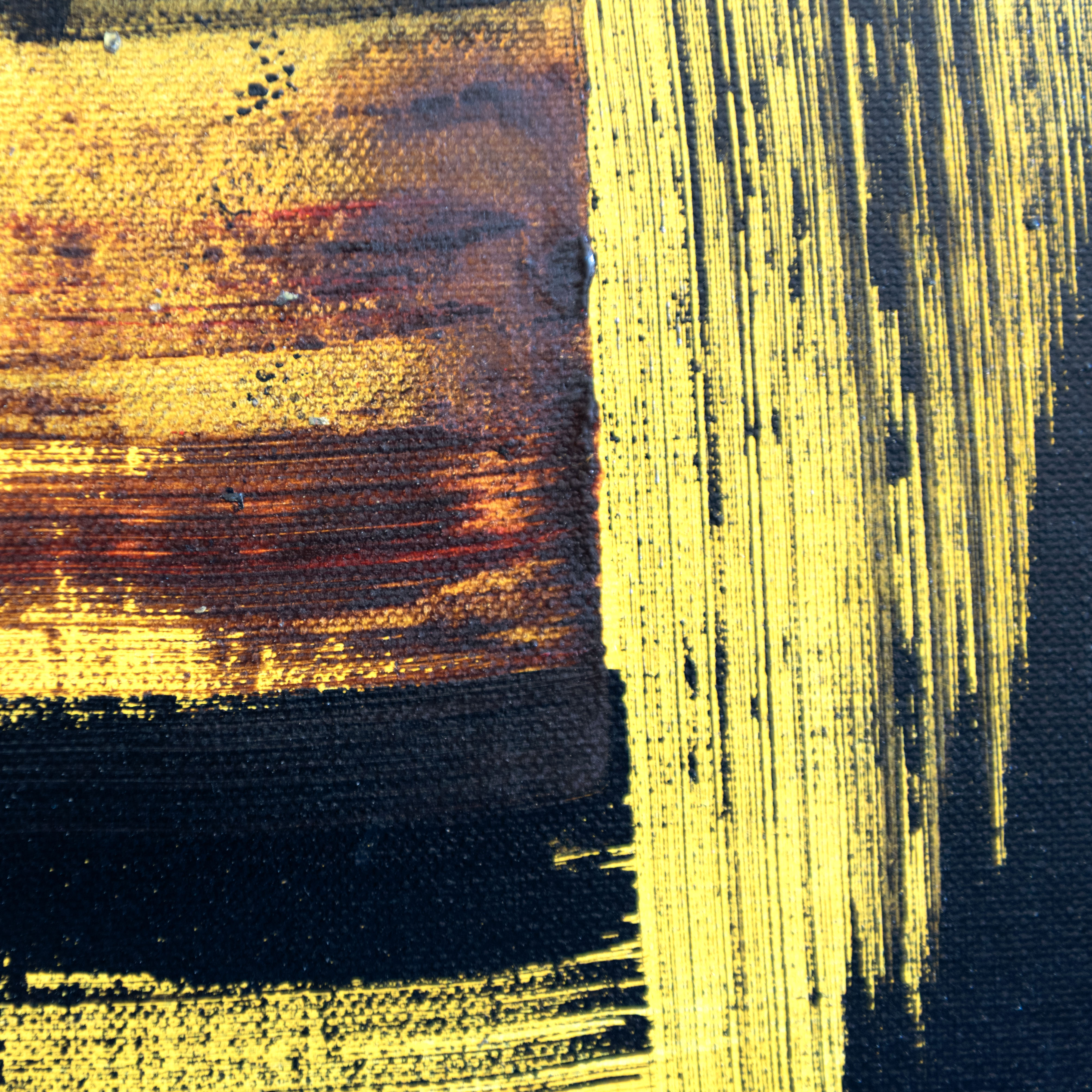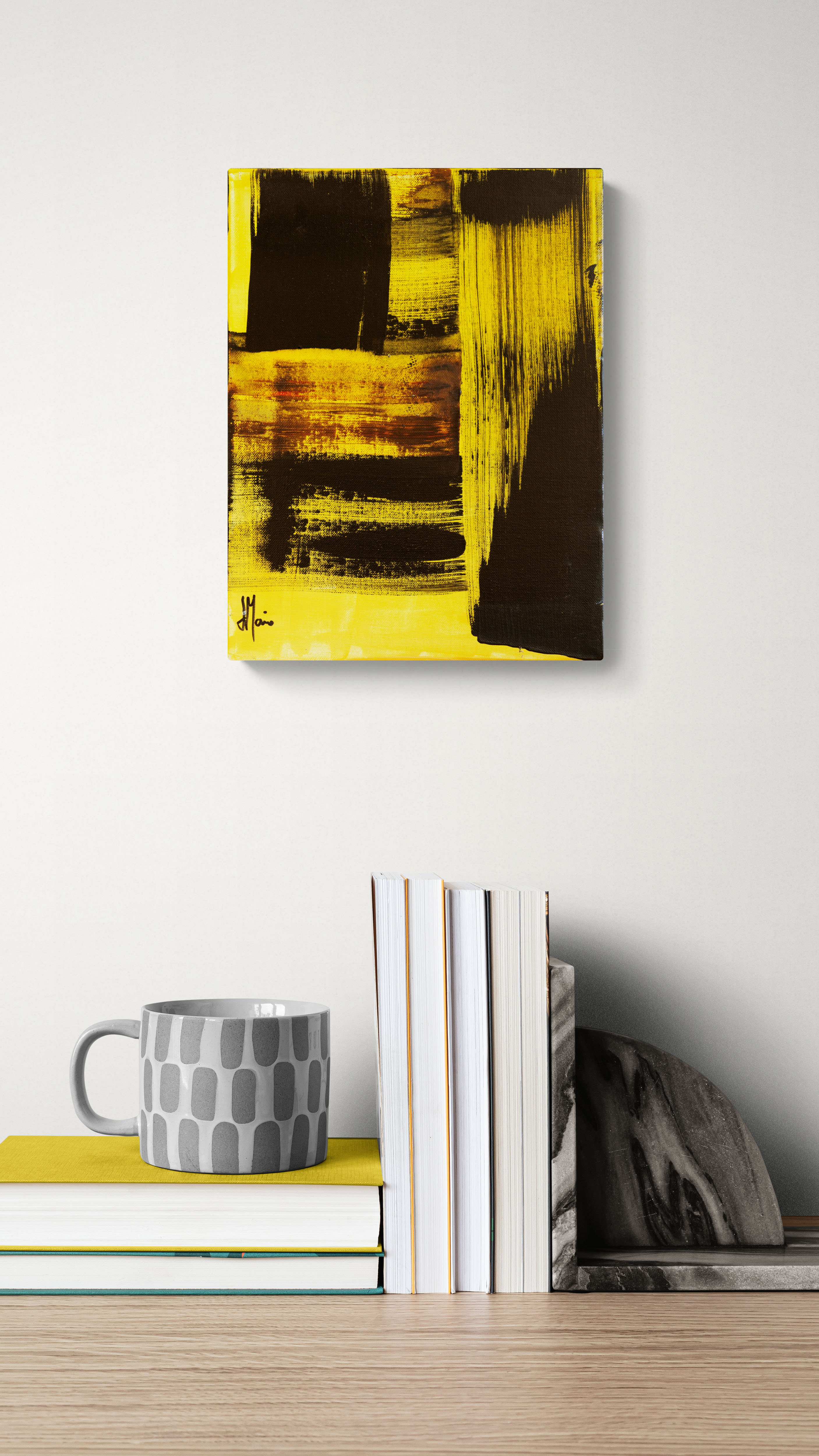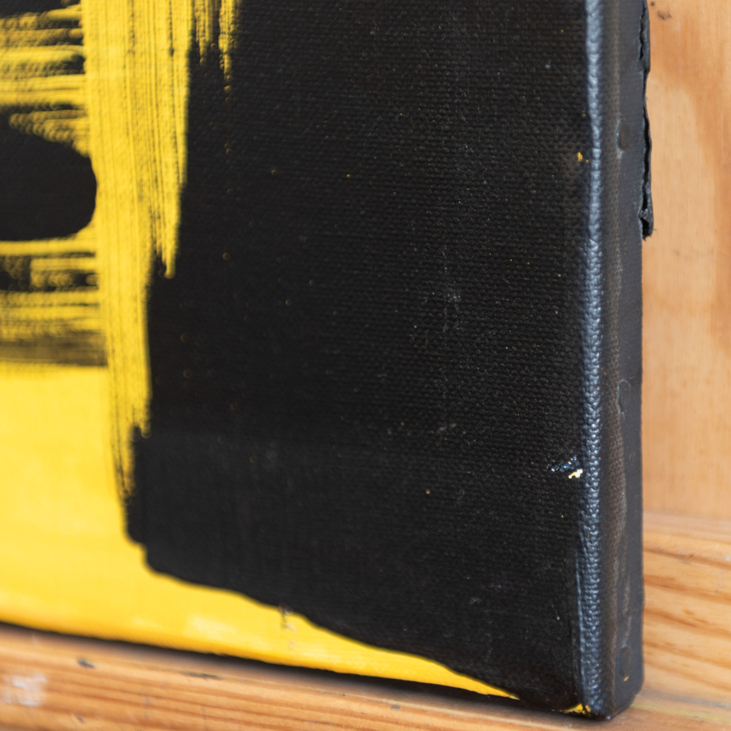 Die Komposition, in der leuchtendes Gelb im Kontrast zu großen, flächigen Schwarztönen dominiert, spielt mit der Stärke der Farbkontraste und der Vielfalt der Gesten. Zwischen dichten, flächigen Tönen und transparenteren Pinselstrichen schafft der Künstler einen visuellen Rhythmus, der das Auge sofort fesselt.