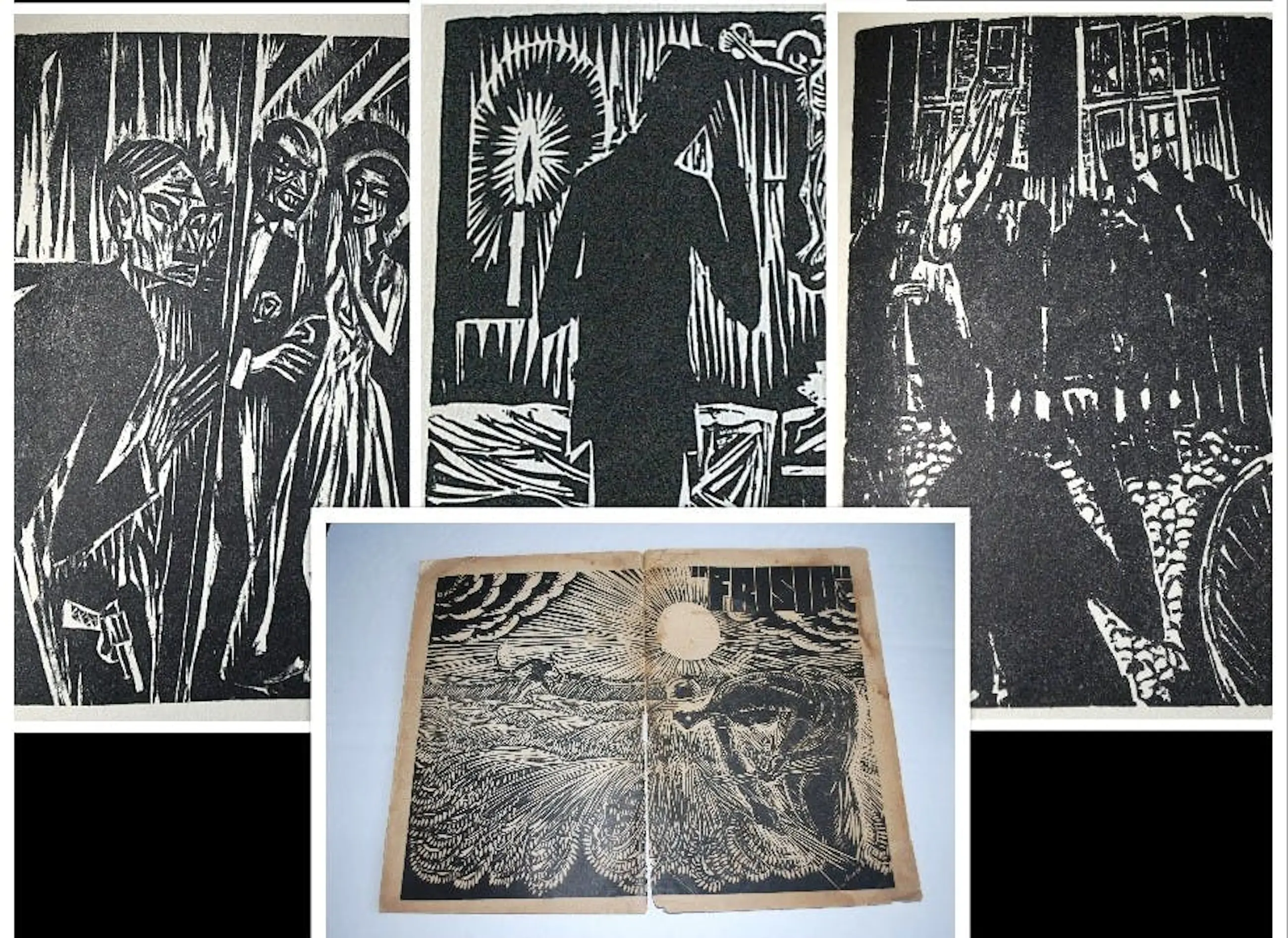 Ebenfalls enthalten ist ein Holzschnitt vom Cover der Zeitschrift „Frisia“, einer Zeitschrift für friesische Sprachkunst, 1922 (Band VI). Maße (aufgeklappt): 24 x 32 cm. Die Zeitschrift ist in gutem Zustand, aber vollständig.