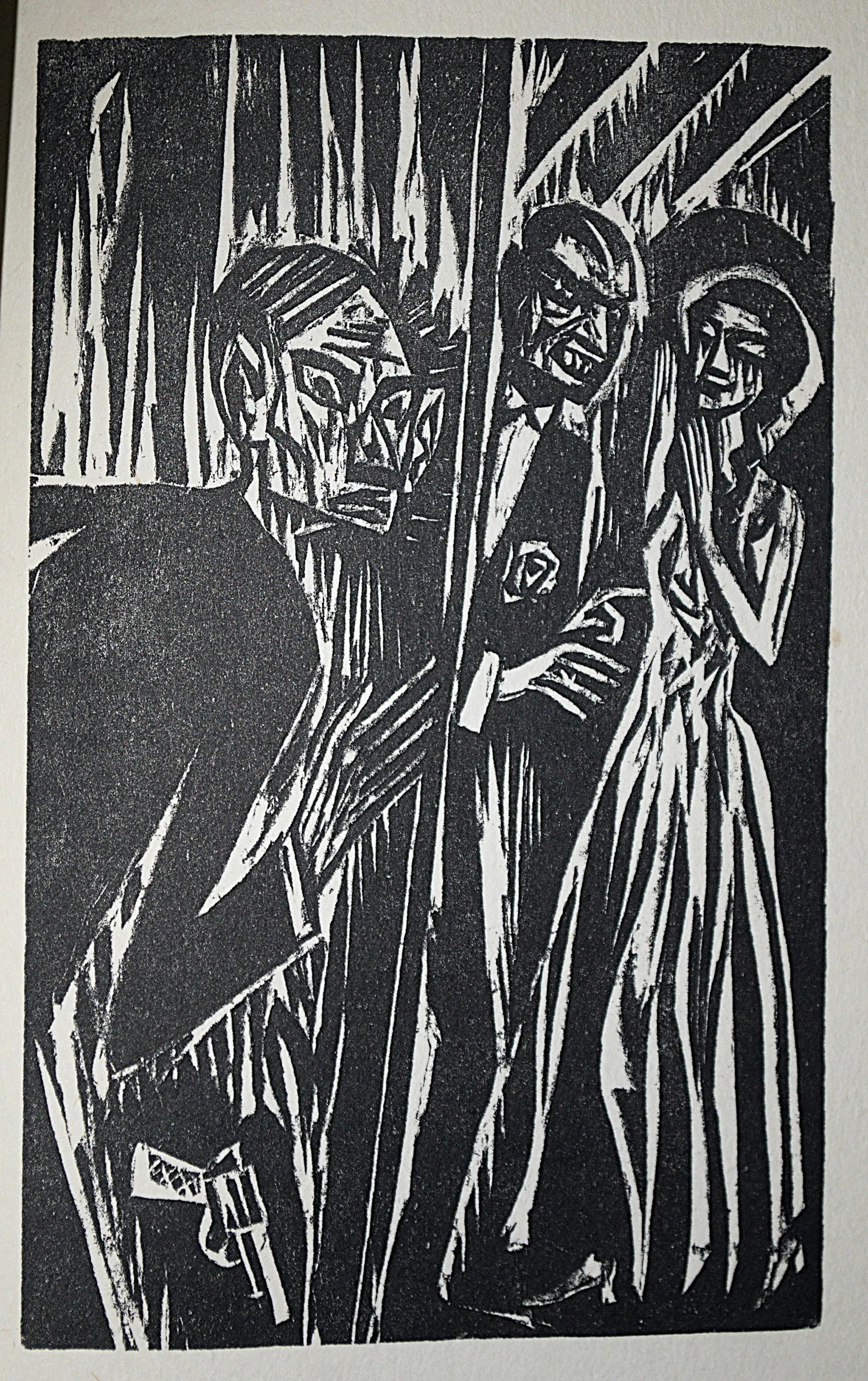 Drei Holzschnitte aus Dostojewskis Buch „Die Sanften“ (1876). Dies ist die dritte Ausgabe mit 133 Seiten. (Die erste Ausgabe enthielt nur einen Holzschnitt, den auf dem Umschlag.)