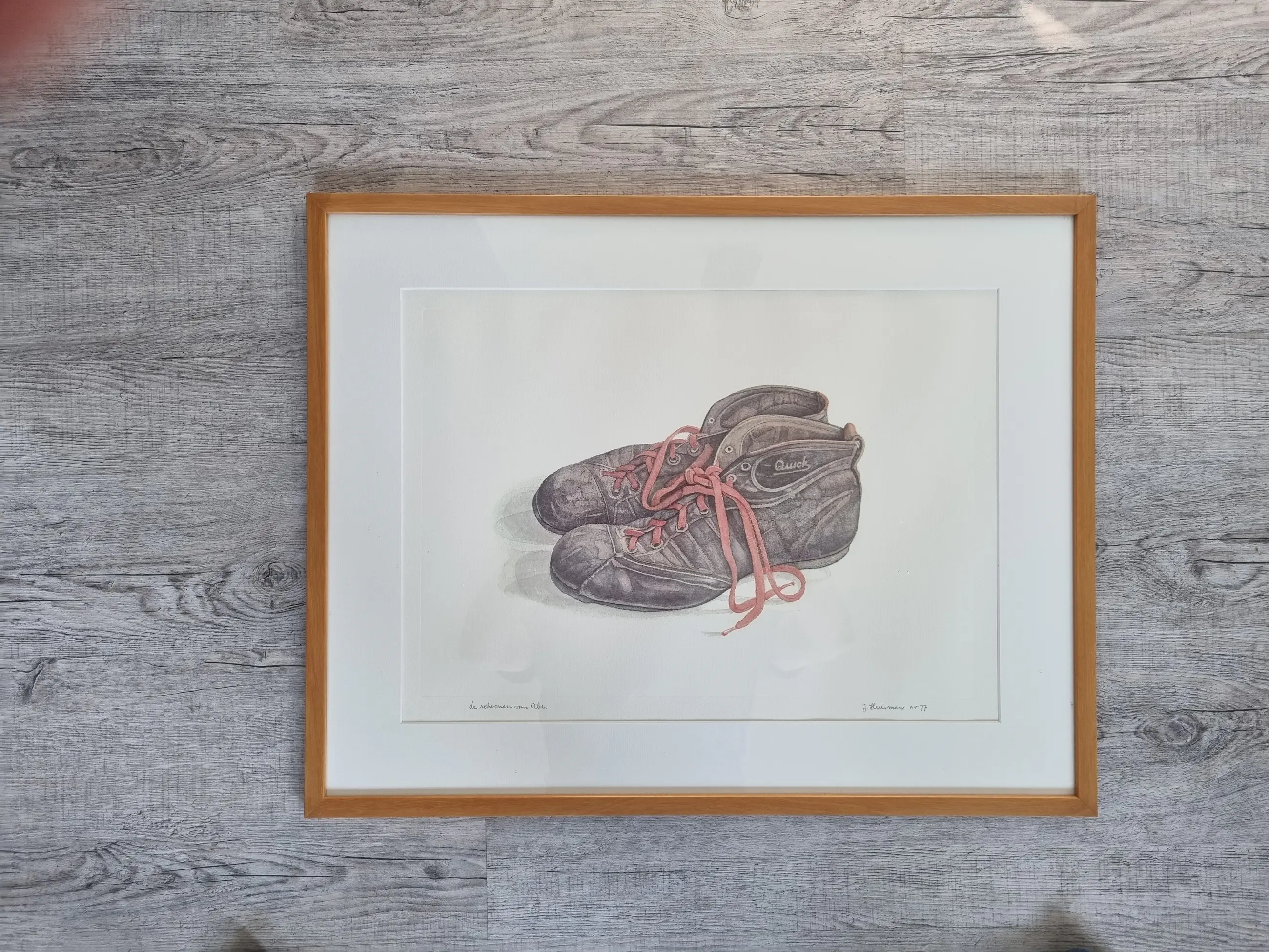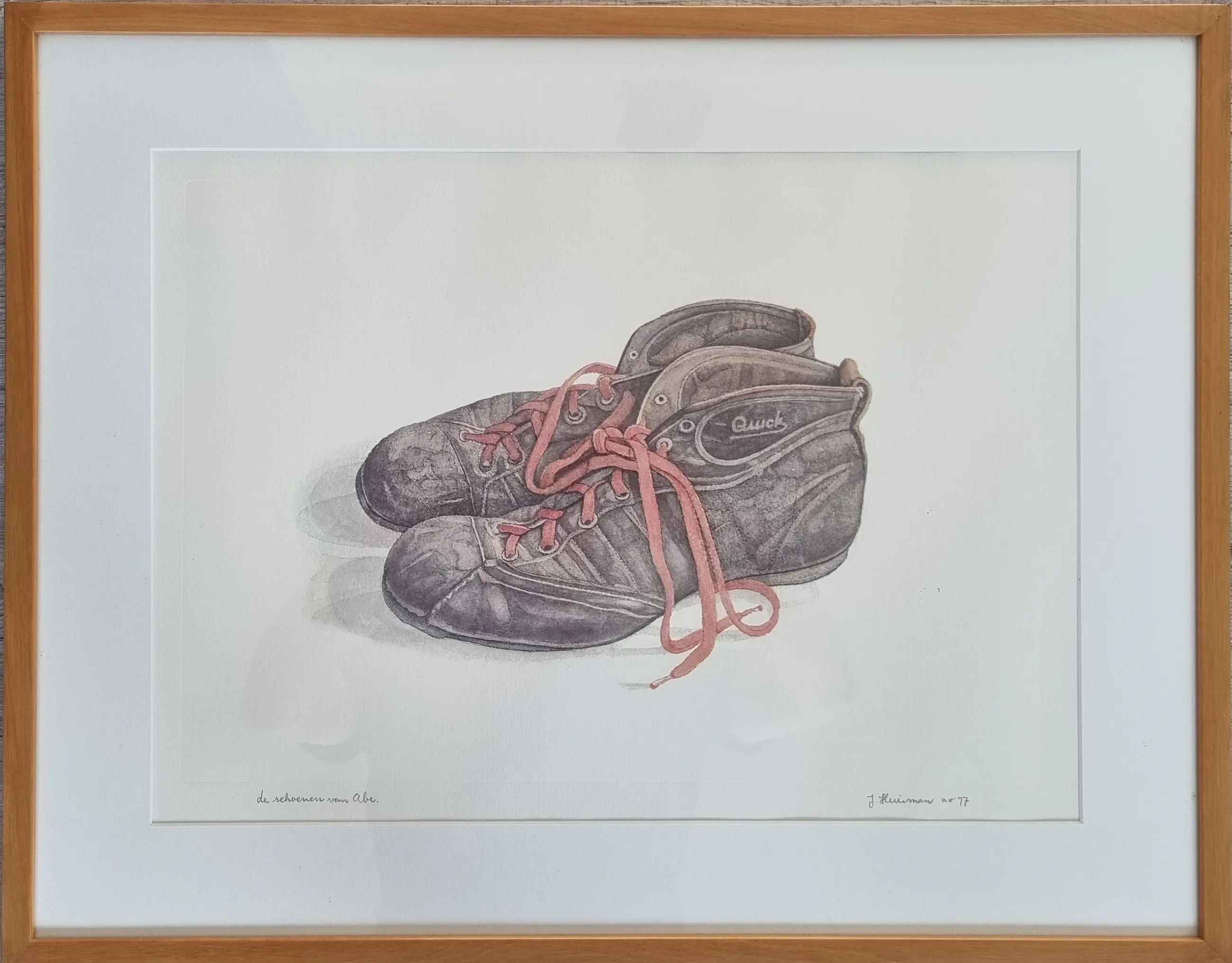 Jopie Huisman „Die Schuhe Abe“ Lithografie von 1995. Hergestellt 1995 anlässlich der Eröffnung des Abe Lenstra-Stadions in Heerenveen Unten rechts signiert und nummeriert. In sehr gutem Zustand
