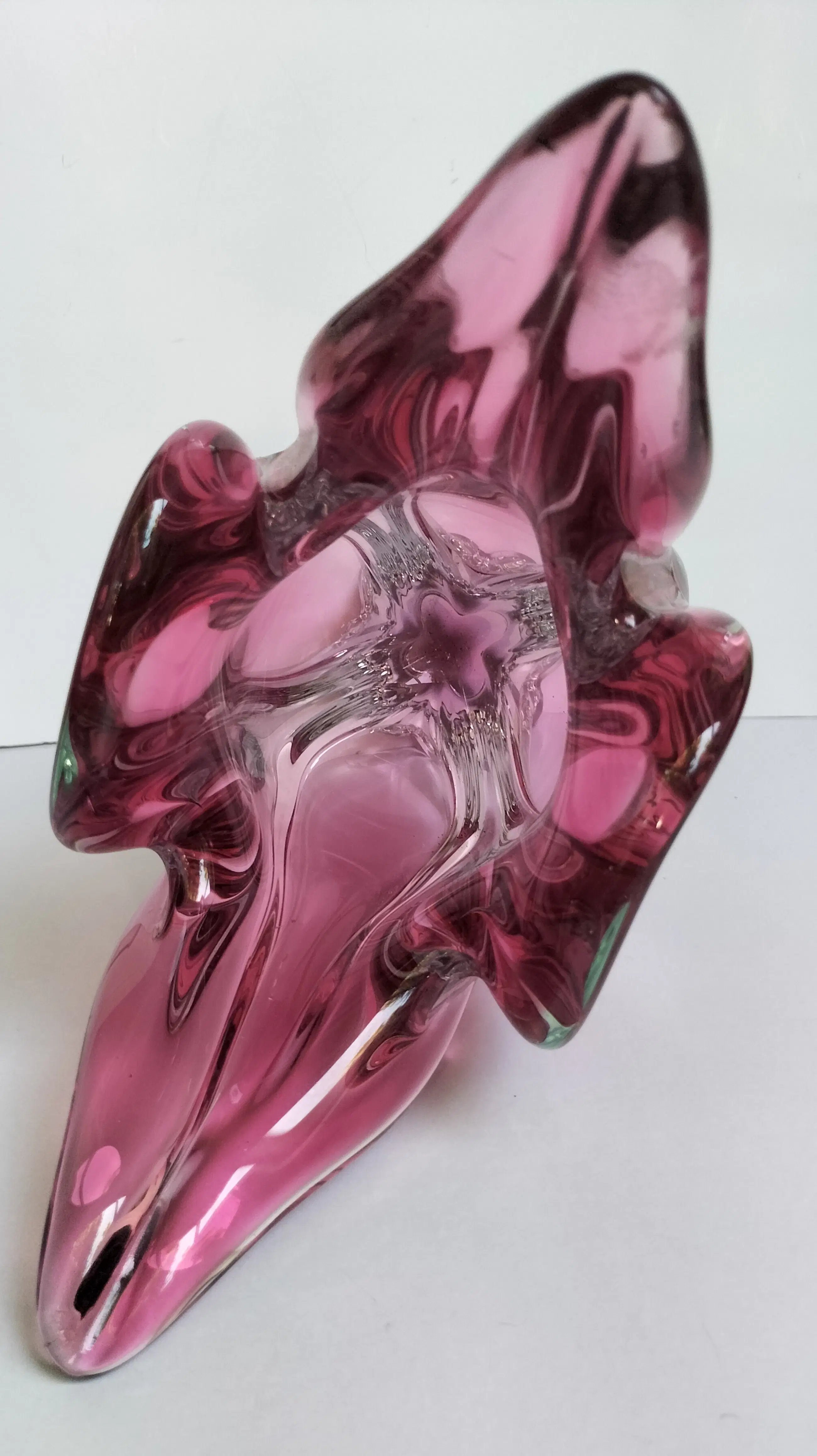 Dieses Modell ist auch als „Kattenkop“ (Katzenkopf) bekannt. Es besteht aus fuchsiafarbenem Glas mit transparentem weißem Glas und wird in der Sommerso-Technik hergestellt.