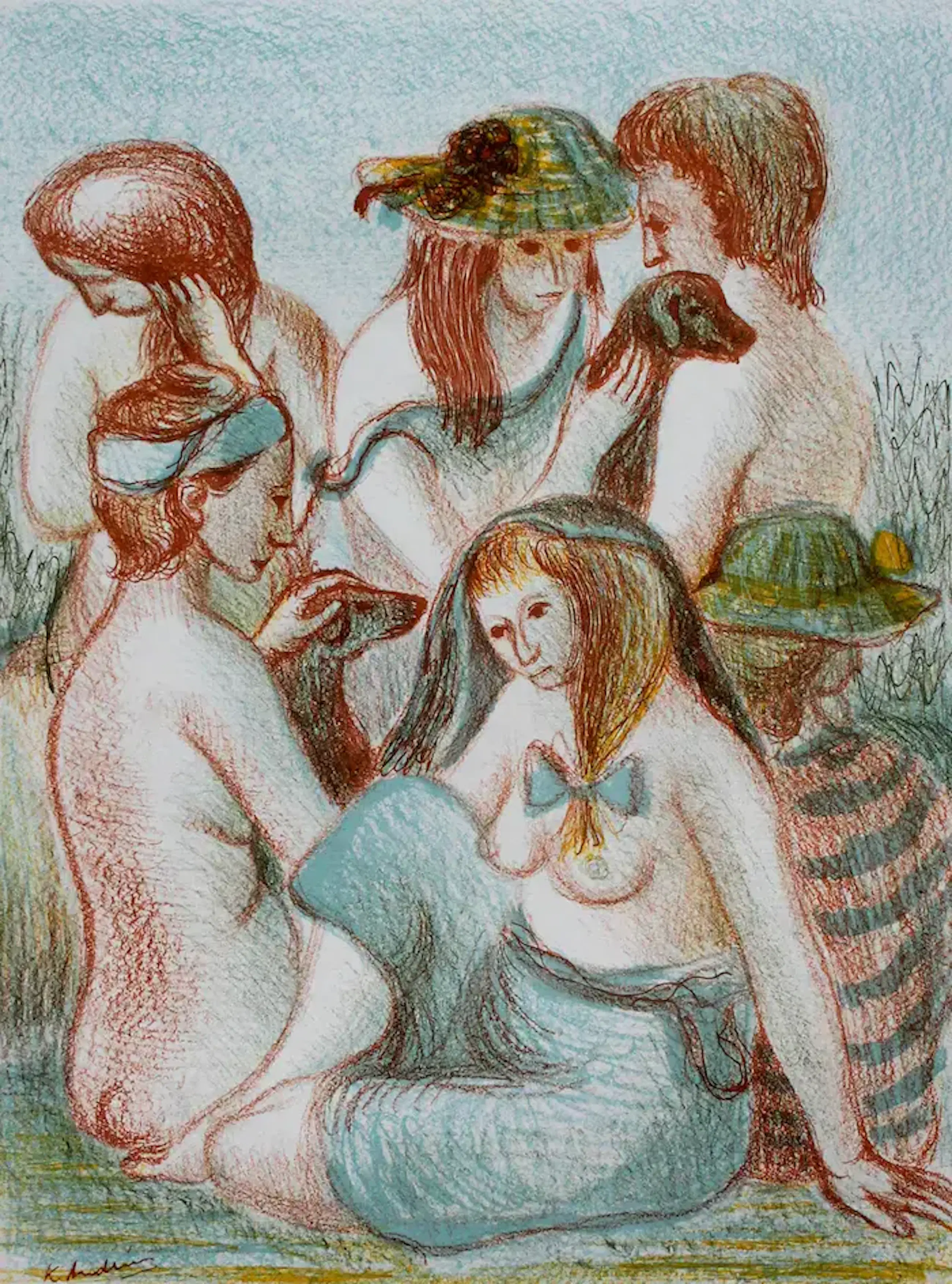 Farblithografie von Kees Andrea. Darstellung von fünf Badenden und einem Hund. Loseblatt, Bildgröße H40 x B29, Seitengröße H63 x B48. Unten links im Druck signiert „K.Andrea“. Provenienz: Schildersprenten Ausgabe 1947