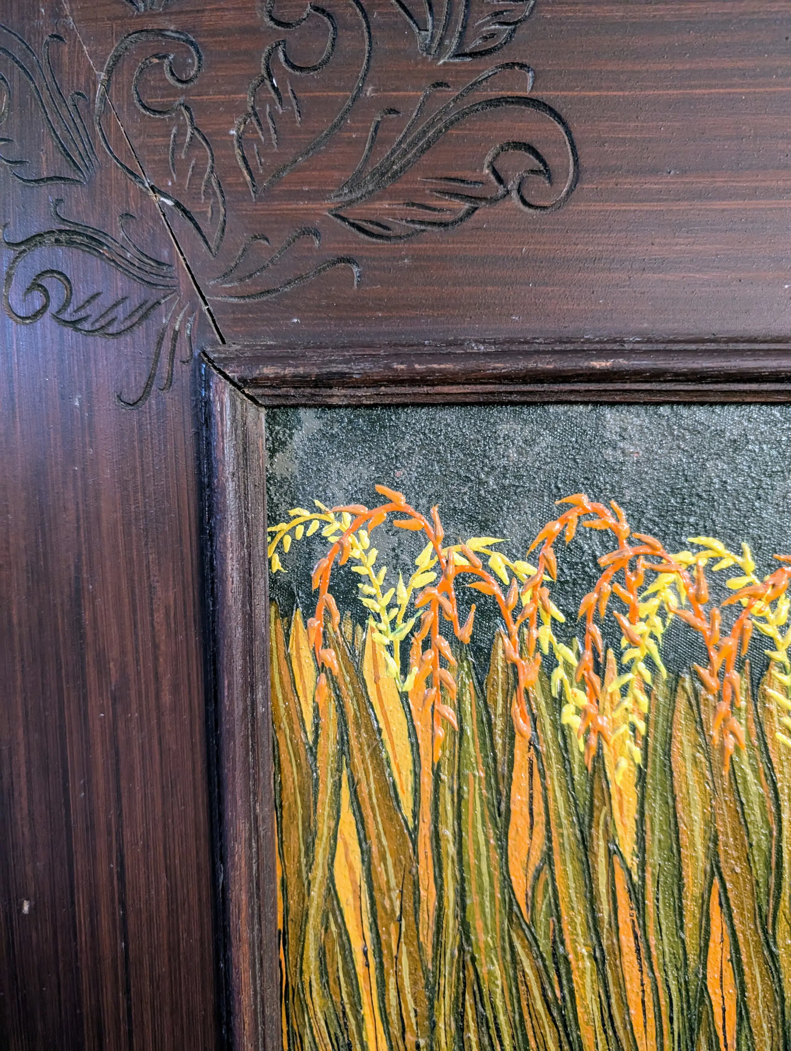 Ein wunderschönes Porträt einer orientalischen Schönheit mit tiefschwarzem Haar, das nahtlos in die Maserung übergeht. Dieses Werk kann sowohl horizontal als auch vertikal aufgehängt werden.