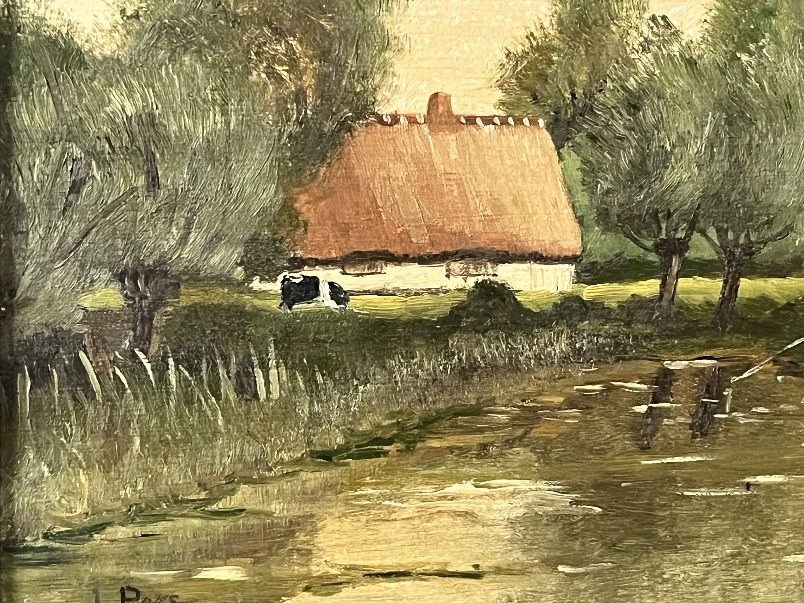 Das Werk stammt aus der ersten Schaffensperiode von Leo Pors Damals malte er noch klassische niederländische Landschaften. Schönes Gemälde im Holzrahmen. Auf dem Gemälde ist eine Szene zu sehen: ein Mann und seine Frau, Kühe rund um den Bauernhof in einer grünen Umgebung und Vögel am niederländischen Himmel.