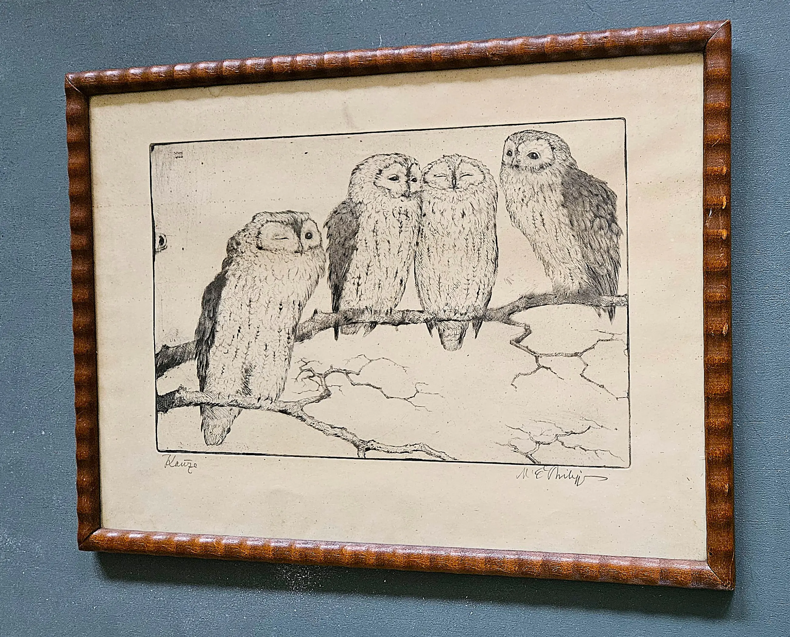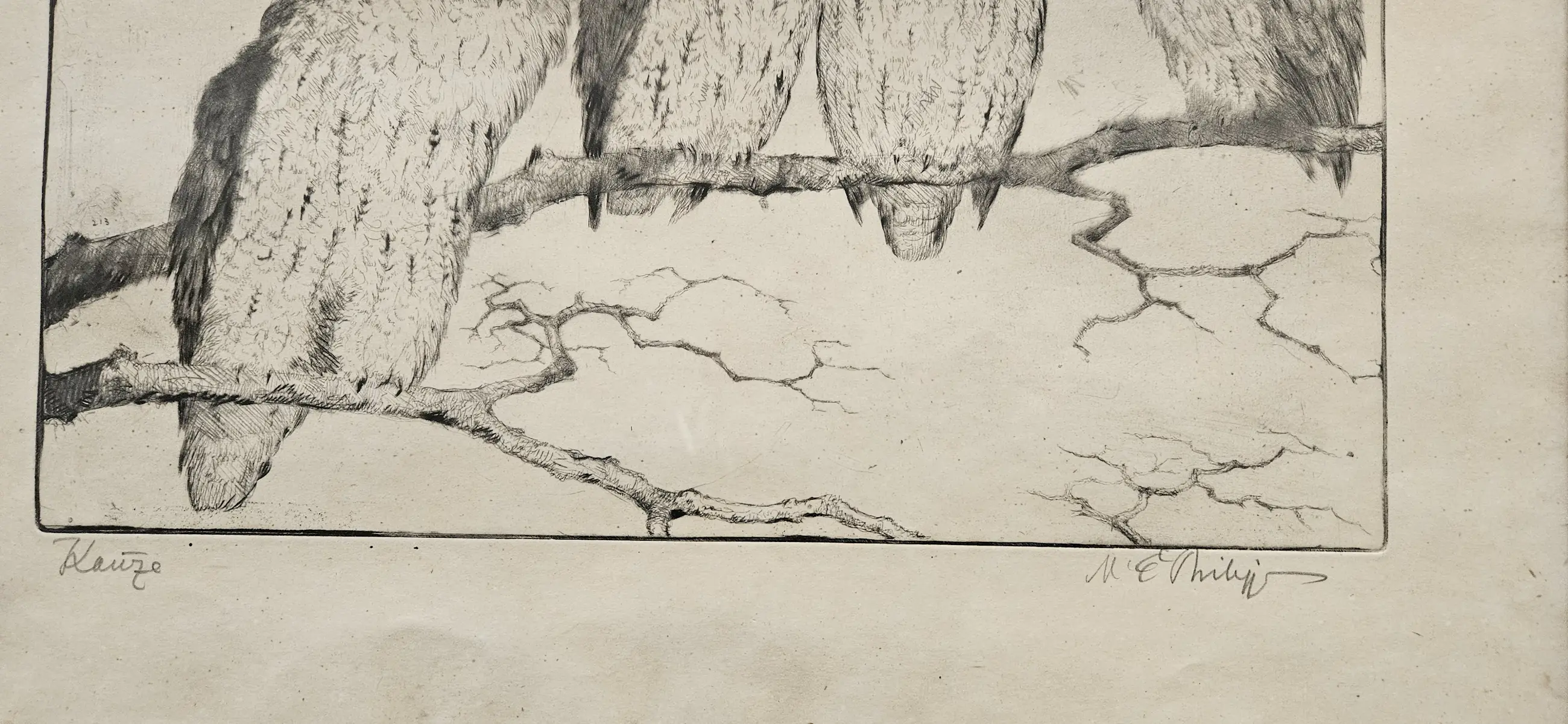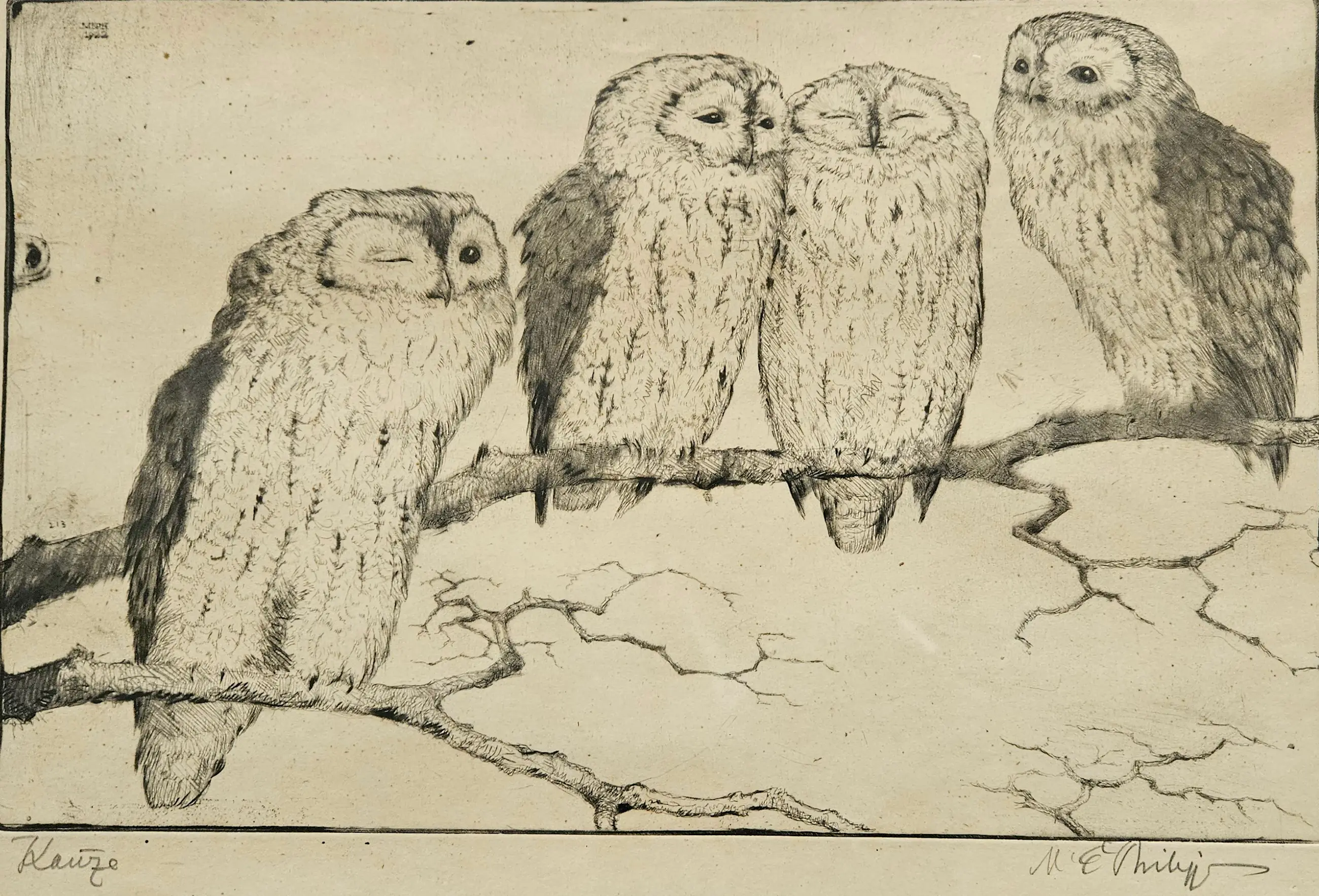 Martin Erich Philipp (1887–1978) Eulen auf einem Ast. Eine alte Radierung, die Eulen auf einem Ast zeigt. signiert mit Bleistift Maße: H. 22 x B. 34 cm. Mit Rahmen H. 34 x B. 47 cm. Zustand: in gutem Zustand mit Gebrauchsspuren