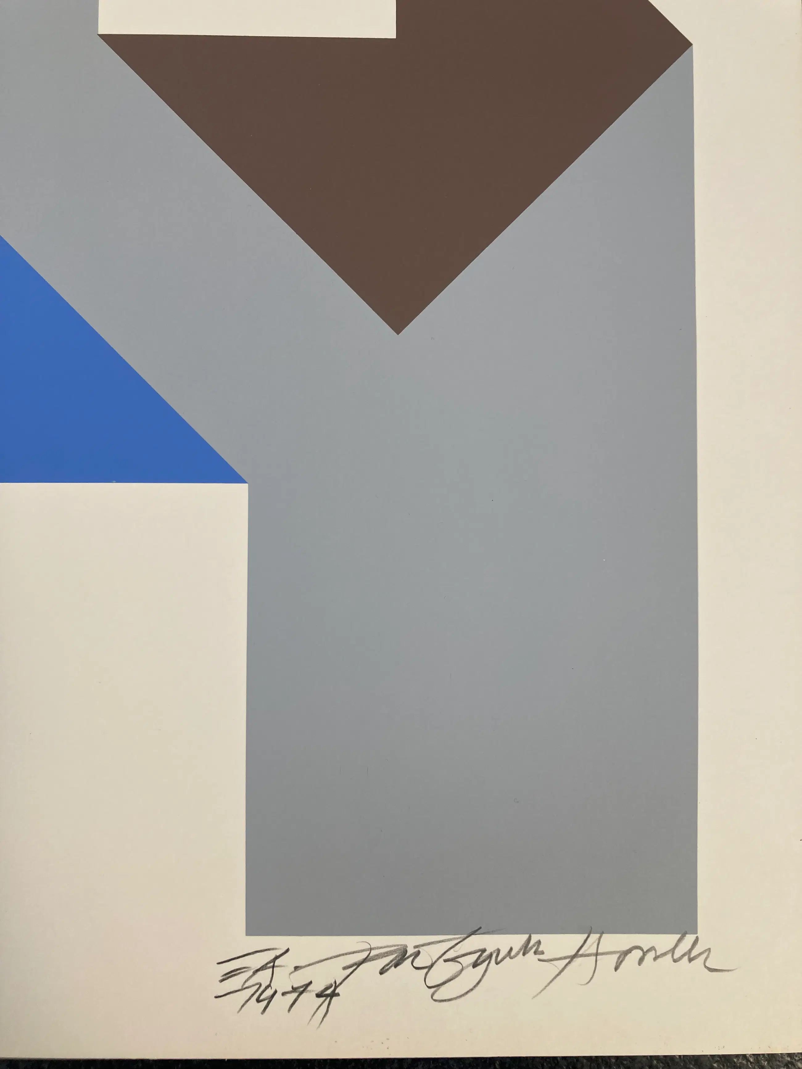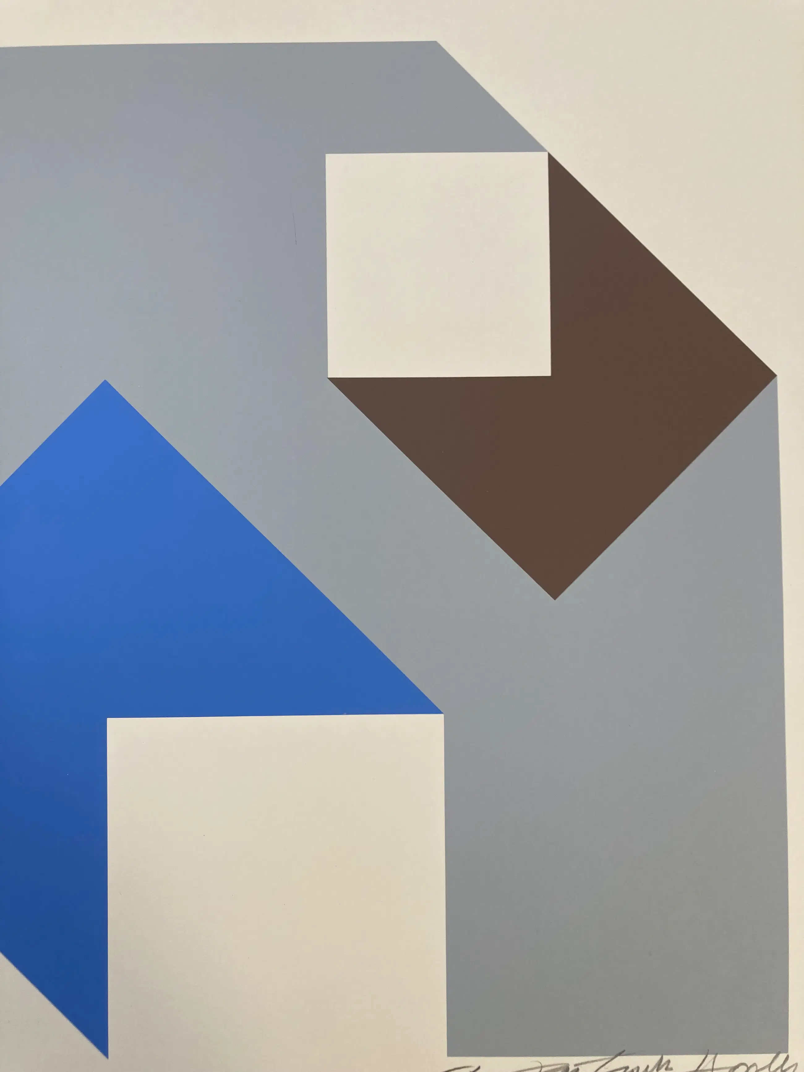 Typischer Siebdruck mit Relief- und geometrischen Merkmalen.