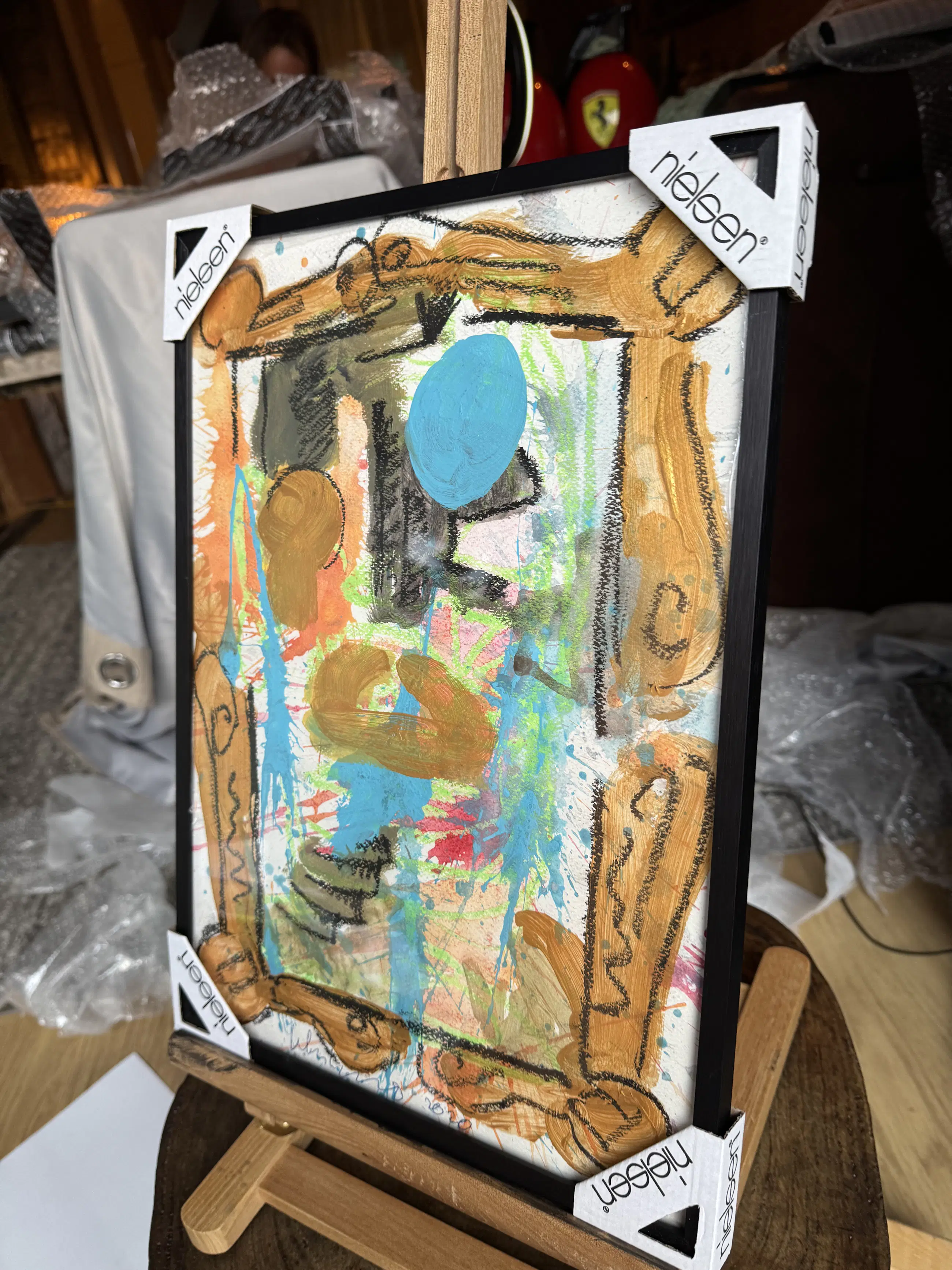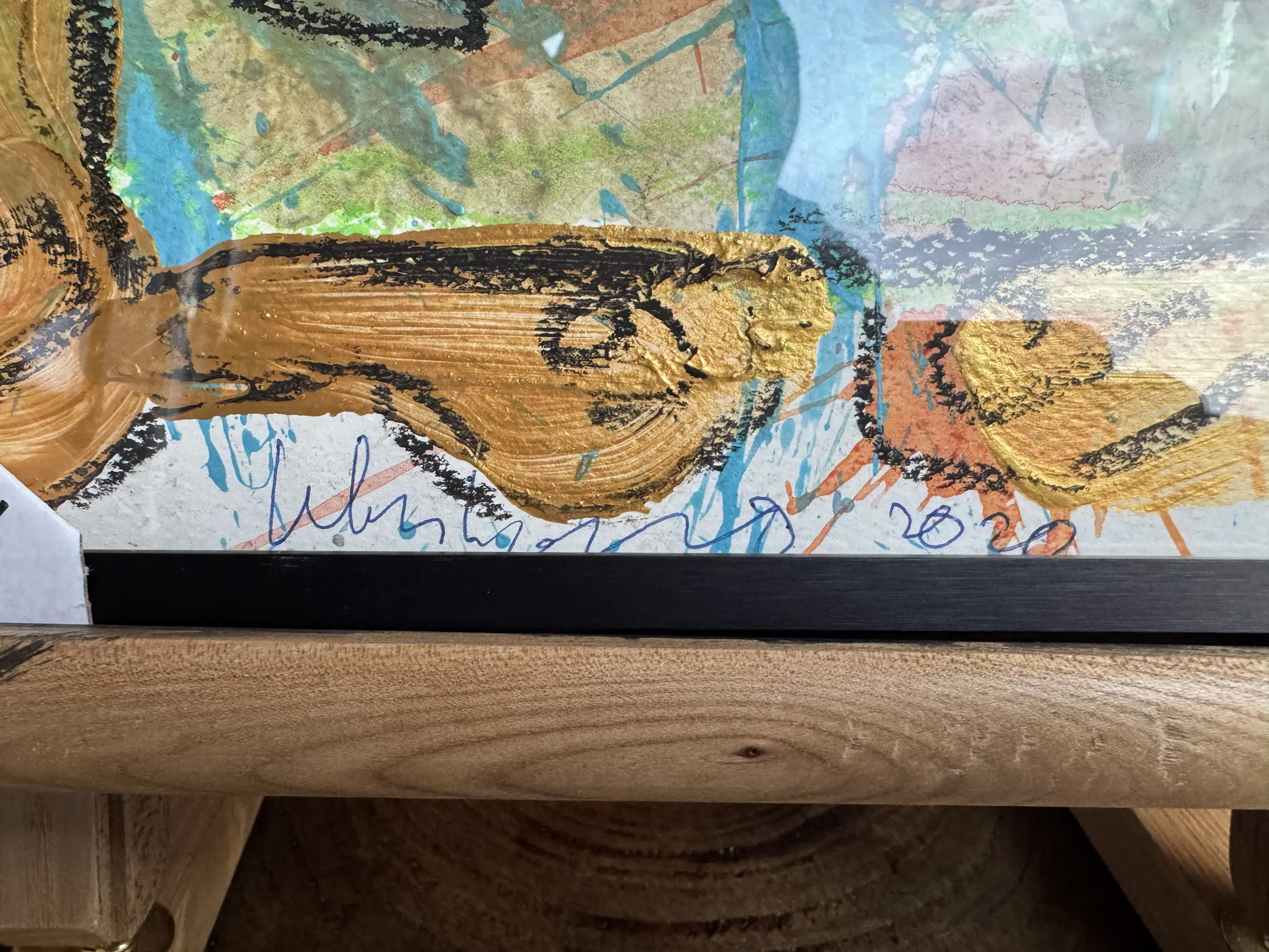 Originalwerk mit markantem goldfarbenen Rahmen und abstrakten Figuren