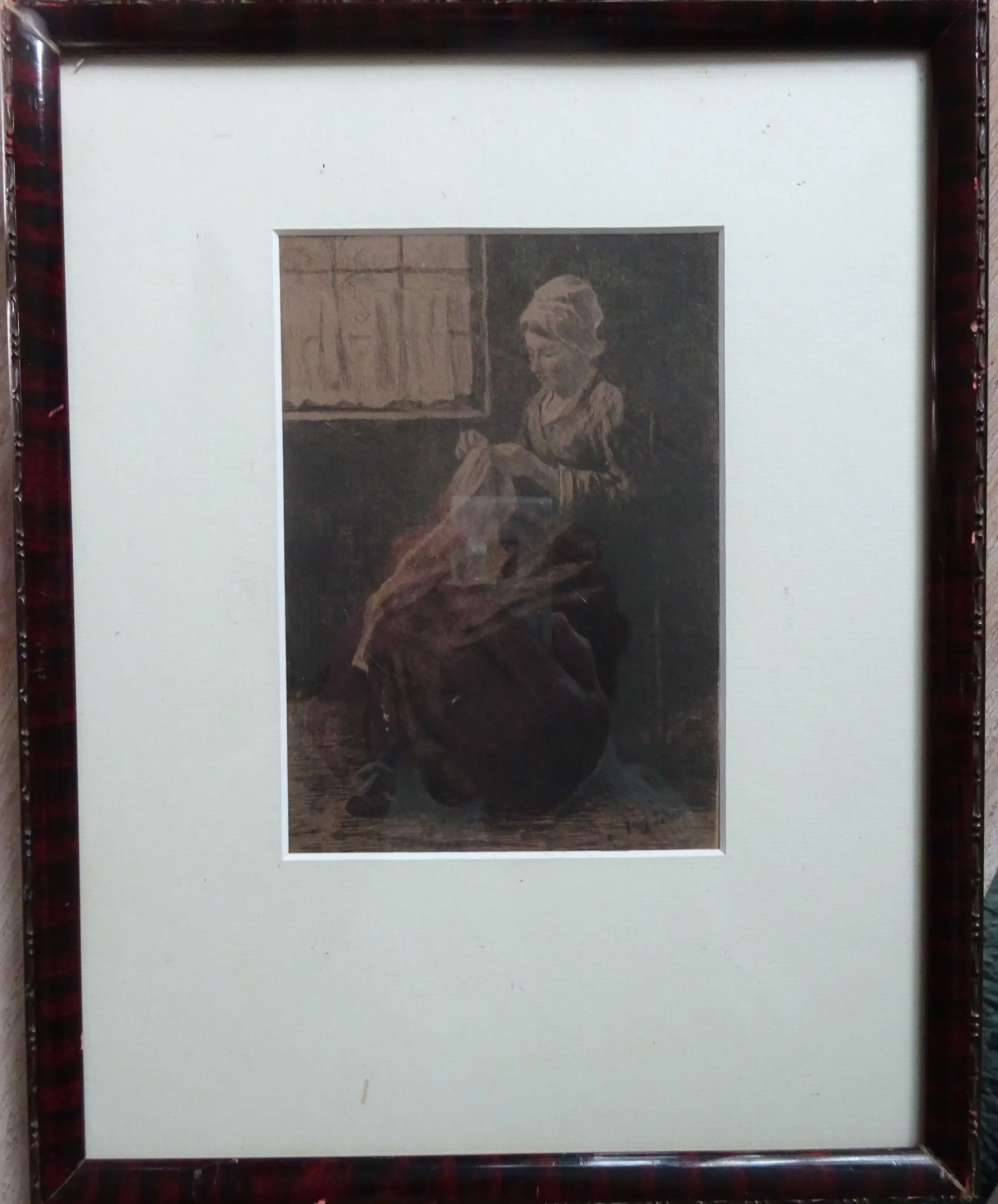 Radierung „Die kleine Schneiderin“ nach Josef Israëls, eine Frau in traditioneller Tracht bei Ausbesserungsarbeiten.
