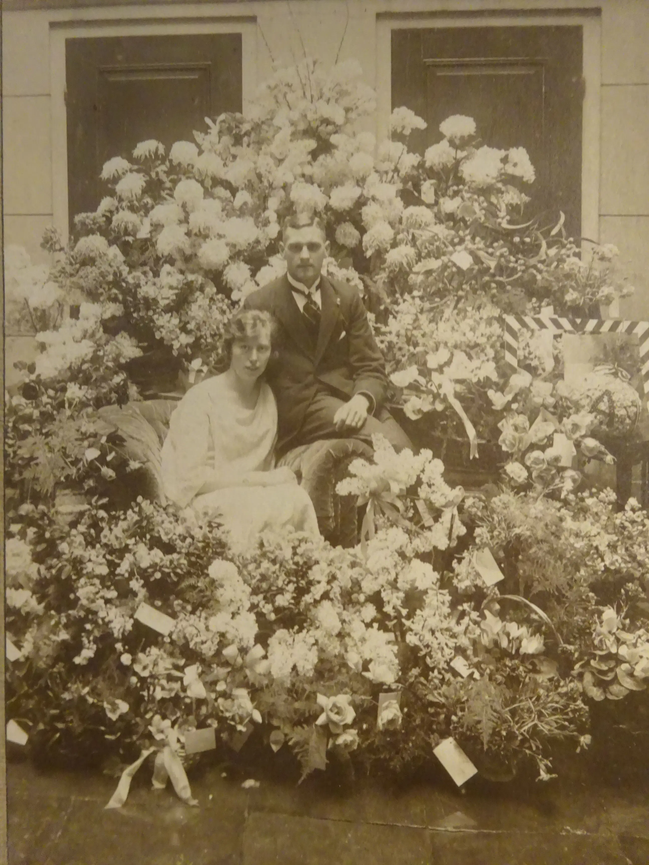 Die Radierung ist hinter einem Foto eines Brautpaares inmitten eines Blumenmeers montiert. (Siehe Foto)