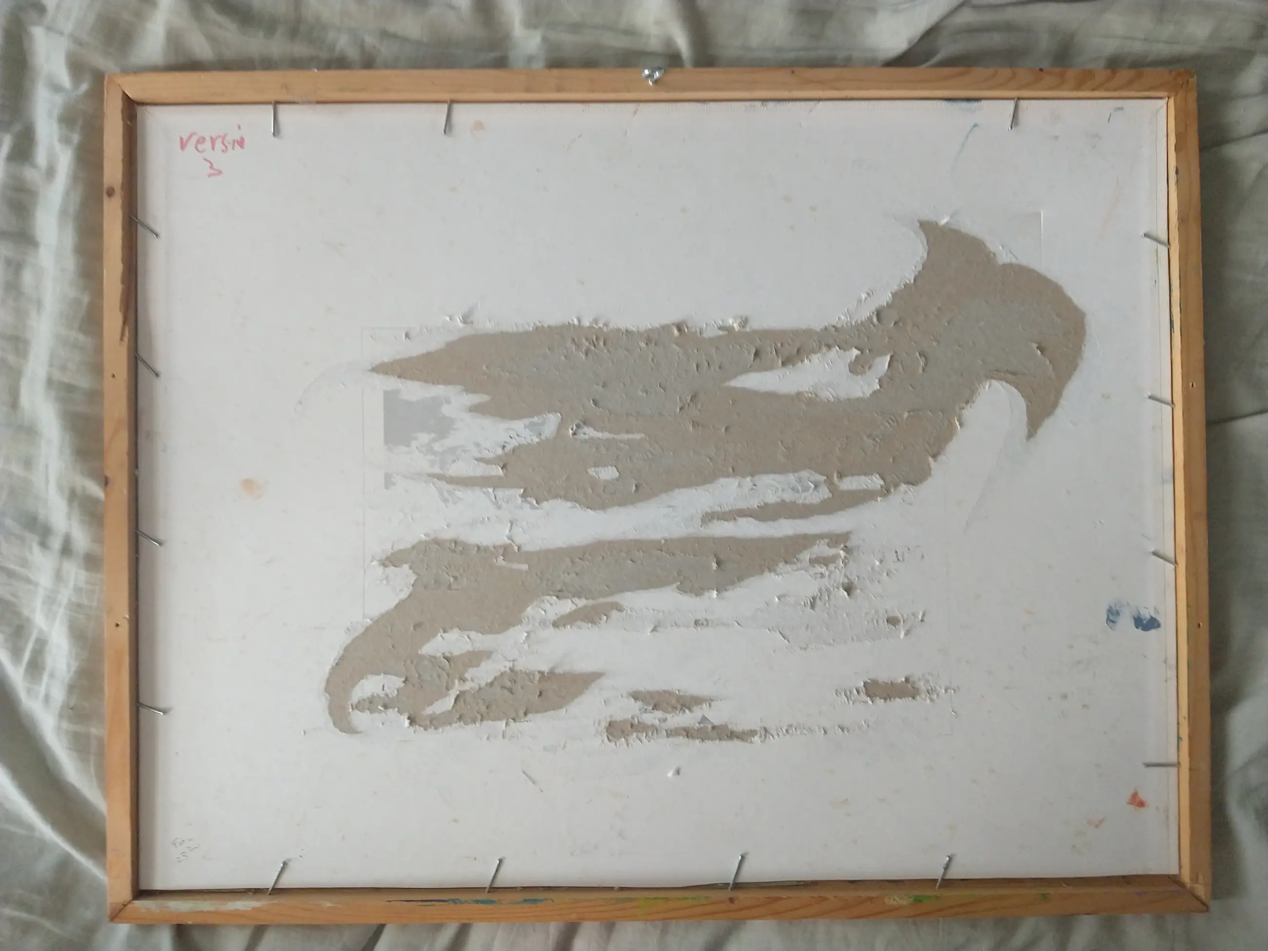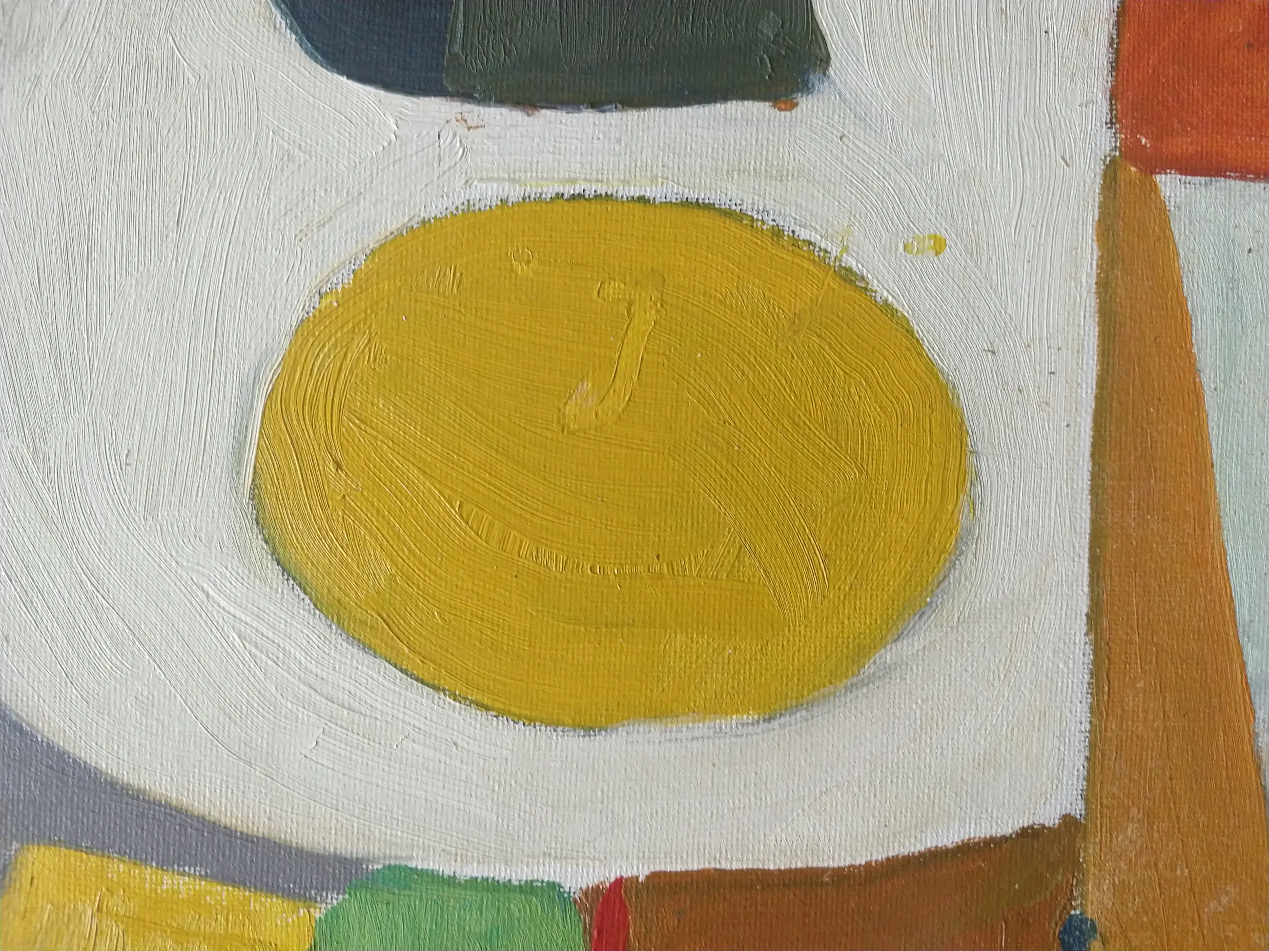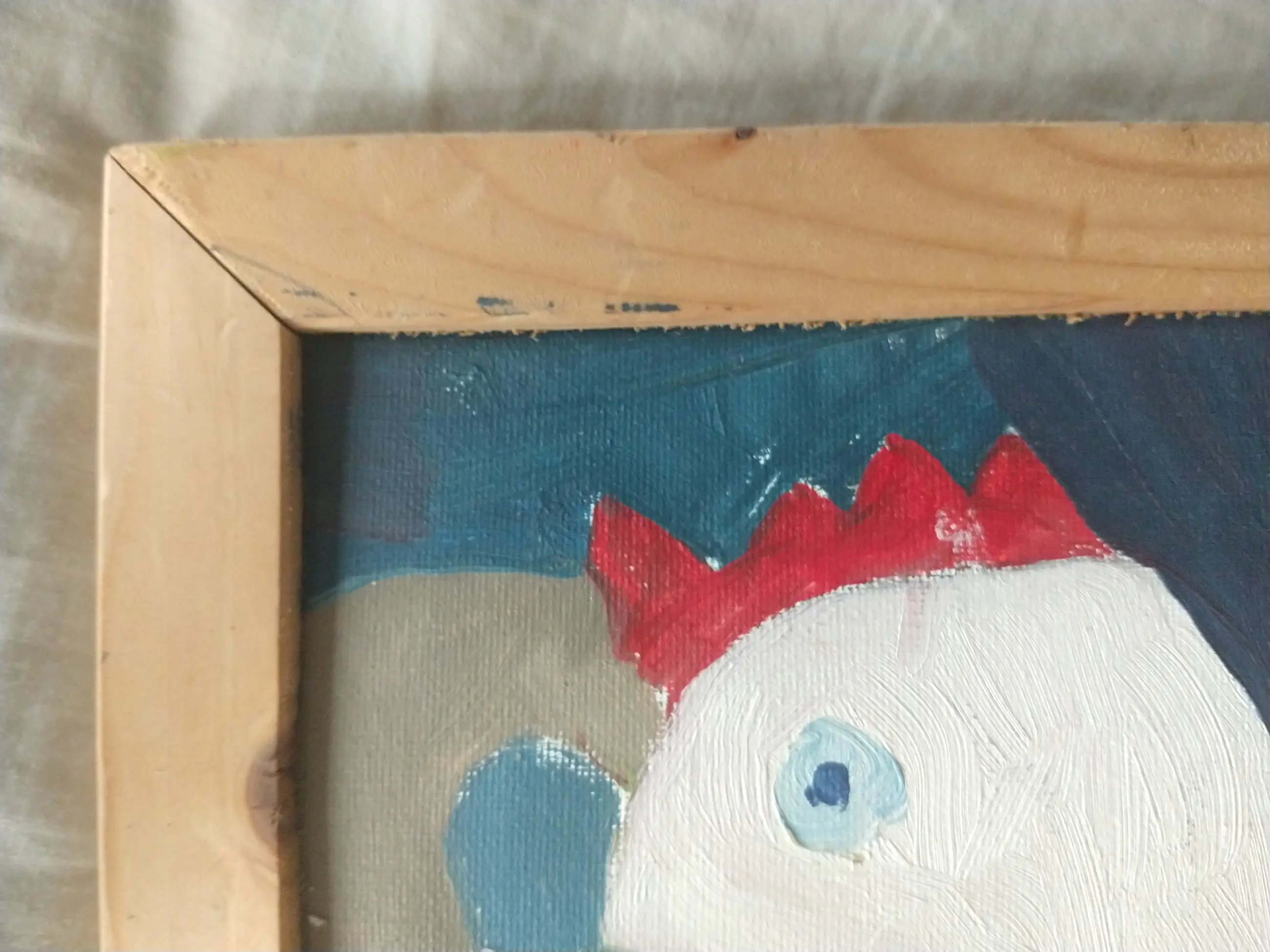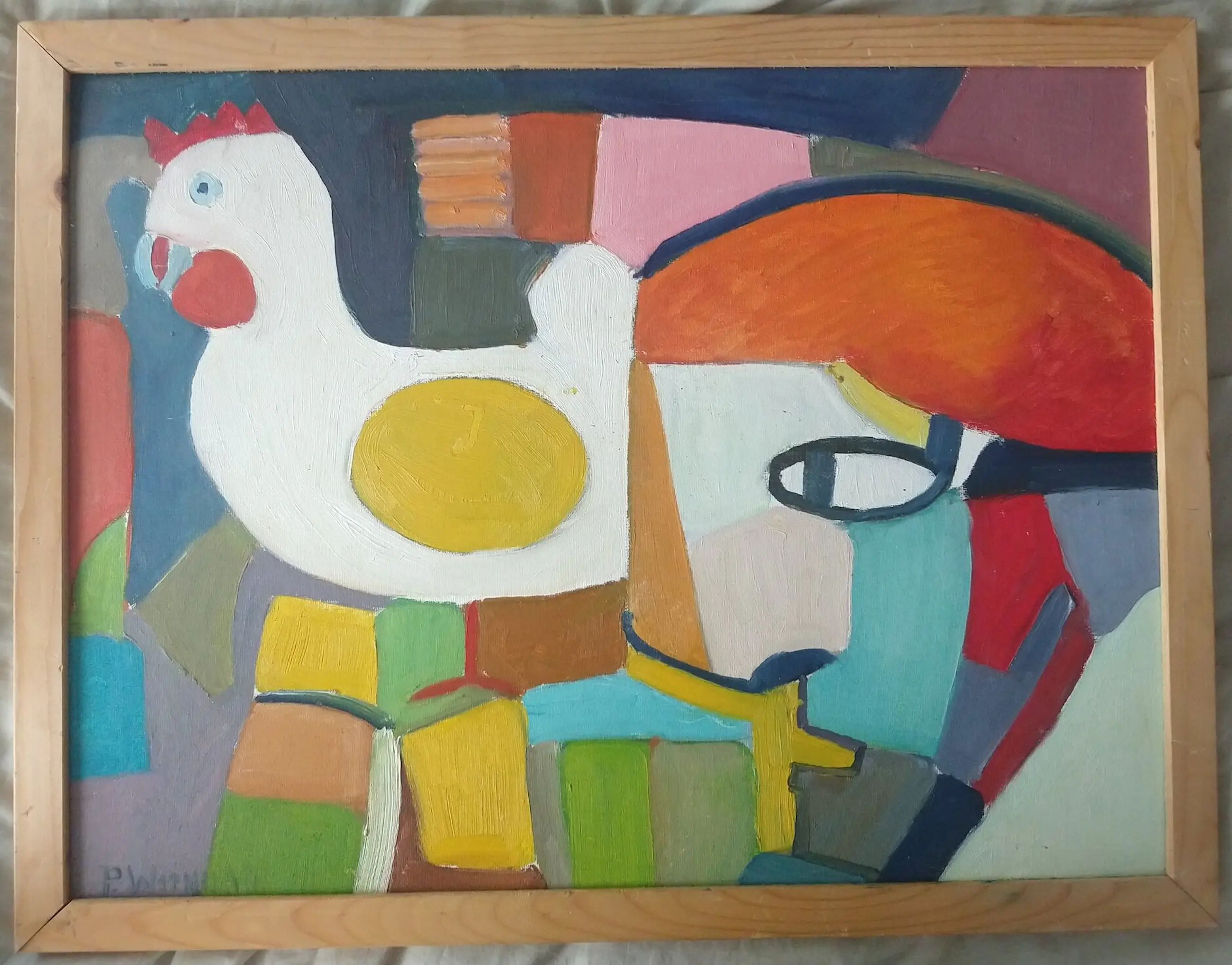 Piet Wiegman (II). Figur mit Huhn. Auf der Rückseite steht in roter Schrift: Version 3. Der Künstler hat dieses Motiv möglicherweise in mehreren Varianten gemalt. Öl auf Leinwand. Das Gemälde ist in gutem Zustand. Die Leinwand weist eine leichte, auf den ersten Blick unauffällige Wölbung auf.