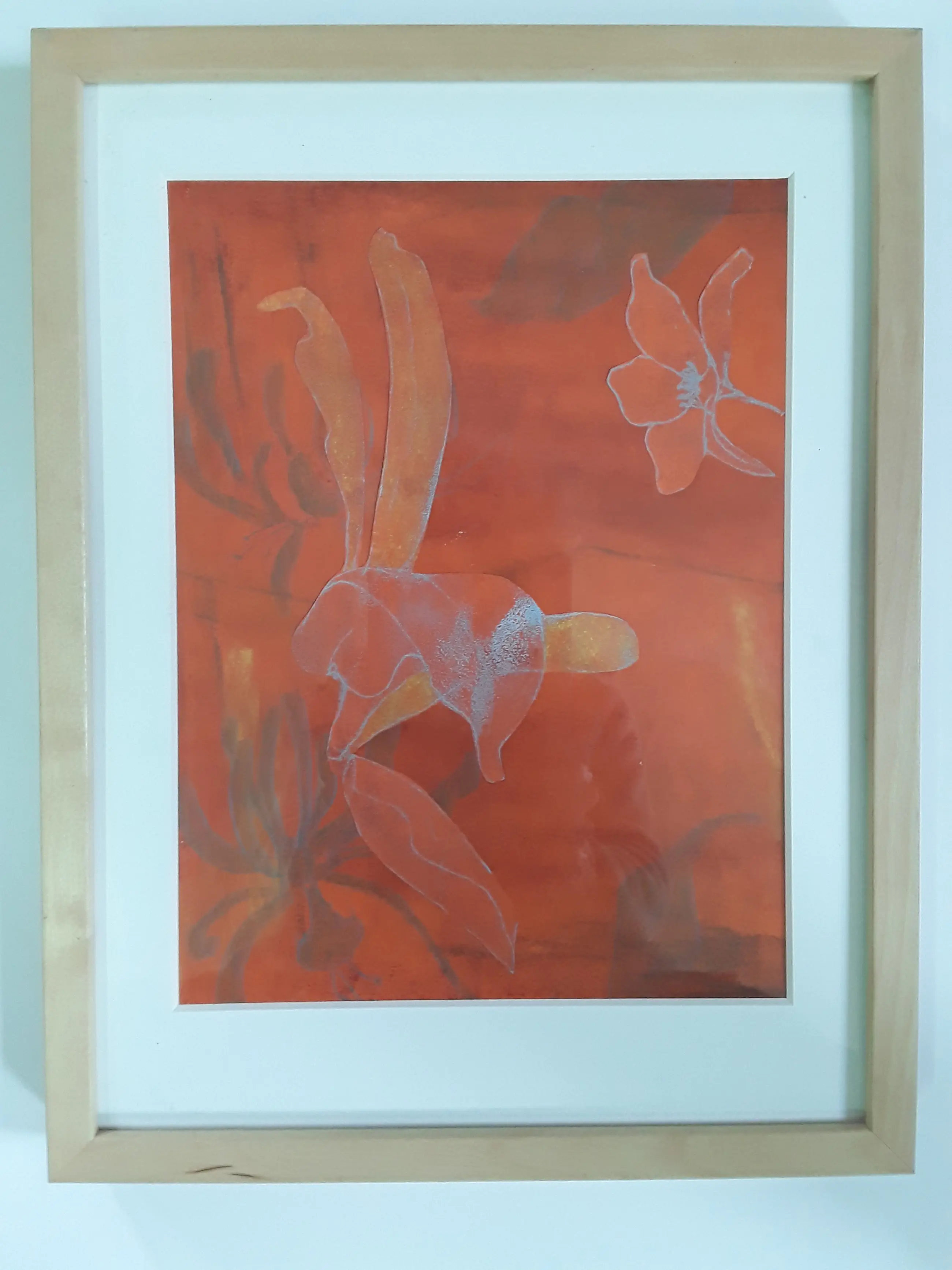 Delen van monoprints van bloemen(de Lis) zijn opnieuw verwerkt in een collage. Deze laat een helder en warm kleurenpalet zien met een duidelijke compositie. In een passe partout van 30 bij 40 cm is het een aangenaam werk om naar te kijken.
