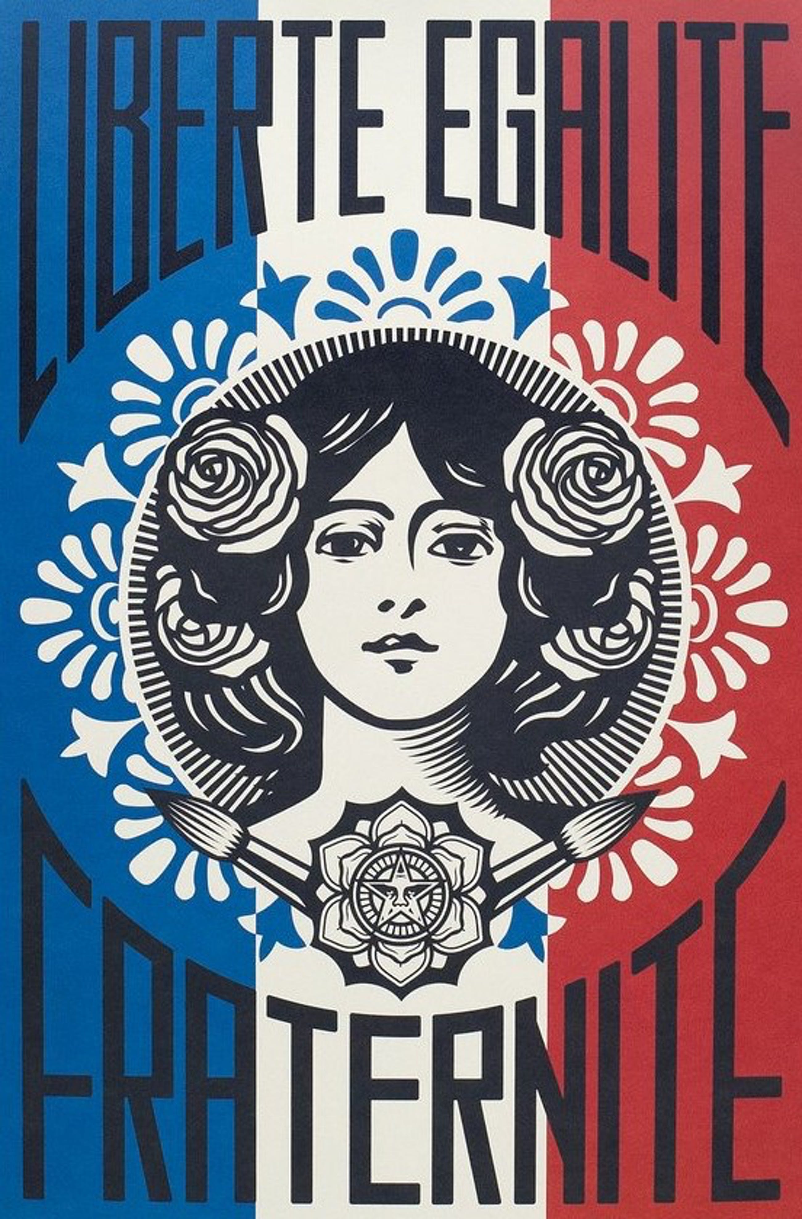 Print van Shepard Fairey op speckletone papier: Liberté, égalité, fraternité. Bekend van zijn muurschildering in Parijs.
