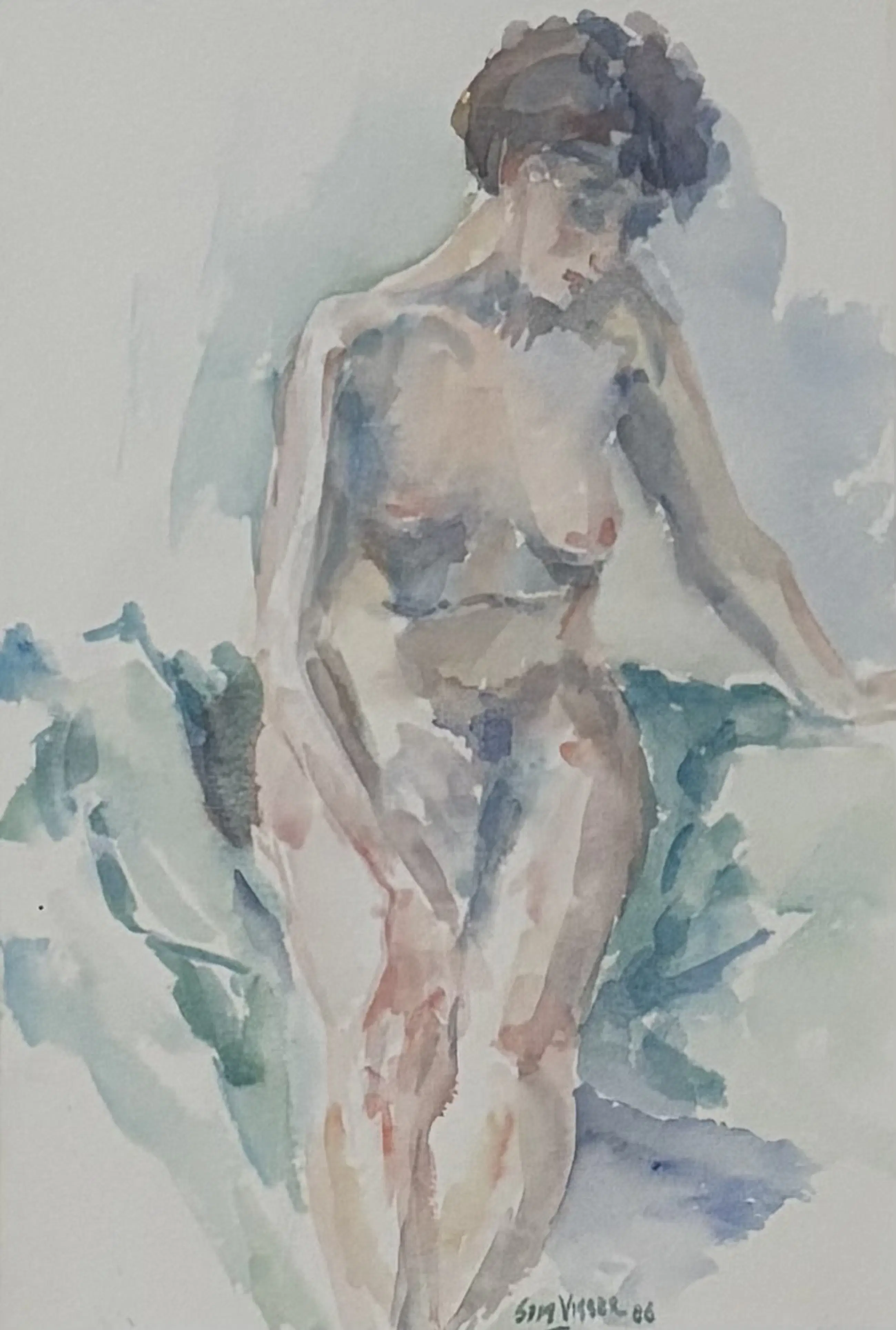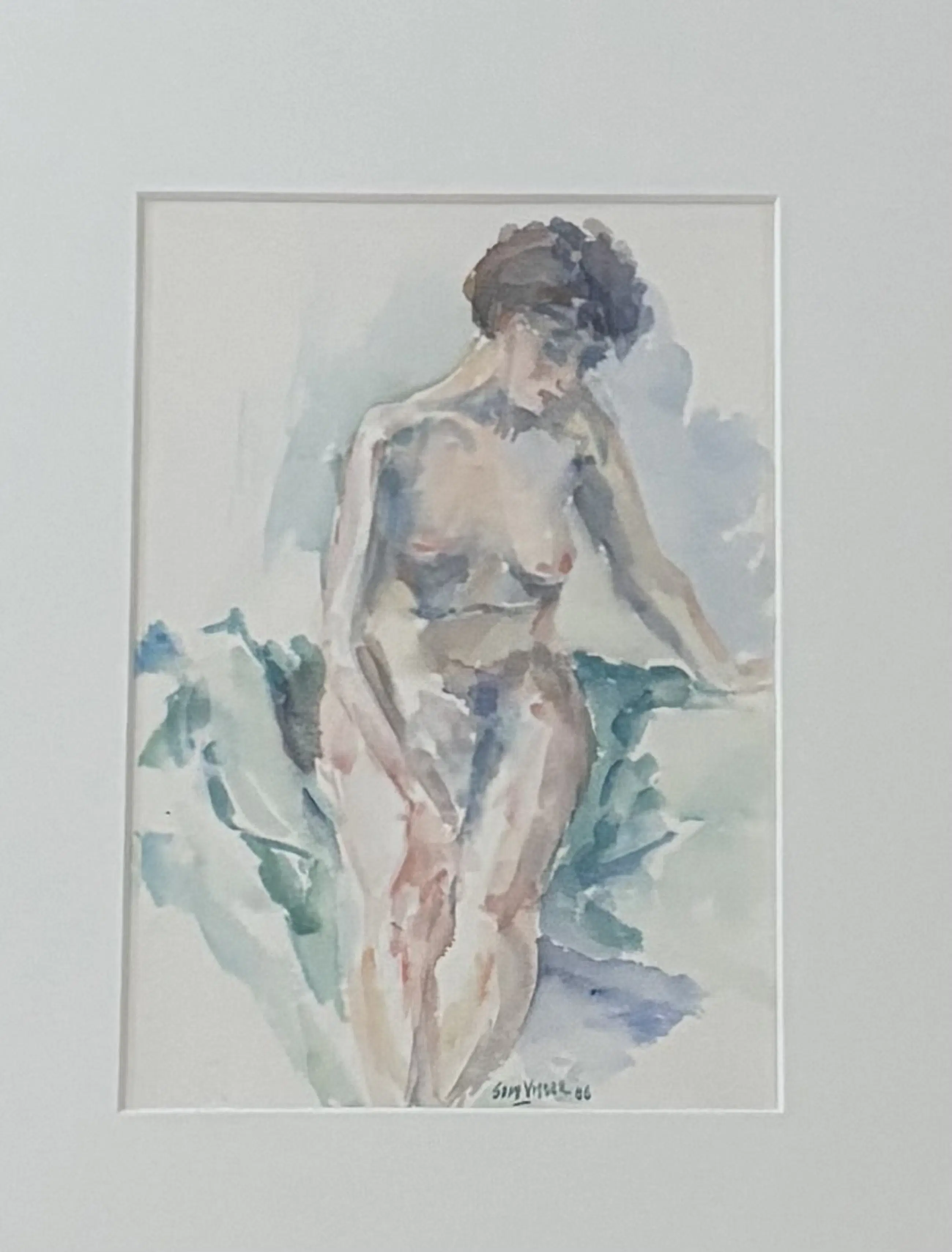 Aquarell in sanften Tönen einer nackten Frau Wunderschön gerahmt in einem Nielsen-Rahmen