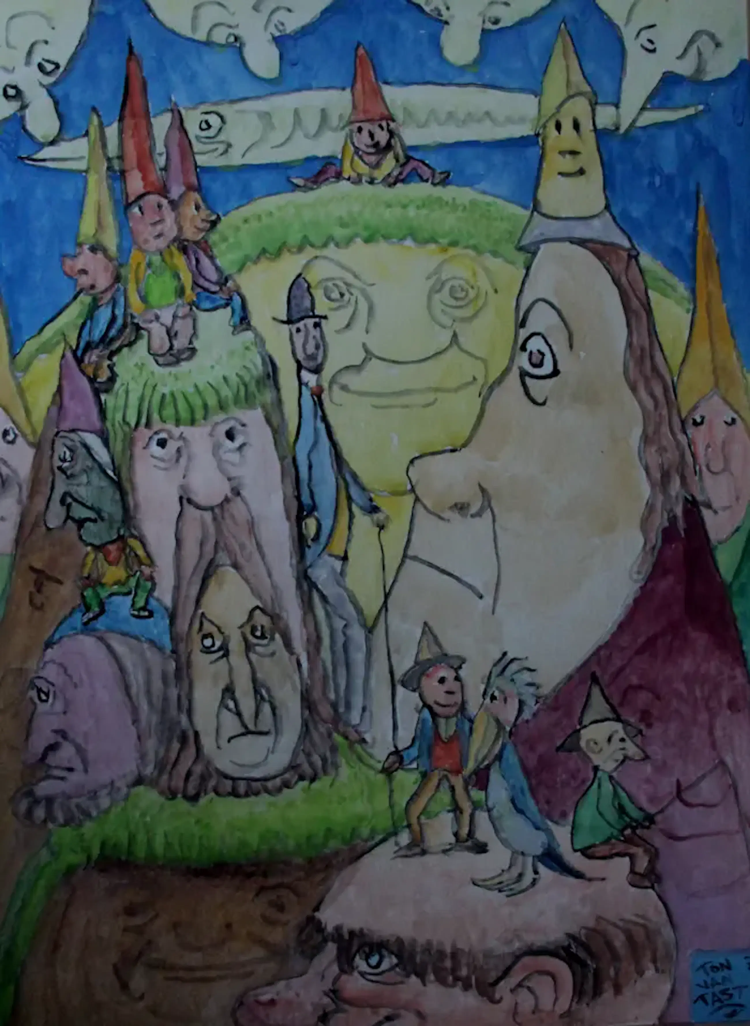 Ton van Tast - Aquarell: Surrealistische Komposition mit riesigen Puppen und Gnomen – 1971