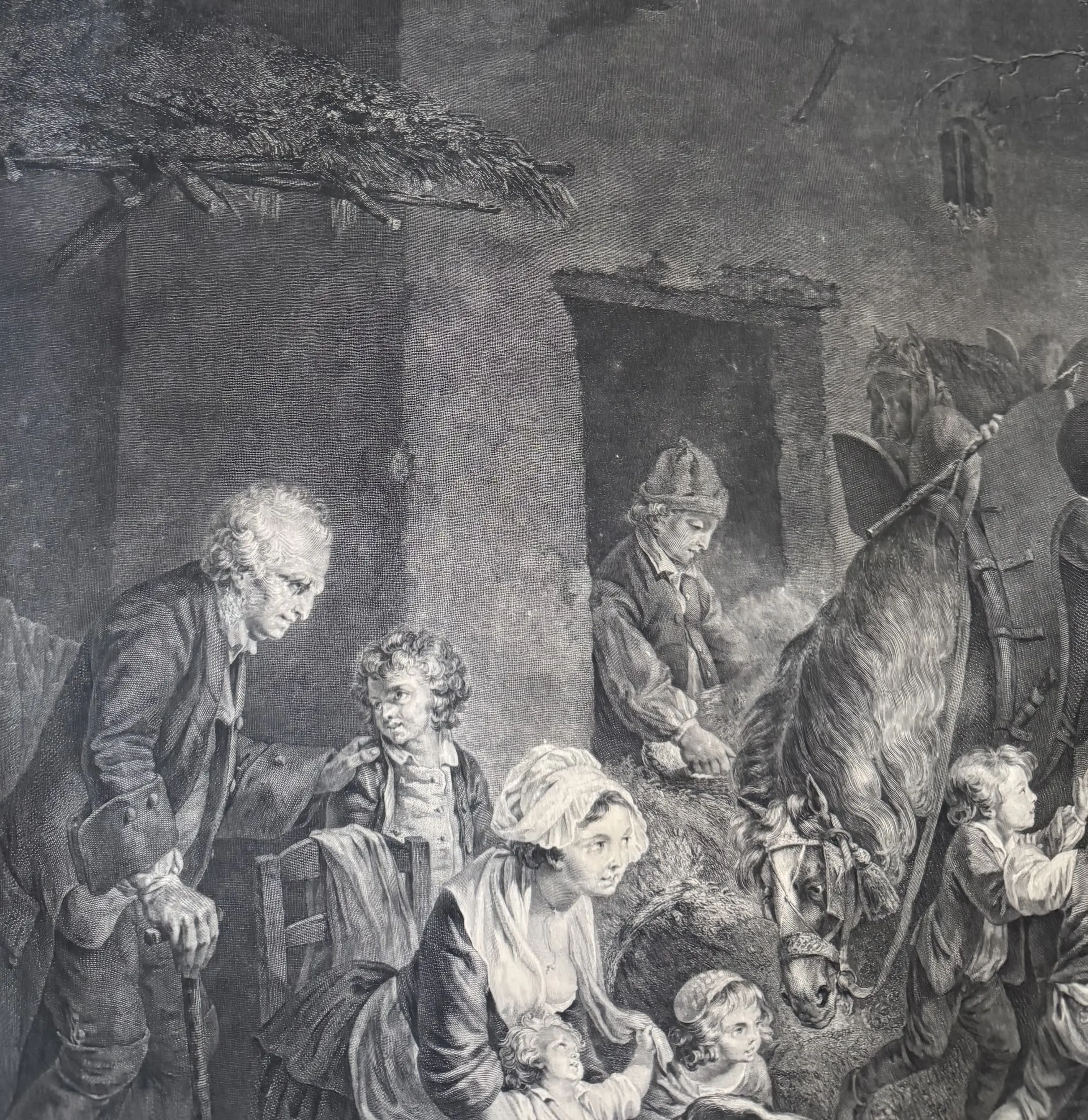 Kupferstich von Charles Benazech aus dem Jahr 1781 Inklusive Rahmen, jedoch ohne Glas. Titel: Le Retour Du Laboureur. (Die Rückkehr des Pflügers)