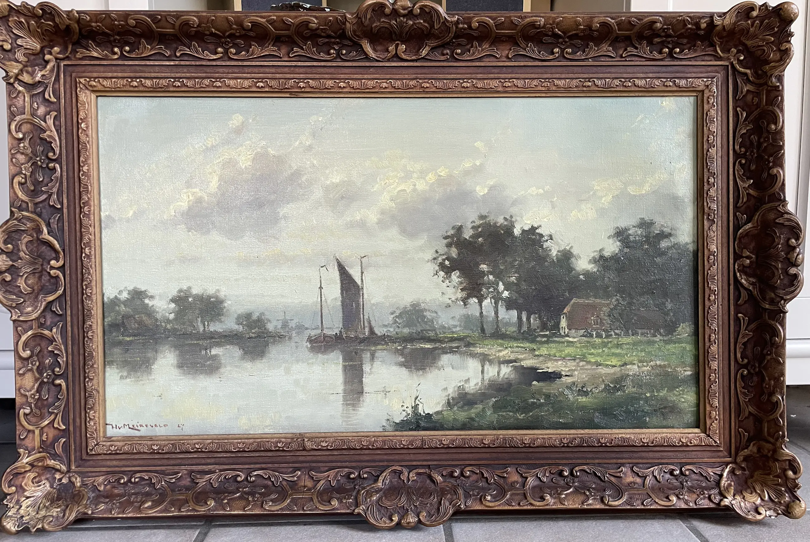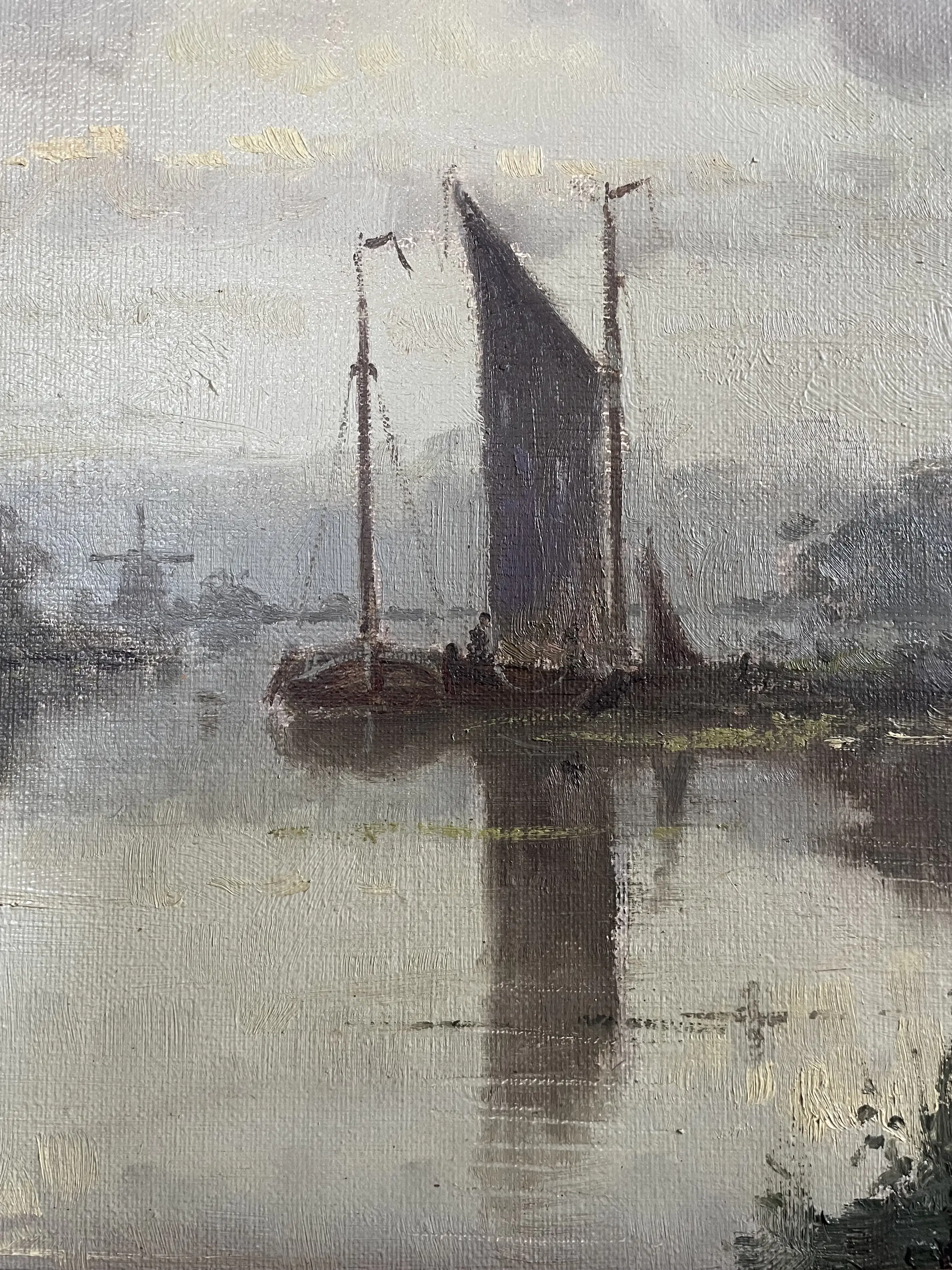 Zeitgenössisches Motiv von Frachtschiffen an einem Binnengewässer. In der Nähe des Ufers steht eine Hofstelle. Im Hintergrund ist die Silhouette einer Windmühle zu erkennen.