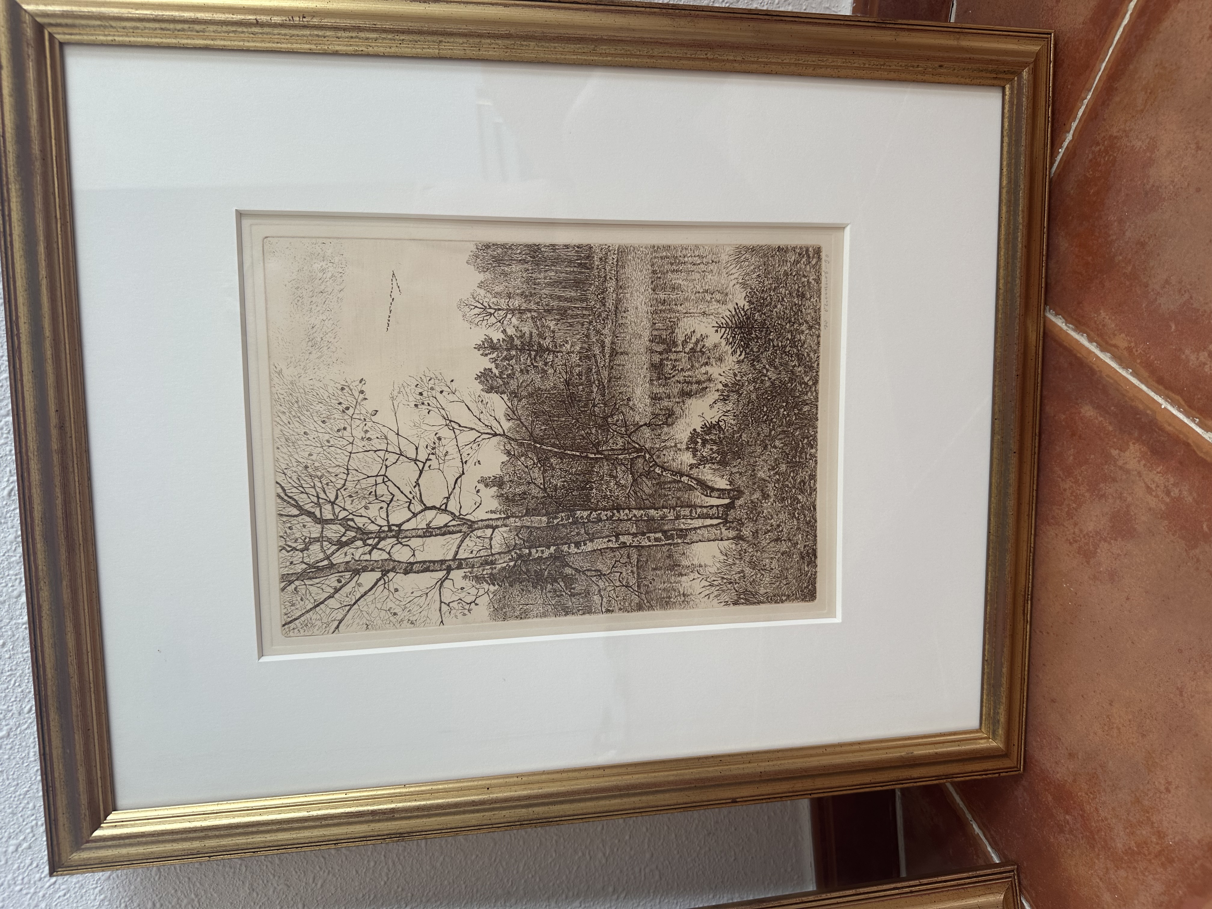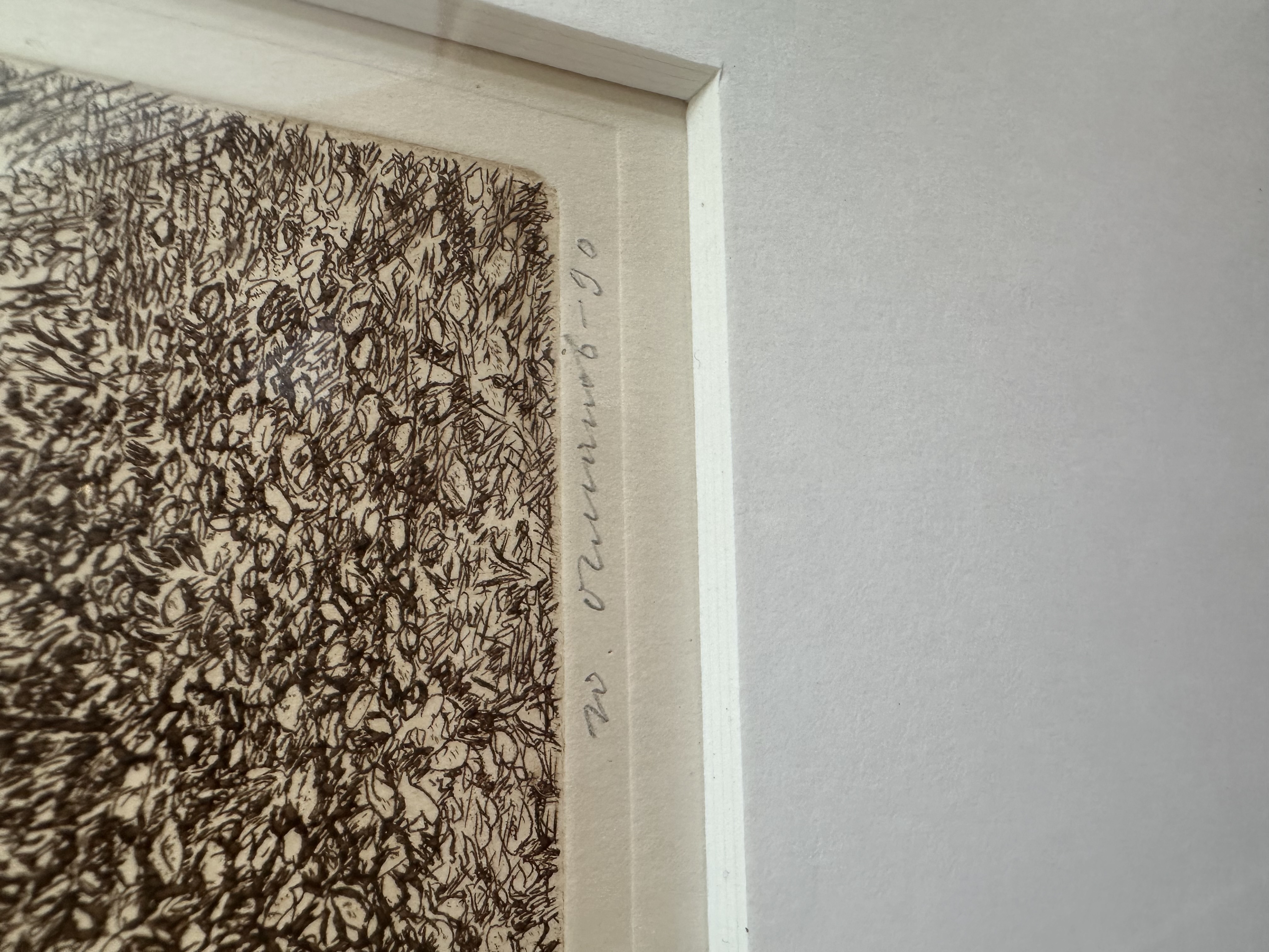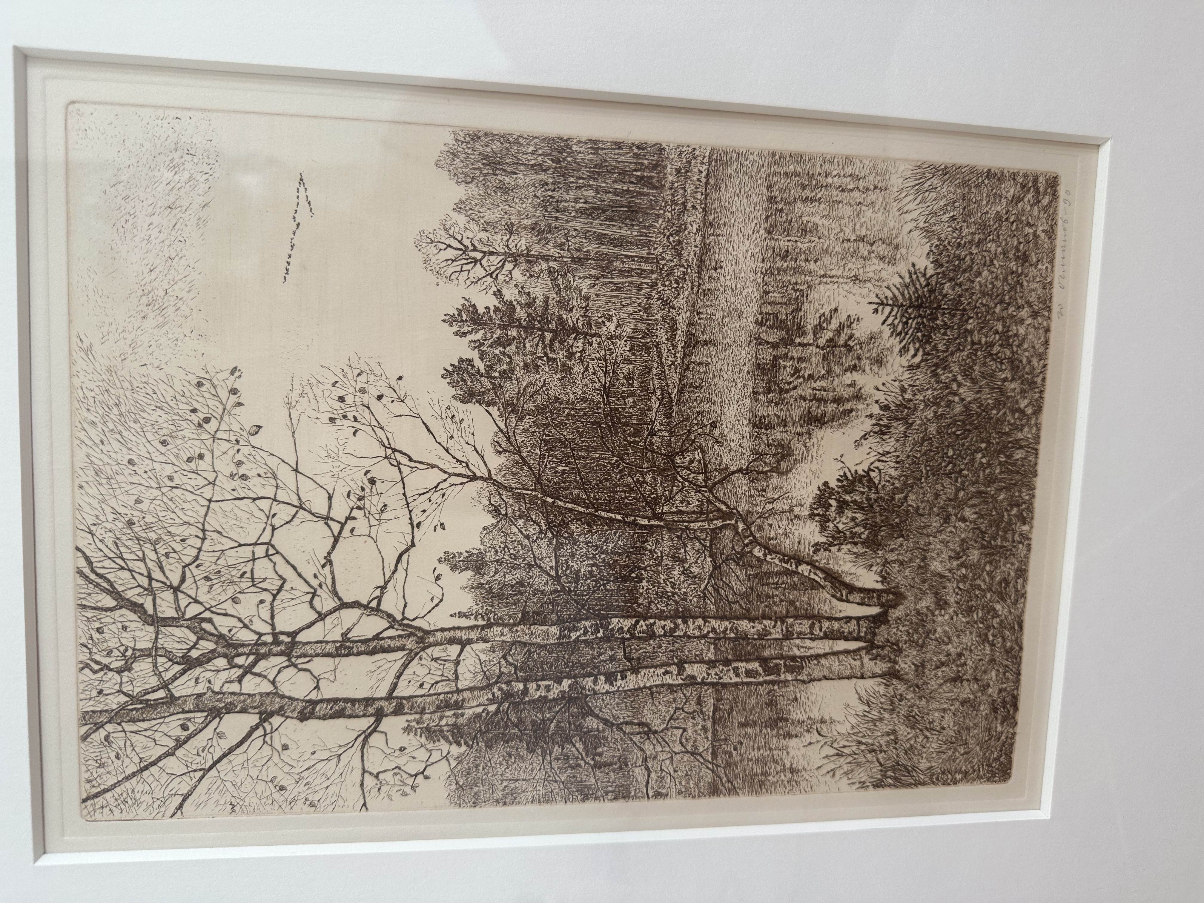 Realistische Radierung oder Gravur einer nordeuropäischen/skandinavischen Landschaft in dunkelbraunen Linien. Signiert, der Künstler ist jedoch unbekannt. Entstanden 1989 bzw. 1990. Beide sind ordentlich gerahmt.