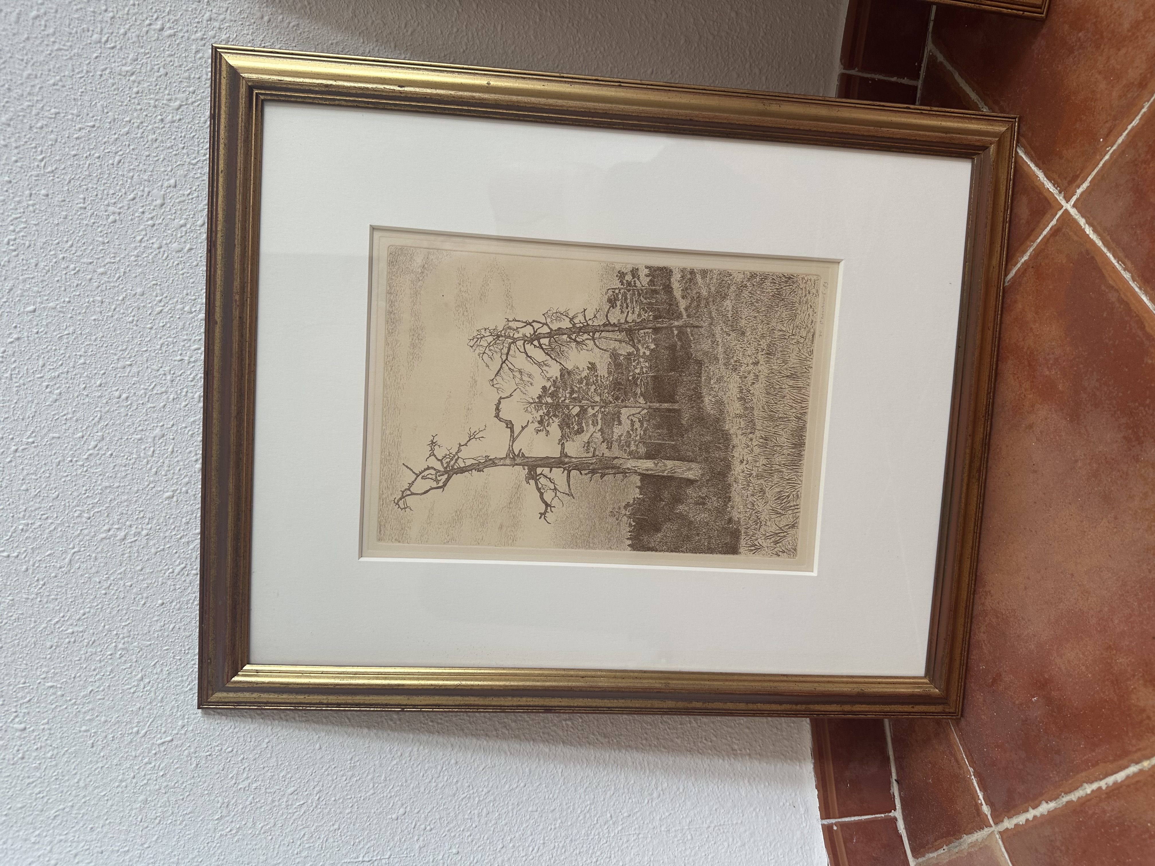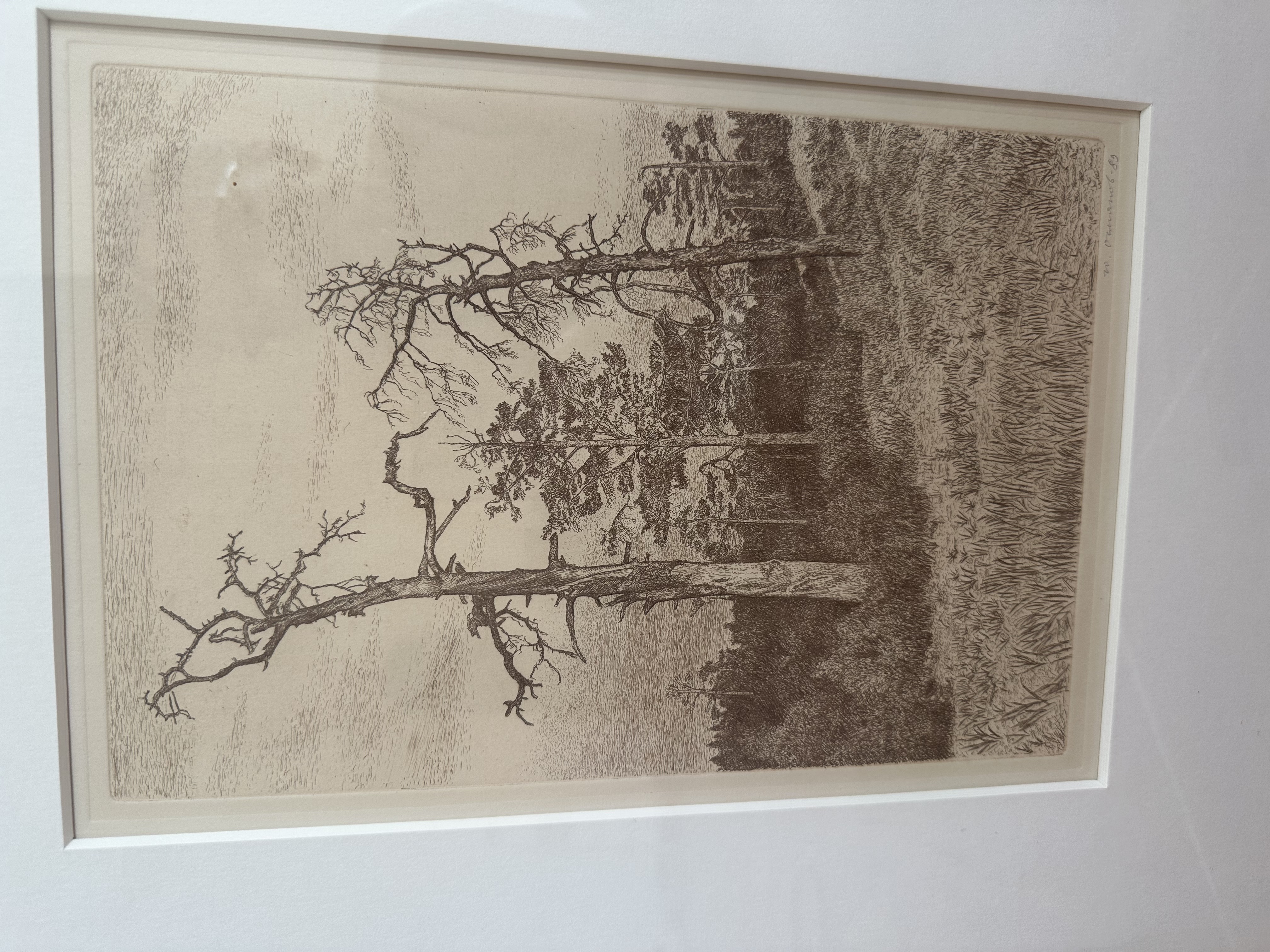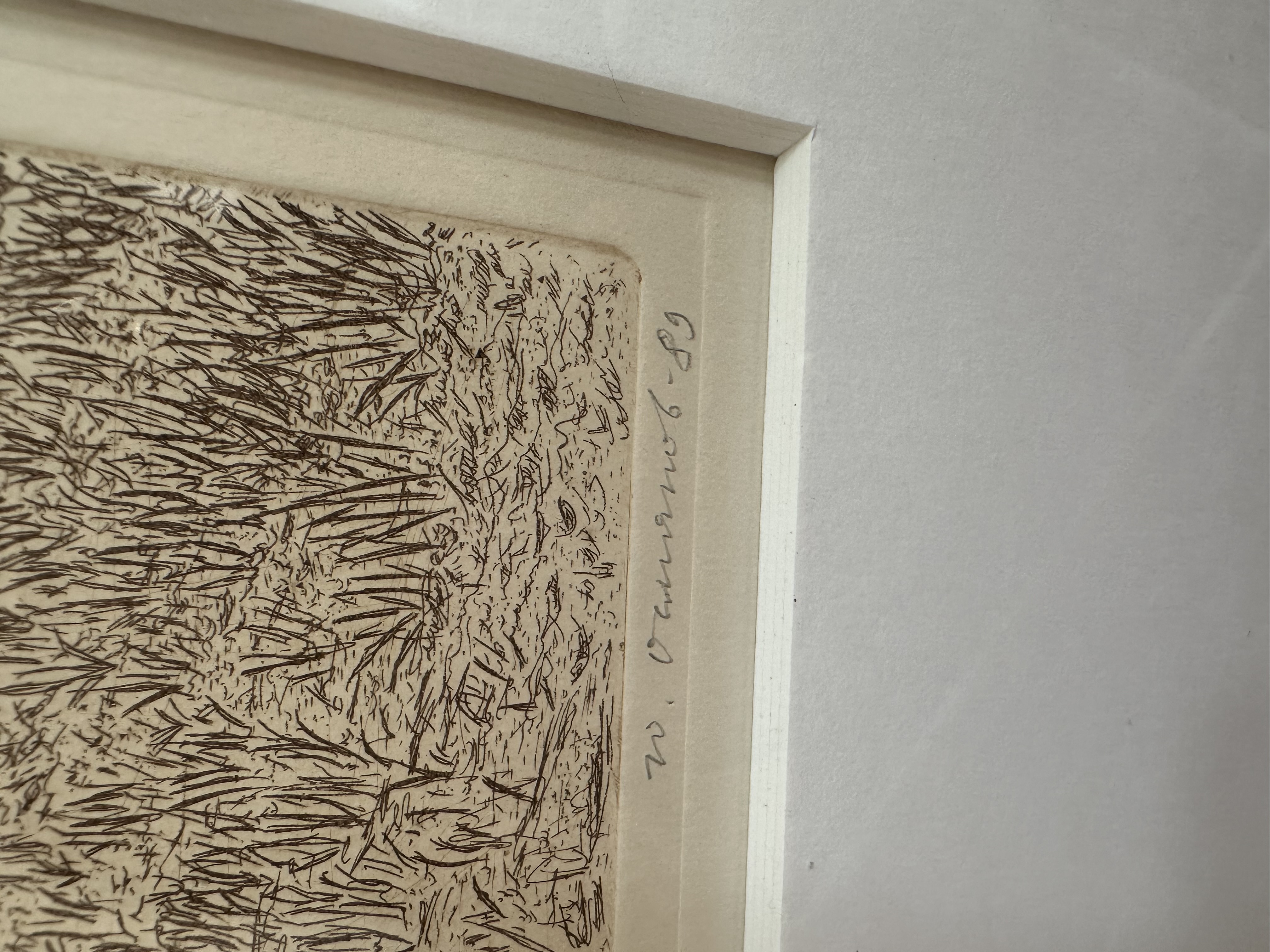 Realistische Radierung oder Gravur einer nordeuropäischen/skandinavischen Landschaft in dunkelbraunen Linien. Signiert, der Künstler ist jedoch unbekannt. Entstanden 1989 bzw. 1990. Beide sind ordentlich gerahmt.