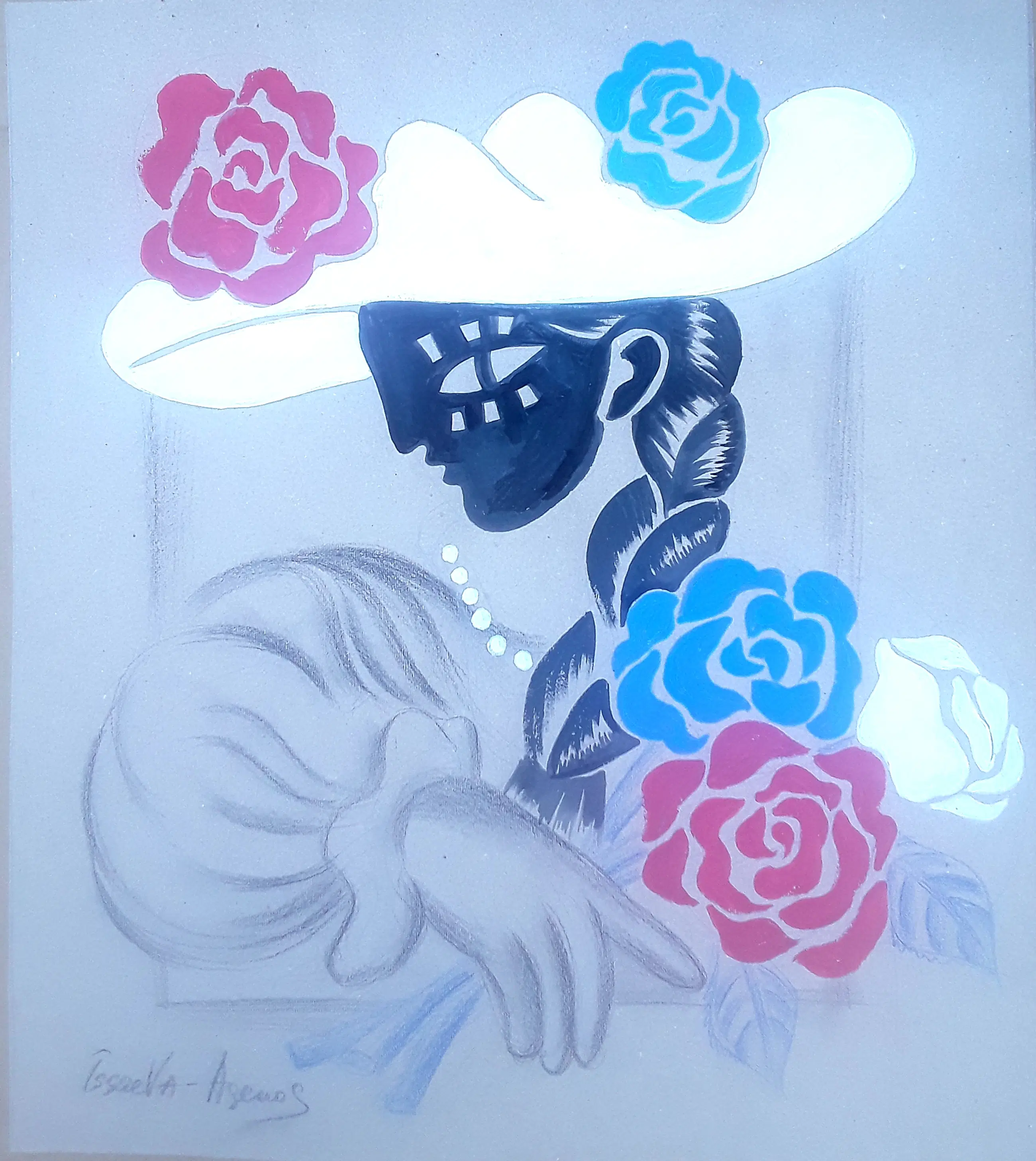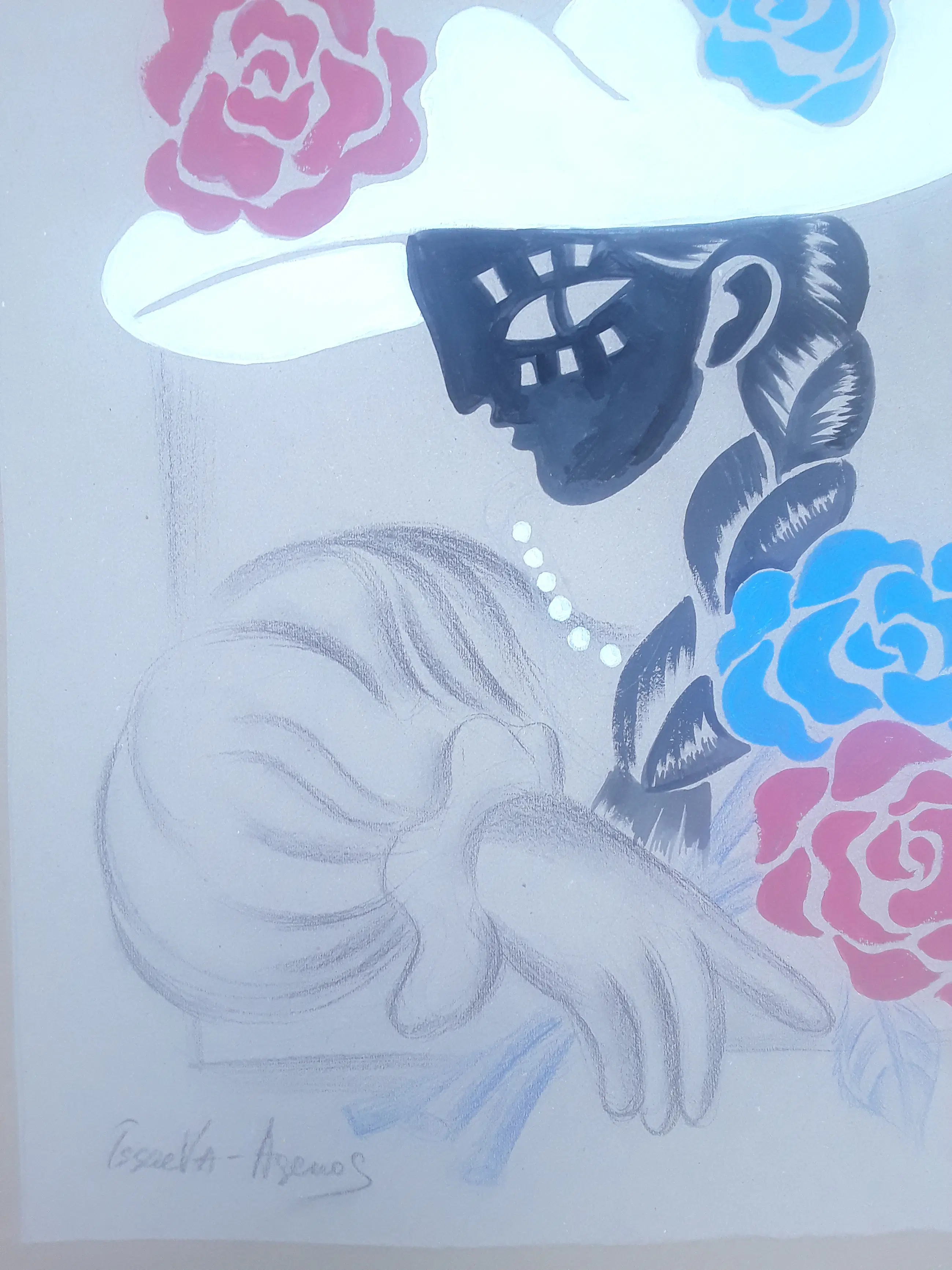 Entdecken Sie dieses außergewöhnliche Werk einer der herausragendsten Künstlerinnen Frankreichs. Diese prächtige Bleistift- und Acrylzeichnung auf grauem Papier, „Frau mit Rosen“, präsentiert Issaeva-Agenos Veronika als vielseitige Künstlerin, die sich in mehreren Disziplinen ausdrückt: Zeichnung, Design, Malerei, Dekoration und Textil.