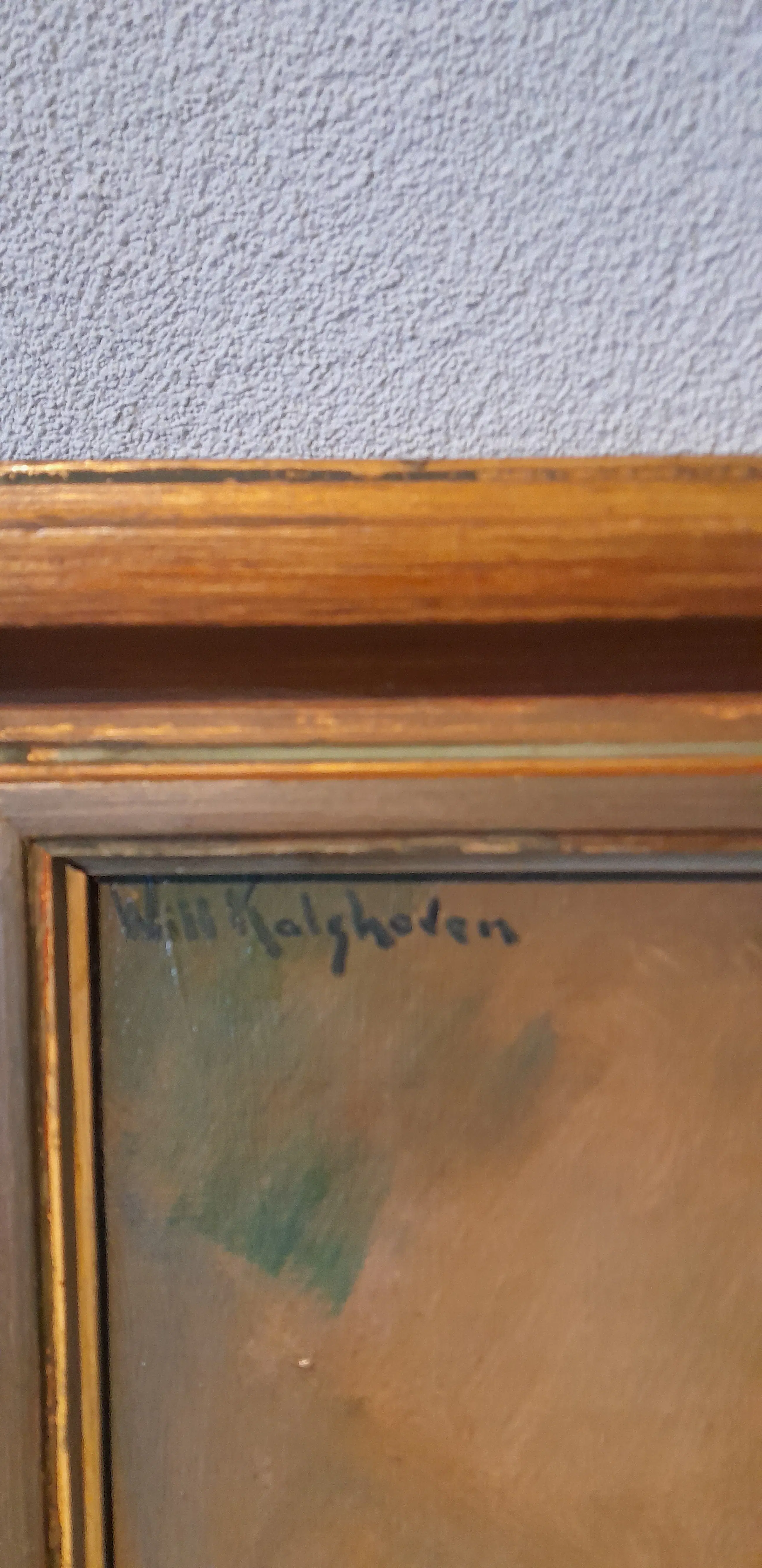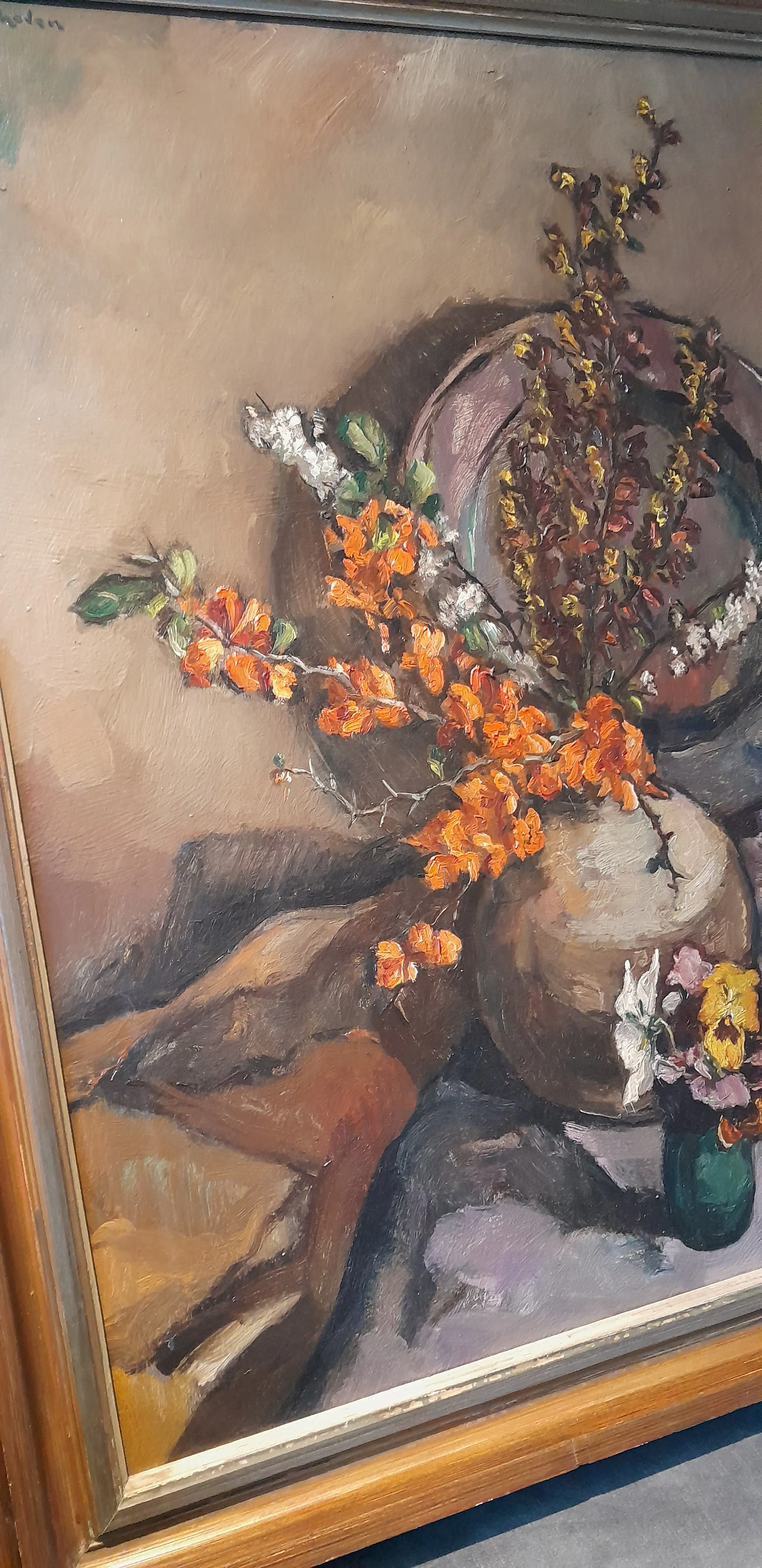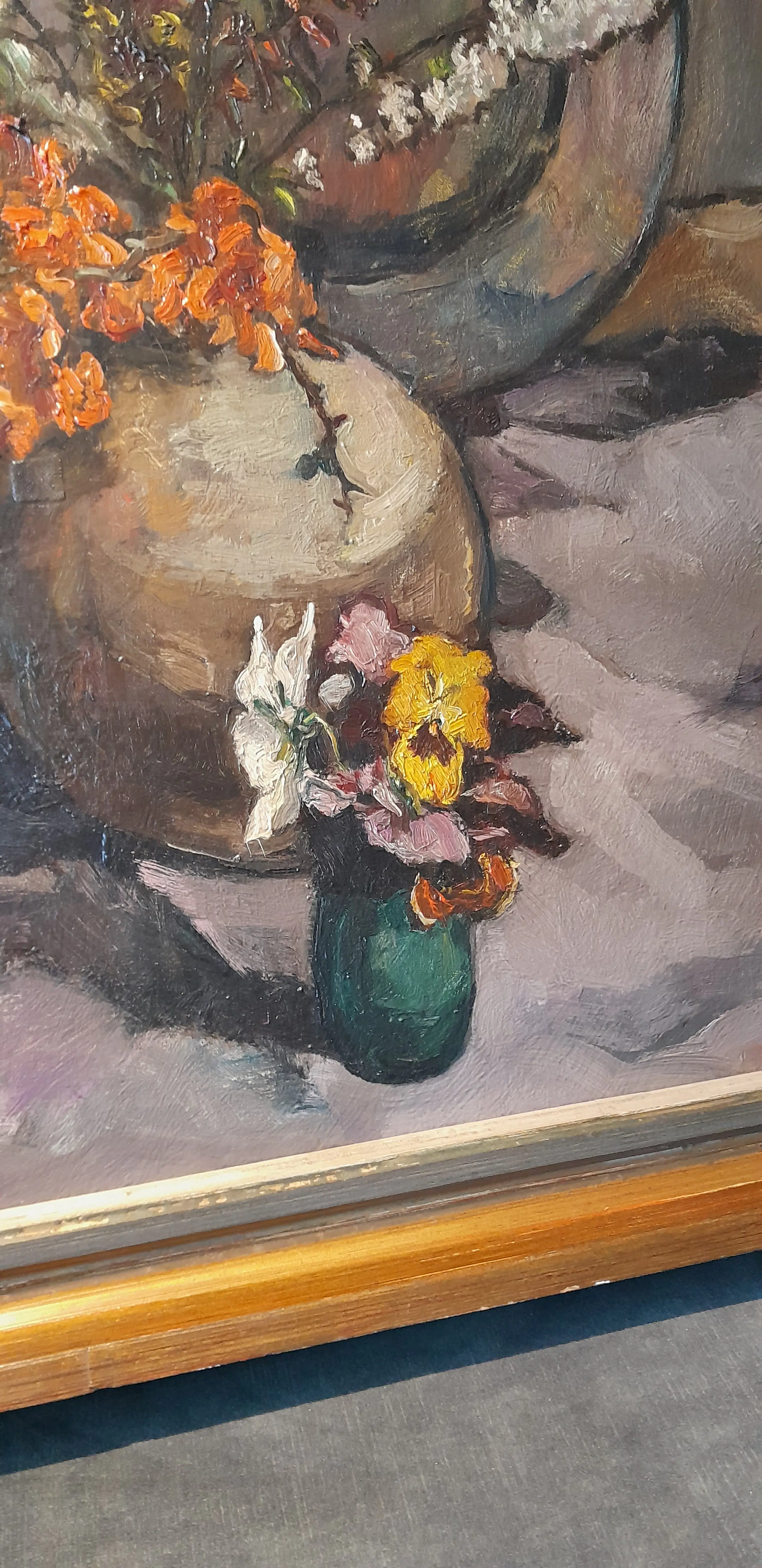 Große bunte Leinwand, auf der Rückseite betitelt: „Heestertakken en Violets, Will Kalshoven, Apeldoorn 1943“. Oben rechts auf der Vorderseite signiert „Will Kalshoven“.