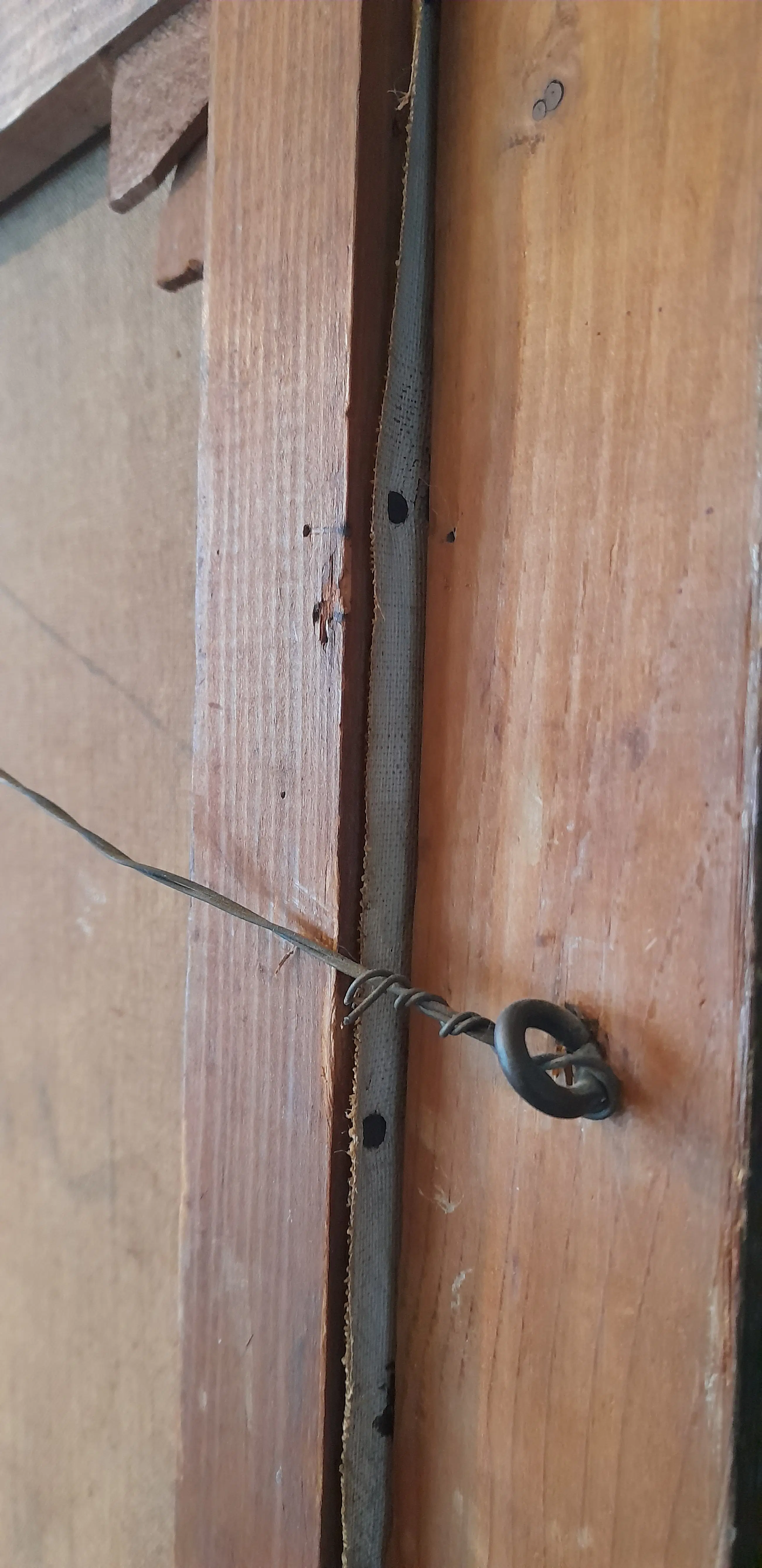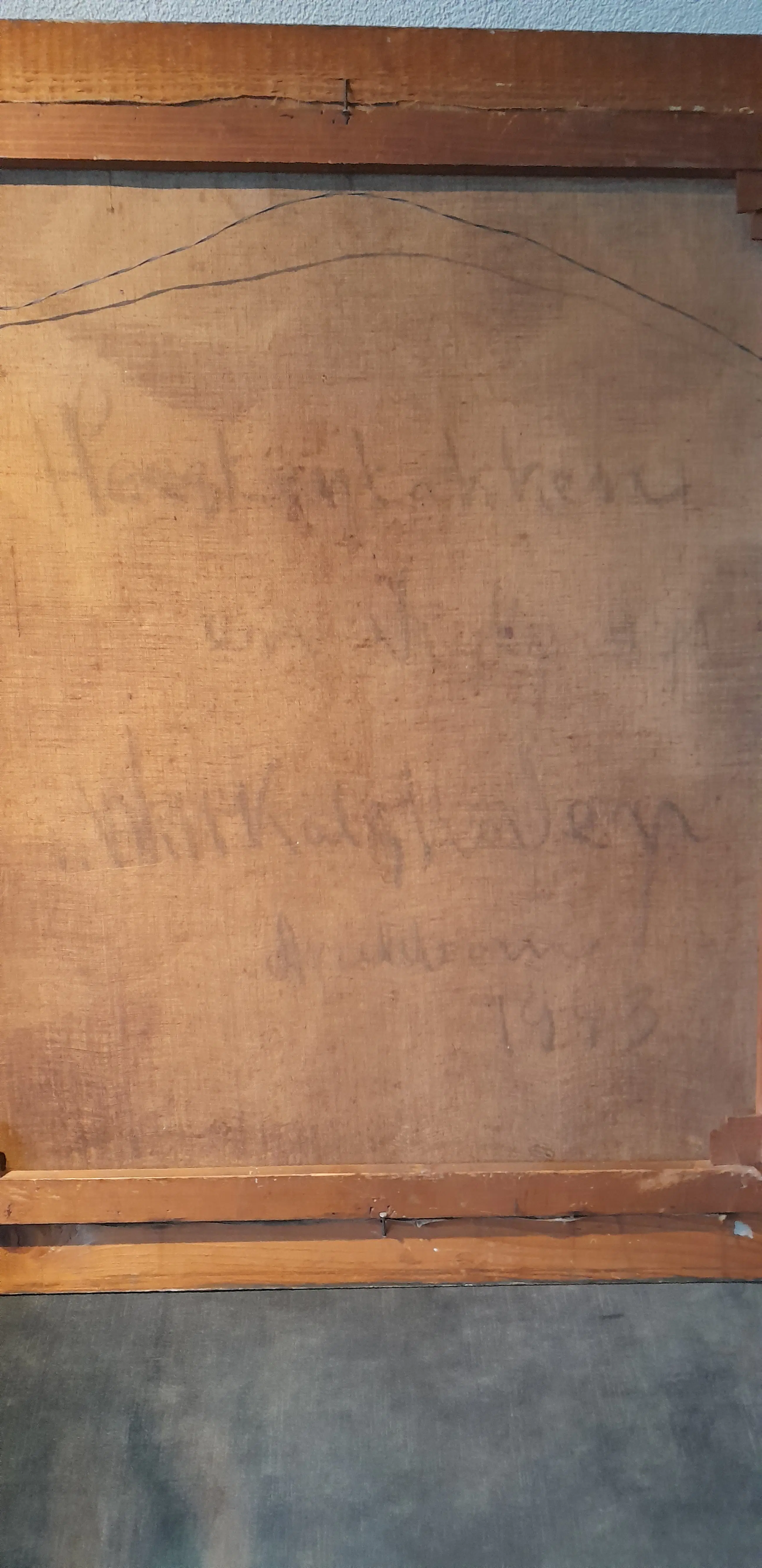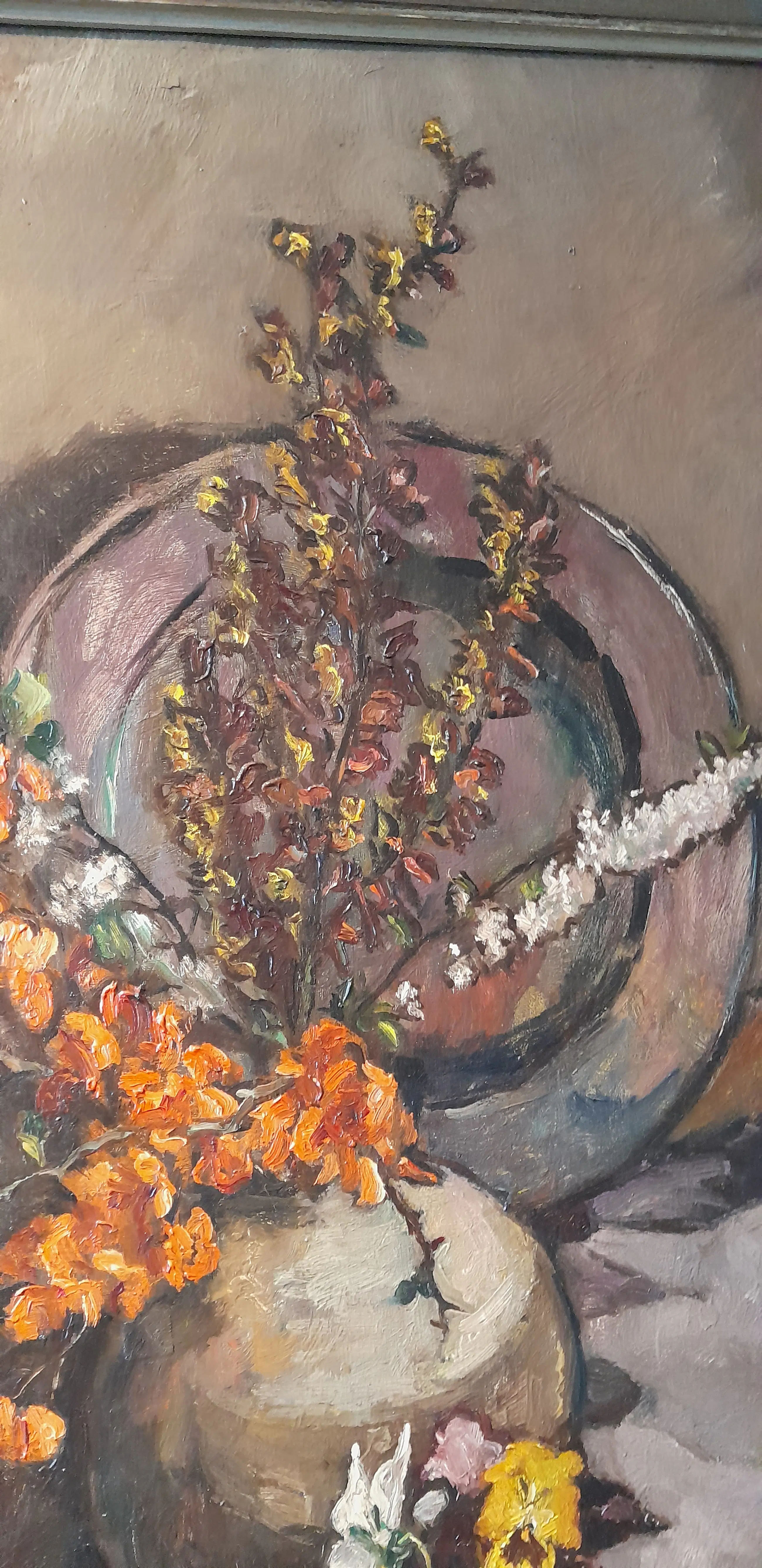 Große bunte Leinwand, auf der Rückseite betitelt: „Heestertakken en Violets, Will Kalshoven, Apeldoorn 1943“. Oben rechts auf der Vorderseite signiert „Will Kalshoven“.