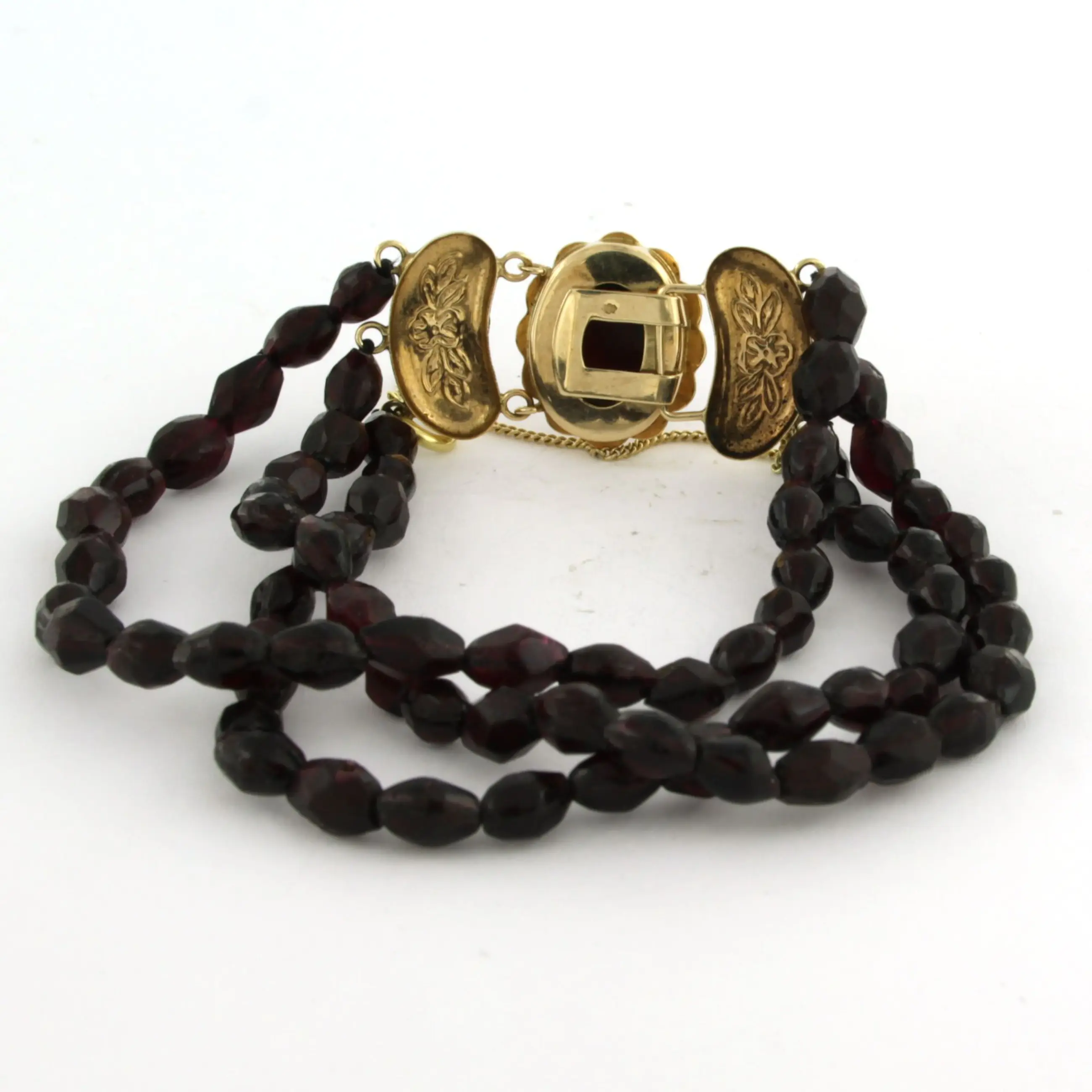 14k gold clasp set with garnet on a three-row garnet bracelet - 25.6 grams