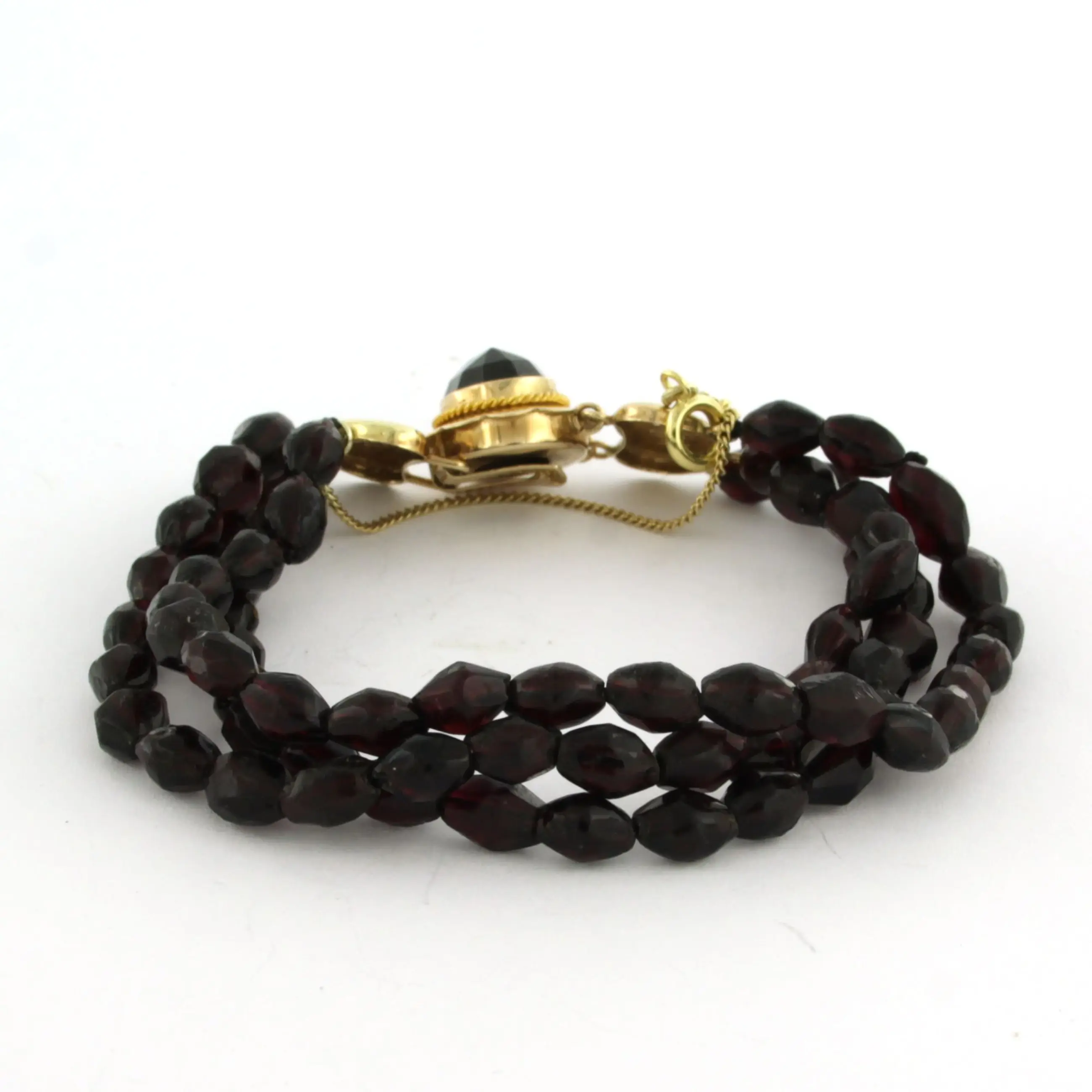 14k gold clasp set with garnet on a three-row garnet bracelet - 25.6 grams - 18 cm long