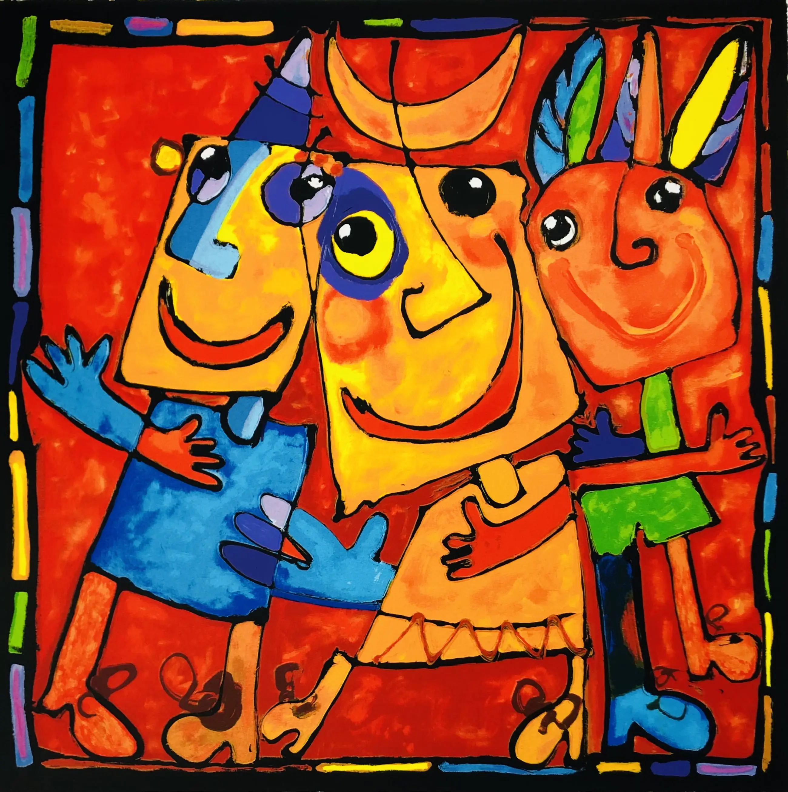 Cheerful abstract screen print by Ad Verstijnen with three Indians in a frame with a passe-partout.