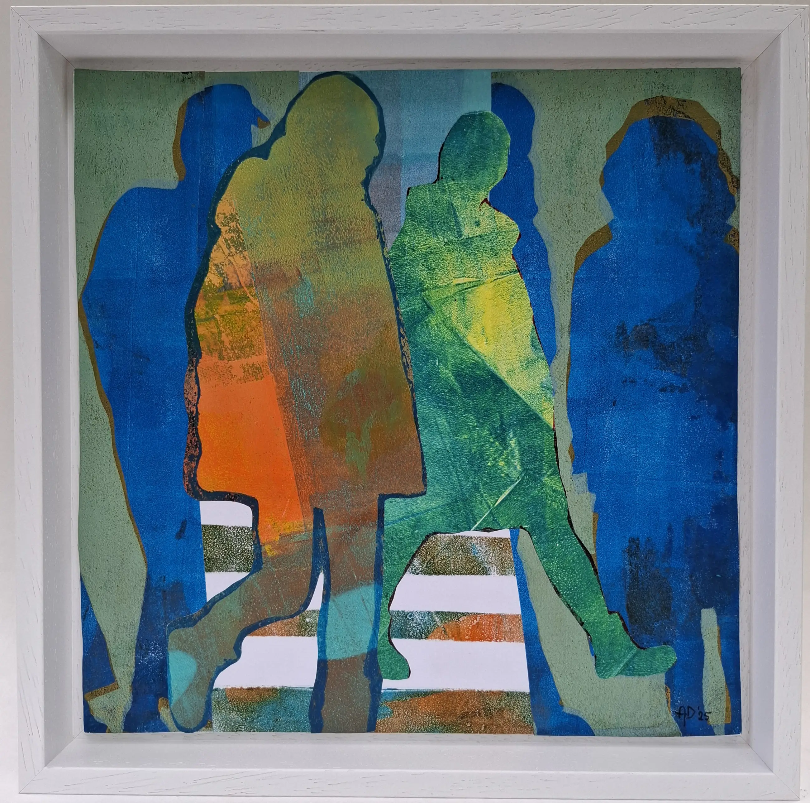 Mixed media painting with hand-printed collage material on canvas board in a white wooden frame